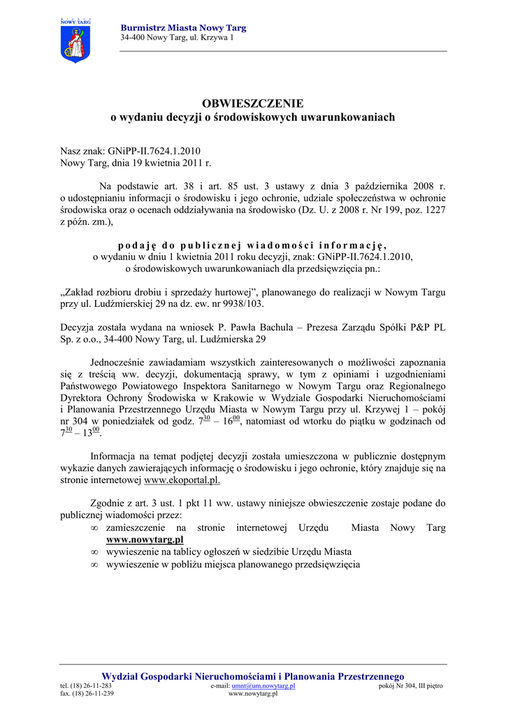 Burmistrz Miasta Nowy Targ 34-400 Nowy Targ, ul. Krzywa 1 OBWIESZCZENIE o wydaniu decyzji o środowiskowych uwarunkowaniach Nasz znak: GNiPP-II.7624.1.2010 Nowy Targ, dnia 19 kwietnia 2011 r. Na podstawie art. 38 i art. 85 ust. 3 ustawy z dnia 3 października 2008 r. o udostępnianiu informacji o środowisku i jego ochronie, udziale społeczeństwa w ochronie środowiska oraz o ocenach oddziaływania na środowisko (Dz. U. z 2008 r. Nr 199, poz. 1227 z późn. zm.), podaję do publicznej wiadomości informację, o wydaniu w dniu 1 kwietnia 2011 roku decyzji, znak: GNiPP-II.7624.1.2010, o środowiskowych uwarunkowaniach dla przedsięwzięcia pn.: „Zakład rozbioru drobiu i sprzedaży hurtowej”, planowanego do realizacji w Nowym Targu przy ul. Ludźmierskiej 29 na dz. ew. nr 9938/103. Decyzja została wydana na wniosek P. Pawła Bachula – Prezesa Zarządu Spółki P&P PL Sp. z o.o., 34-400 Nowy Targ, ul. Ludźmierska 29 Jednocześnie zawiadamiam wszystkich zainteresowanych o możliwości zapoznania się z treścią ww. decyzji, dokumentacją sprawy, w tym z opiniami i uzgodnieniami Państwowego Powiatowego Inspektora Sanitarnego w Nowym Targu oraz Regionalnego Dyrektora Ochrony Środowiska w Krakowie w Wydziale Gospodarki Nieruchomościami i Planowania Przestrzennego Urzędu Miasta w Nowym Targu przy ul. Krzywej 1 – pokój nr 304 w poniedziałek od godz. 730 – 1600, natomiast od wtorku do piątku w godzinach od 730 – 1300. Informacja na temat podjętej decyzji została umieszczona w publicznie dostępnym wykazie danych zawierających informację o środowisku i jego ochronie, który znajduje się na stronie internetowej www.ekoportal.pl. Zgodnie z art. 3 ust. 1 pkt 11 ww. ustawy niniejsze obwieszczenie zostaje podane do publicznej wiadomości przez: • zamieszczenie na stronie internetowej Urzędu Miasta Nowy Targ www.nowytarg.pl • wywieszenie na tablicy ogłoszeń w siedzibie Urzędu Miasta • wywieszenie w pobliżu miejsca planowanego przedsięwzięcia Wydział Gospodarki Nieruchomościami i Planowania Przestrzennego tel. (18) 26-11-283 fax. (18) 26-11-239 e-mail: [email protected] www.nowytarg.pl pokój Nr 304, III piętro
