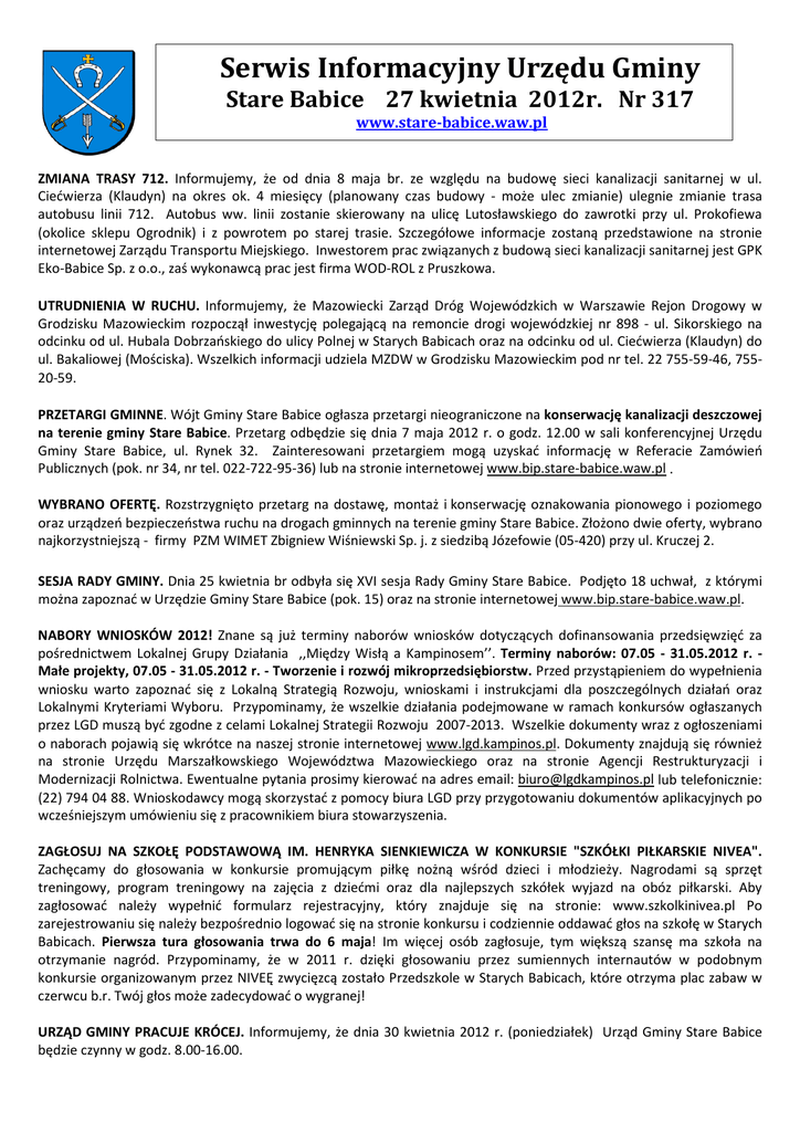 Serwis Informacyjny Urzędu Gminy Stare Babice 27 kwietnia 2012r. Nr 317 www.stare-babice.waw.pl ZMIANA TRASY 712. Informujemy, że od dnia 8 maja br. ze względu na budowę sieci kanalizacji sanitarnej w ul. Ciećwierza (Klaudyn) na okres ok. 4 miesięcy (planowany czas budowy - może ulec zmianie) ulegnie zmianie trasa autobusu linii 712. Autobus ww. linii zostanie skierowany na ulicę Lutosławskiego do zawrotki przy ul. Prokofiewa (okolice sklepu Ogrodnik) i z powrotem po starej trasie. Szczegółowe informacje zostaną przedstawione na stronie internetowej Zarządu Transportu Miejskiego. Inwestorem prac związanych z budową sieci kanalizacji sanitarnej jest GPK Eko-Babice Sp. z o.o., zaś wykonawcą prac jest firma WOD-ROL z Pruszkowa. UTRUDNIENIA W RUCHU. Informujemy, że Mazowiecki Zarząd Dróg Wojewódzkich w Warszawie Rejon Drogowy w Grodzisku Mazowieckim rozpoczął inwestycję polegającą na remoncie drogi wojewódzkiej nr 898 - ul. Sikorskiego na odcinku od ul. Hubala Dobrzańskiego do ulicy Polnej w Starych Babicach oraz na odcinku od ul. Ciećwierza (Klaudyn) do ul. Bakaliowej (Mościska). Wszelkich informacji udziela MZDW w Grodzisku Mazowieckim pod nr tel. 22 755-59-46, 75520-59. PRZETARGI GMINNE. Wójt Gminy Stare Babice ogłasza przetargi nieograniczone na konserwację kanalizacji deszczowej na terenie gminy Stare Babice. Przetarg odbędzie się dnia 7 maja 2012 r. o godz. 12.00 w sali konferencyjnej Urzędu Gminy Stare Babice, ul. Rynek 32. Zainteresowani przetargiem mogą uzyskać informację w Referacie Zamówień Publicznych (pok. nr 34, nr tel. 022-722-95-36) lub na stronie internetowej www.bip.stare-babice.waw.pl . WYBRANO OFERTĘ. Rozstrzygnięto przetarg na dostawę, montaż i konserwację oznakowania pionowego i poziomego oraz urządzeń bezpieczeństwa ruchu na drogach gminnych na terenie gminy Stare Babice. Złożono dwie oferty, wybrano najkorzystniejszą - firmy PZM WIMET Zbigniew Wiśniewski Sp. j. z siedzibą Józefowie (05-420) przy ul. Kruczej 2. SESJA RADY GMINY. Dnia 25 kwietnia br odbyła się XVI sesja Rady Gminy Stare Babice. Podjęto 18 uchwał, z którymi można zapoznać w Urzędzie Gminy Stare Babice (pok. 15) oraz na stronie internetowej www.bip.stare-babice.waw.pl. NABORY WNIOSKÓW 2012! Znane są już terminy naborów wniosków dotyczących dofinansowania przedsięwzięć za pośrednictwem Lokalnej Grupy Działania ,,Między Wisłą a Kampinosem’’. Terminy naborów: 07.05 - 31.05.2012 r. Małe projekty, 07.05 - 31.05.2012 r. - Tworzenie i rozwój mikroprzedsiębiorstw. Przed przystąpieniem do wypełnienia wniosku warto zapoznać się z Lokalną Strategią Rozwoju, wnioskami i instrukcjami dla poszczególnych działań oraz Lokalnymi Kryteriami Wyboru. Przypominamy, że wszelkie działania podejmowane w ramach konkursów ogłaszanych przez LGD muszą być zgodne z celami Lokalnej Strategii Rozwoju 2007-2013. Wszelkie dokumenty wraz z ogłoszeniami o naborach pojawią się wkrótce na naszej stronie internetowej www.lgd.kampinos.pl. Dokumenty znajdują się również na stronie Urzędu Marszałkowskiego Województwa Mazowieckiego oraz na stronie Agencji Restrukturyzacji i Modernizacji Rolnictwa. Ewentualne pytania prosimy kierować na adres email: [email protected] lub telefonicznie: (22) 794 04 88. Wnioskodawcy mogą skorzystać z pomocy biura LGD przy przygotowaniu dokumentów aplikacyjnych po wcześniejszym umówieniu się z pracownikiem biura stowarzyszenia. ZAGŁOSUJ NA SZKOŁĘ PODSTAWOWĄ IM. HENRYKA SIENKIEWICZA W KONKURSIE "SZKÓŁKI PIŁKARSKIE NIVEA". Zachęcamy do głosowania w konkursie promującym piłkę nożną wśród dzieci i młodzieży. Nagrodami są sprzęt treningowy, program treningowy na zajęcia z dziećmi oraz dla najlepszych szkółek wyjazd na obóz piłkarski. Aby zagłosować należy wypełnić formularz rejestracyjny, który znajduje się na stronie: www.szkolkinivea.pl Po zarejestrowaniu się należy bezpośrednio logować się na stronie konkursu i codziennie oddawać głos na szkołę w Starych Babicach. Pierwsza tura głosowania trwa do 6 maja! Im więcej osób zagłosuje, tym większą szansę ma szkoła na otrzymanie nagród. Przypominamy, że w 2011 r. dzięki głosowaniu przez sumiennych internautów w podobnym konkursie organizowanym przez NIVEĘ zwycięzcą zostało Przedszkole w Starych Babicach, które otrzyma plac zabaw w czerwcu b.r. Twój głos może zadecydować o wygranej! URZĄD GMINY PRACUJE KRÓCEJ. Informujemy, że dnia 30 kwietnia 2012 r. (poniedziałek) Urząd Gminy Stare Babice będzie czynny w godz. 8.00-16.00.