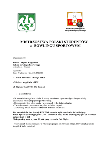 MISTRZOSTWA POLSKI STUDENTÓW w BOWLINGU SPORTOWYM Organizatorzy: Polski Związek Kręglarski Sekcja Bowlingu Sportowego ul. Zeylanda 5 Poznań organizator Piotr Ryglowski ( tel. 606430771) - Termin zawodów: 13 maja 2012r - Miejsce: kręgielnia NIKU ul. Piątkowska 200 61-693 Poznań 1. Uczestnictwo - W zawodach mogą brać udział drużyny 3-osobowe reprezentujące daną uczelnię, posiadające ważną legitymacje studencką. - Dopuszczalny jest także udział w zawodach tylko indywidualny - Turniej zostanie przeprowadzony bez podziału na płeć. - Zawodnicy muszą posiadać aktualne badania lekarskie. Dla zawodników bez licencji PZK SBS zostanie wyliczony hndc do każdej gry. Hndc wylicza się następująco: (180 – średnia) x 80% hndc zaokrąglany jest do wartości całkowitych w dół. Maksymalny hndc wynosi 20 pkt, przy czym dla Pań 30pkt. - w zawodach można korzystać z własnego sprzętu, jak również z tego, który znajduje się na kręgielni( kule, buty itp.) - Zgłoszenia do zawodów przyjmowane są pocztą elektroniczną, do dnia 10maja 2012r pod adresem: [email protected] , lub na [email protected] W zgłoszeniu należy też podać skład pary, w której chcemy grać. - Koszt udziału w zawodach wynosi 150 zł od drużyny. Indywidualnie - 50zł ( kwota ta w całości jest przeznaczona na wynajem obiektu, obsługę oraz nagrody), 2. System rozgrywek. * Eliminacje - drużyny rozegrają po 4 gry, na uprzednio wylosowanych torach ( z zachowaniem zasady zmienności torów). - do rundy finałowej awansuje 8 zespołów, które uzyskały najwyższą sumę pkt( wraz z handicapem) - w przypadku remisu na którejkolwiek pozycji, o miejscu decyduje wyższa ostatnia gra drużyny, do skutku.. *1 Runda Play-Off( 1gra) - w fazie finałowej Play-off zespoły rozegrają pojedynki wg. schematu 1 zespół po eliminacjach vs. 8 zespół po eliminacjach A. 2 zespół po eliminacjach vs. 7 zespół po eliminacjach B. 3 zespół po eliminacjach vs. 6 zespół po eliminacjach C. 4 zespół po eliminacjach vs. 5 zespoł po eliminacjach D. do półfinałów awansują zwycięzcy pojedynków. W przypadku remisu o zajętym miejscu zadecyduje pojedynek jednej kuli wybranego zawodnika z drużyny. *Półfinały(1 gra) Wygrani A vs. Wygrani D Wygrani C vs. Wygrani B Do Finału awansują zwycięzcy pojedynków półfinałowych, przegrani zagrają mecz o 3 miejsce. W Finale decyduje suma 2 gier, w meczu o 3 miejsce 1 gra. W przypadku remisu o zajętym miejscu zadecyduje pojedynek jednej kuli wybranego zawodnika z drużyny. * Turniej indywidualny. Do rundy play-off klasyfikacji indywidualnej awansuje 14 najlepszych zawodników/zawodniczek, którzy zgromadzili indywidualnie najwięcej pkt w eliminacjach( wraz z handicapami) Rozegrają oni pojedynki wg. schematu: 1 Runda (1 gra): a) 3 z 14 b) 4 z 13 c) 5 z 12 d) 6 z 11 e) 7 z 10 f) 8 z 9 2 Runda (1 gra): g) 1. h) 2. i) Zwycięzca B j) Zwycięzca A - Zwycięzca F - Zwycięzca E - Zwycięzca C - Zwycięzca D Półfinały(1 gra): Zwycięzca G - Zwycięzca I Zwycięzca H - Zwycięzca J Wygrani pojedynków ½ zagrają w wielkim finale 2 gry, których suma wyłoni Zwycięzcę indywidualnego. 3 miejsce zajmie zawodnik, który uzyskał wyższy wynik w przegranym półfinale. W przypadku remisu, o zajętym miejscu zadecyduje pojedynek jednej kuli. * Turniej Par Do półfinałów zakwalifikują się po 4 pary( oraz miksty), które zgromadziły w sumie po eliminacjach najwięcej pkt bez handicapu! Rozegrają one pojedynki wg schematu 1z4, 2z3 i zwycięzcy pojedynków zagrają o 1miejsce. (półfinał i mecz o 3 miejsce- 1 gra, finał –suma 2 gier)/ UWAGA- aby została rozegrana konkurencja w danej kategorii par, na starcie musi stanąć minimum 10 par męskich/10 mikstów/8 par kobiecych. Pary nie muszą składać się z studentów tej samej uczelni. 3. Przepisy porządkowe. - Zawodnicy mają całkowity zakaz ingerowania w wynik gry poprzez jego zmianę na konsoli, usuwanie przeszkód technicznych, samowolne rozstrzyganie sytuacji spornych. W każdym z takich przypadków należy uprzednio powiadomić Sędziego. - przed pojedynkami finałowymi nastąpi również smarowanie torów. TERMINARZ 08:30 Konferencja techniczna i weryfikacja zgłoszeń, 09:00 Eliminacje (przed każdą turą smarowanie torów) Ok.12:00 (smarowanie torów) Pojedynki indywidualne 1 i 2 Runda 13:00 Półfinały par, następnie mikstów. 14:00 Play-off drużynowe( ¼ finału, oraz ½ finału) 15:00 (smarowanie torów) Finał Indywidualny, oraz mecz o 3 miejsce 15:40 Finały Par i Mikstów 16:30 Finał Drużynowy, oraz mecz o 3 miejsce ok.17:30 dekoracja zwycięzców i zakończenie zawodów. Zapraszamy serdecznie ! Nagrody: Drużyny z miejsc 1-3 otrzymują Puchary oraz medale Turniej Indywidualny: I miejsce- nagroda niespodzianka od firmy Sport Bowling Adam Błaszczak Turniej Par męskich: I miejsce- nagroda niespodzianka od firmy Bowling Sklep Michał Świerz Kategoria Drużynowa: I Miejsce- nagroda niespodzianka od firmy Bowling Strefa Łukasz Śnieżek II Miejsce- nagroda niespodzianka od firmy Bowling Strefa Łukasz Śnieżek III Miejsce- nagroda niespodzianka od firmy PinPro Dla najlepszej kobiety po eliminacjach- nagroda niespodzianka od firmy BowlingStrefa Łukasz Śnieżek Wzór zgłoszenia: ZGŁOSZENI E OSTATECZNE (do weryfikacji) Niku Poznań Mistrzostwa Polski Studentów Nazwa uczelni - zespołu Lp. Imię i nazwisko Rok studiów Numer indeksu Telefon kontaktowy (kapitana) Inne * Uwagi Komisji Weryfikacyjnej C L 1 2 3 Zatwierdzamy reprezentację Uczelni w podanym składzie i stwierdzamy, że ww. zawodnicy są uprawnieni do startu zgodnie z Regulaminem Zawodów Osoba zgłaszająca . B