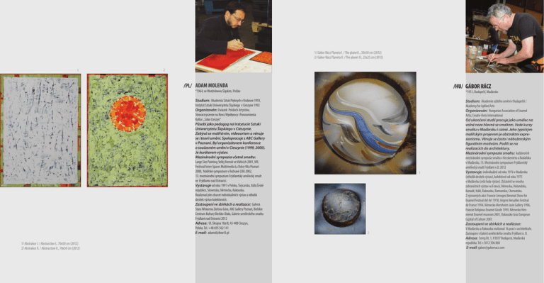 1/ Gábor Rácz Planeta I. / The planet I., 50x50 cm (2012) 2/ Gábor Rácz Planeta II. / The planet II., 25x25 cm (2012) 1 2 /PL/ ADAM MOLENDA /HU/ GÁBOR RÁCZ *1964, ve Wodzisławiu Śląskim, Polsko Studium: Akademia Sztuk Piẹknych v Krakowe 1993, Instytut Sztuki Uniwersytetu Śląskiego v Cieszyne 1992 Organizován: Zwiazek Polskich Artystów, Stowarzsyszenie na Rzecz Wpółpracy i Porozumienia Kultur „Salas Cieszyn“ Působí jako pedagog na Instytucie Sztuki Uniwersytetu Śląskiego v Cieszynie. Zabývá se malířstvím, videoartem a věnuje se i teorii umění. Spolupracuje s ABC Gallery v Poznani. Byl organizátorem konference o současném umění v Cieszynie (1999, 2000). Je kurátorem výstav. Mezinárodní sympozia včetně smaltu: Large Size Painting-Velký formát ve Valticích 2001, VIII. Festiwal Inner Spaces Multimedia La Dolce Vita Poznań 2000, Malířské sympozium v Rožnavě (SR) 2002, 13. mezinárodní sympozium Frýdlantský umělecký smalt ve Frýdlantu nad Ostravicí. Vystavuje od roku 1991 v Polsku, Švýcarsku, Itálii,České republice, Slovensku, Německu, Rakousku. Realizoval přes dvacet individuálních výstav a několik desítek výstav kolektivních. Zastoupení ve sbírkách a realizace: Galeria Stara Winiarnia Zielona Góra, ABC Gallery Poznań, Bielskie Centrum Kultury Bielsko-Biała, Galerie uměleckého smaltu Frýdlant nad Ostravicí 2012 Adresa: Ul. Skrajna 10a/8, 43-400 Cieszyn, Polsko, Tel. +48 695 562 141 E-mail: [email protected] 1/ Abstrakce I. / Abstraction I., 70x50 cm (2012) 2/ Abstrakce II. / Abstraction II., 70x50 cm (2012) *1951, Budapešť, Maďarsko 1 2 Studium: Akademie užitého umění v Budapešti / Akademy for Apllied Arts Organizován: Hungarian Association of Enamel Artis, Creativ-Kreis International Od ukončení studií pracuje jako umělec na volné noze hlavně se smaltem. Vede kurzy smaltu v Maďarsku i cizině. Jeho typickým malířským projevem je abstraktní expresionismu. Věnuje se často i náboženským figurálním motivům. Podílí se na realizacích do architektury. Mezinárodní sympozia smaltu: každoročně mezinárodní sympozia smaltu v Kecskemétu a Budafoku v Maďarsku, 13. Mezinárodní sympozium Frýdlantský umělecký smalt Frýdlant n.O. 2012 Vystavuje: individuálně od roku 1976 v Maďarsku (několik desítek výstav), kolektivně od roku 1975 v Maďarsku (celá řada výstav). Zúčastnil se mnoha zahraničních výstav ve Francii, Německu, Holandsku, Kanadě, Itálii, Rakousku, Rumunsku, Chorvatsku. Z významých akcí: Francie Limoges Biennial Show for Enamel Festival del Art 1978, Angres Versailles Festival de France 1994, Německo Merxheim Jasin Gallery 1996, Francie Religious Enamel Girafe 1999, Německo Himmerod Enamel museum 2001, Rakousko Graz European Capital of Culture 2003 Zastoupení ve sbírkách a realizace: V Maďarsku a Rakousku realizoval 16 prací v architektuře. Zastoupen v Galerii uměleckého smaltu Frýdlant n. O. Adresa: Sereg Ut. 1, H1037 Budapest, Maďarská republika. Tel.+3612 506 860 E-mail: [email protected]
