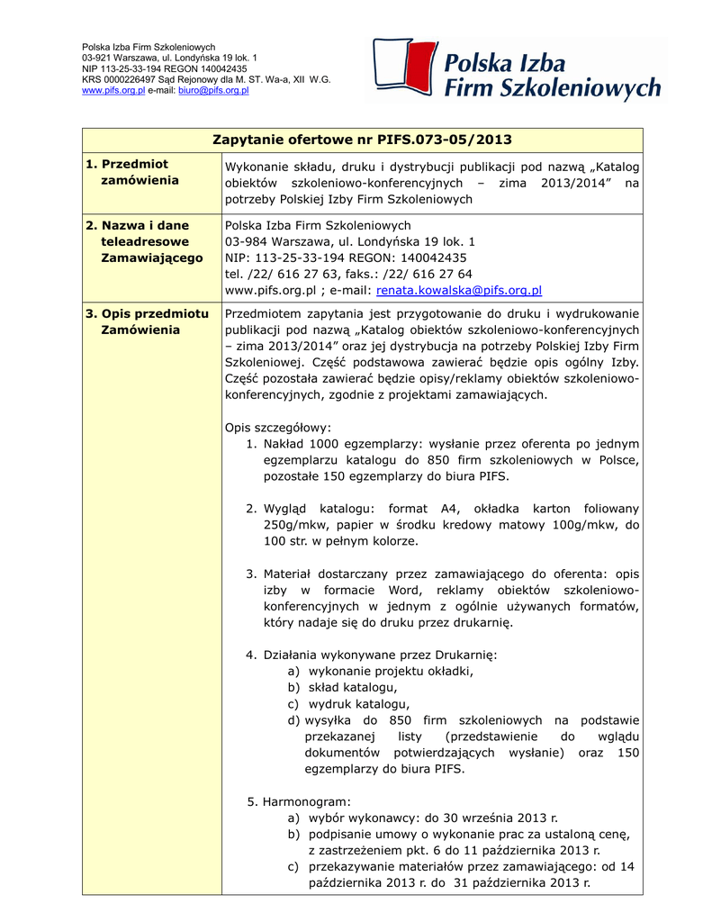 Polska Izba Firm Szkoleniowych 03-921 Warszawa, ul. Londyńska 19 lok. 1 NIP 113-25-33-194 REGON 140042435 KRS 0000226497 Sąd Rejonowy dla M. ST. Wa-a, XII W.G. www.pifs.org.pl e-mail: [email protected] Zapytanie ofertowe nr PIFS.073-05/2013 1. Przedmiot zamówienia Wykonanie składu, druku i dystrybucji publikacji pod nazwą „Katalog obiektów szkoleniowo-konferencyjnych – zima 2013/2014” na potrzeby Polskiej Izby Firm Szkoleniowych 2. Nazwa i dane teleadresowe Zamawiającego Polska Izba Firm Szkoleniowych 03-984 Warszawa, ul. Londyńska 19 lok. 1 NIP: 113-25-33-194 REGON: 140042435 tel. /22/ 616 27 63, faks.: /22/ 616 27 64 www.pifs.org.pl ; e-mail: [email protected] 3. Opis przedmiotu Zamówienia Przedmiotem zapytania jest przygotowanie do druku i wydrukowanie publikacji pod nazwą „Katalog obiektów szkoleniowo-konferencyjnych – zima 2013/2014” oraz jej dystrybucja na potrzeby Polskiej Izby Firm Szkoleniowej. Część podstawowa zawierać będzie opis ogólny Izby. Część pozostała zawierać będzie opisy/reklamy obiektów szkoleniowokonferencyjnych, zgodnie z projektami zamawiających. Opis szczegółowy: 1. Nakład 1000 egzemplarzy: wysłanie przez oferenta po jednym egzemplarzu katalogu do 850 firm szkoleniowych w Polsce, pozostałe 150 egzemplarzy do biura PIFS. 2. Wygląd katalogu: format A4, okładka karton foliowany 250g/mkw, papier w środku kredowy matowy 100g/mkw, do 100 str. w pełnym kolorze. 3. Materiał dostarczany przez zamawiającego do oferenta: opis izby w formacie Word, reklamy obiektów szkoleniowokonferencyjnych w jednym z ogólnie używanych formatów, który nadaje się do druku przez drukarnię. 4. Działania wykonywane przez Drukarnię: a) wykonanie projektu okładki, b) skład katalogu, c) wydruk katalogu, d) wysyłka do 850 firm szkoleniowych na podstawie przekazanej listy (przedstawienie do wglądu dokumentów potwierdzających wysłanie) oraz 150 egzemplarzy do biura PIFS. 5. Harmonogram: a) wybór wykonawcy: do 30 września 2013 r. b) podpisanie umowy o wykonanie prac za ustaloną cenę, z zastrzeżeniem pkt. 6 do 11 października 2013 r. c) przekazywanie materiałów przez zamawiającego: od 14 października 2013 r. do 31 października 2013 r. d) wydruk: do 22 listopada 2013 r. e) wysłanie katalogu: do 29 listopada 2013 r. 6. W przypadku braku wymaganej ilości reklamodawców (min. 40 str. A4) katalog nie zostanie wydrukowany. 4. Wymogi stawiane Oferta musi obowiązkowo zawierać cenę netto i brutto, pełne dane oferentom teleadresowe oferenta, jego NIP i REGON. Oferta musi zawierać pełne podsumowanie kosztów netto i brutto w rozbiciu na różne wysokości podatku VAT. Oferta musi zawierać 4 opcje reklamodawców): 1) Katalog do 50 stron 2) Katalog od 51 do 65 stron 3) Katalog od 66 do 80 stron 4) Katalog od 91 do 105 stron 5. Kryteria wyboru oferty ceny (w zależności od ilości Cena wykonania usługi – 100% 6. Forma, termin i Oferty zawierające cenę i podsumowanie kosztów netto i brutto oraz miejsce składania pełne dane oferenta wymienione w pkt. 4 można składać w formie oferty papierowej na adres podany w pkt. 2 lub elektronicznie na adres email: [email protected] w terminie do 27 września 2013 roku do godz. 16:00. Informacji dodatkowych udziela Asystent Zarządu – Renata Kowalska [email protected] tel. kom. 0 605 390 599 7. Miejscowość i data: Warszawa, dnia 19.09.2013 r.