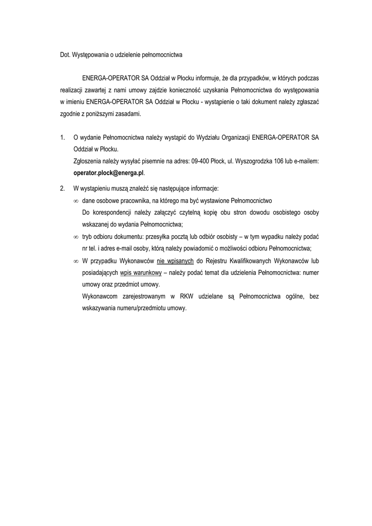 Dot. Występowania o udzielenie pełnomocnictwa ENERGA-OPERATOR SA Oddział w Płocku informuje, że dla przypadków, w których podczas realizacji zawartej z nami umowy zajdzie konieczność uzyskania Pełnomocnictwa do występowania w imieniu ENERGA-OPERATOR SA Oddział w Płocku - wystąpienie o taki dokument należy zgłaszać zgodnie z poniższymi zasadami. 1. O wydanie Pełnomocnictwa należy wystąpić do Wydziału Organizacji ENERGA-OPERATOR SA Oddział w Płocku. Zgłoszenia należy wysyłać pisemnie na adres: 09-400 Płock, ul. Wyszogrodzka 106 lub e-mailem: [email protected]. 2. W wystąpieniu muszą znaleźć się następujące informacje: • dane osobowe pracownika, na którego ma być wystawione Pełnomocnictwo Do korespondencji należy załączyć czytelną kopię obu stron dowodu osobistego osoby wskazanej do wydania Pełnomocnictwa; • tryb odbioru dokumentu: przesyłka pocztą lub odbiór osobisty – w tym wypadku należy podać nr tel. i adres e-mail osoby, którą należy powiadomić o możliwości odbioru Pełnomocnictwa; • W przypadku Wykonawców nie wpisanych do Rejestru Kwalifikowanych Wykonawców lub posiadających wpis warunkowy – należy podać temat dla udzielenia Pełnomocnictwa: numer umowy oraz przedmiot umowy. Wykonawcom zarejestrowanym w RKW udzielane są Pełnomocnictwa ogólne, bez wskazywania numeru/przedmiotu umowy.