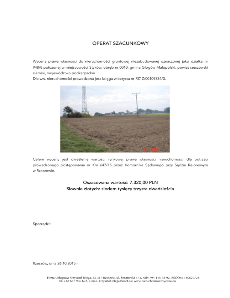 OPERAT SZACUNKOWY Wycena prawa własności do nieruchomości gruntowej niezabudowanej oznaczonej jako działka nr 948/8 położonej w miejscowości Styków, obręb nr 0010, gmina Głogów Małopolski, powiat rzeszowski ziemski, województwo podkarpackie. Dla ww. nieruchomości prowadzona jest księga wieczysta nr RZ1Z/00109334/0. Celem wyceny jest określenie wartości rynkowej prawa własności nieruchomości dla potrzeb prowadzonego postępowania nr Km 647/15 przez Komornika Sądowego przy Sądzie Rejonowym w Rzeszowie. Oszacowana wartość: 7.320,00 PLN Słownie złotych: siedem tysięcy trzysta dwadzieścia Sporządził: Rzeszów, dnia 26.10.2015 r. Firma Usługowa Krzysztof Telega, 35-317 Rzeszów, ul. Senatorska 173, NIP: 794-115-38-92, REGON: 180620728 tel. +48 667 976 672, e-mail. [email protected]; www.nieruchomosciwycena.eu &2 WYCIĄG Z OPERATU SZACUNKOWEGO NIERUCHOMOŚCI 1. Cel wyceny Sprzedaż nieruchomości Zastaw bankowy - Opłaty za użytkowanie - Zastaw hipoteczny - - wieczyste lub trwały zarząd Nieruchomość - Inny cel X reprezentatywna dla PTN 2. Położenie nieruchomości Gmina (miasto) Obręb ewidencyjny: 0010 Styków Nr działki (n-ry grupy działek): 948/8 Głogów - Styków powierzchnia łączna 0,3800 ha Małopolski 3. Opis nieruchomości Nr działki 948/8 Rodzaj Funkcja dominująca Uzbrojenie działki Nieruchomości wg miejsc. Planu 1 – niezabudowana zagospodarow. Wartość gruntu 1 – Sieć wodociągowa, 7.320,00 PLN nieruchomość rolna 2 – Lokalne ujęcie jednoużytkowa, 2 – niezabudowana wody, 3 – Sieć nieruchomość rolna elektroenergetyczna wieloużytkowa, 230V, 3 – nieruchomość 4 – Sieć leśna, 4 – zabudowana elektroenergetyczna 400V, nieruchomość rolna, 5 – Sieć ciepłownicza, 5 – niezabudowana 6 – Sieć gazowa, nieruchomość 7 – Kanalizacja przeznaczona pod zabudowę inną niż sanitarna sieciowa, 8 – Kanalizacja zagrodowa, sanitarna lokalna, 6 – nieruchomość 9 – Sieć telefoniczna, zabudowana 10 – TV kablowa, budynkami mieszkalnymi, 11 – Kanalizacja burzowa, 7 – nieruchomość zabudowana budynkami pełniącymi inne funkcje niż zagrodowa i mieszkaniowa Firma Usługowa Krzysztof Telega, 35-317 Rzeszów, ul. Senatorska 173, NIP: 794-115-38-92, REGON: 180620728 tel. +48 667 976 672, e-mail. [email protected]; www.nieruchomosciwycena.eu &3 4. Opis budynków/lokalu Nr ewidencyjny budynku Funkcja Podstawowa Funkcja drugorzędna Uzbrojenie 1 – Mieszkalne, 1 – Sieć wodociągowa, 2 – Przemysłowe, 2 – Lokalne ujęcie 3 – Transportu i wody, łączności, 4 – Handlowo- 3 – Sieć elektroenergetyczna usługowe, 230V, 5 – Zbiorniki, silosy i 4 – Sieć budynki magazynowe, elektroenergetyczna 6 – Biurowe, 7 – Szpitali i zakładów 400V, 5 – Sieć ciepłownicza, opieki medycznej, 6 – Sieć gazowa, 8 – Oświaty, nauki i 7 – Kanalizacja kultury oraz budynki sanitarna sieciowa, sportowe, 9 – Produkcyjne, 8 – Kanalizacja sanitarna lokalna, usługowe i 9 – Sieć telefoniczna, gospodarcze dla 10 – TV kablowa, rolnictwa, 11 – Kanalizacja 10 – inne niemieszkalne burzowa, Wartość nieruchomości Wartość nieruchomości: 7.320,00 PLN (słownie złotych: siedem tysięcy trzysta dwadzieścia). Data: 26.10.2015 r. Podpis: …………..………………………… Firma Usługowa Krzysztof Telega, 35-317 Rzeszów, ul. Senatorska 173, NIP: 794-115-38-92, REGON: 180620728 tel. +48 667 976 672, e-mail. [email protected]; www.nieruchomosciwycena.eu &4 Spis treści 1. Przedmiot i zakres wyceny. .................................................................................................................5 2. Cel wyceny. ..........................................................................................................................................5 3. Podstawy formalne i materialne wyceny............................................................................................ 5 3.1. Podstawa formalna. ..........................................................................................................................5 3.2. Podstawy prawne. ............................................................................................................................5 3.3. Podstawy metodologiczne. .............................................................................................................5 4. Źródła danych merytorycznych (materiały źródłowe). ......................................................................5 5. Daty istotne dla czynności rzeczoznawcy majątkowego. .................................................................6 6. Opis i określenie stanu przedmiotu wyceny. .....................................................................................6 6.1. Stan prawny. ......................................................................................................................................6 6.2. Stan otoczenia nieruchomości. .......................................................................................................7 6.3. Stan nieruchomości – działki gruntu. ..............................................................................................7 7. Przeznaczenie w Miejscowym Planie Zagospodarowania Przestrzennego. ...................................8 8. Analiza i charakterystyka rynku nieruchomości. ................................................................................8 9. Wskazanie rodzaju określanej wartości..............................................................................................9 10. Wybór podejścia i metody wyceny. .................................................................................................9 11. Dane z rynku nieruchomości. .........................................................................................................11 12. Określenie wpływu czasu na zmianę cen...........................................................................