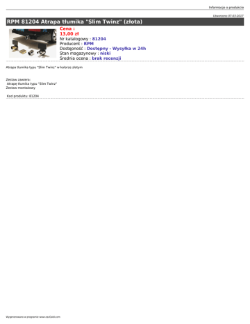 Informacje o produkcie Utworzono 07-03-2017 RPM 81204 Atrapa tłumika "Slim Twinz" (złota) Cena : 13,00 zł Nr katalogowy : 81204 Producent : RPM Dostępność : Dostępny - Wysyłka w 24h Stan magazynowy : niski Średnia ocena : brak recenzji Atrapa tłumika typu "Slim Twinz" w kolorze złotym Zestaw zawiera: Atrapę tłumika typu "Slim Twinz" Zestaw montażowy Kod produktu: 81204 Wygenerowano w programie www.oscGold.com
