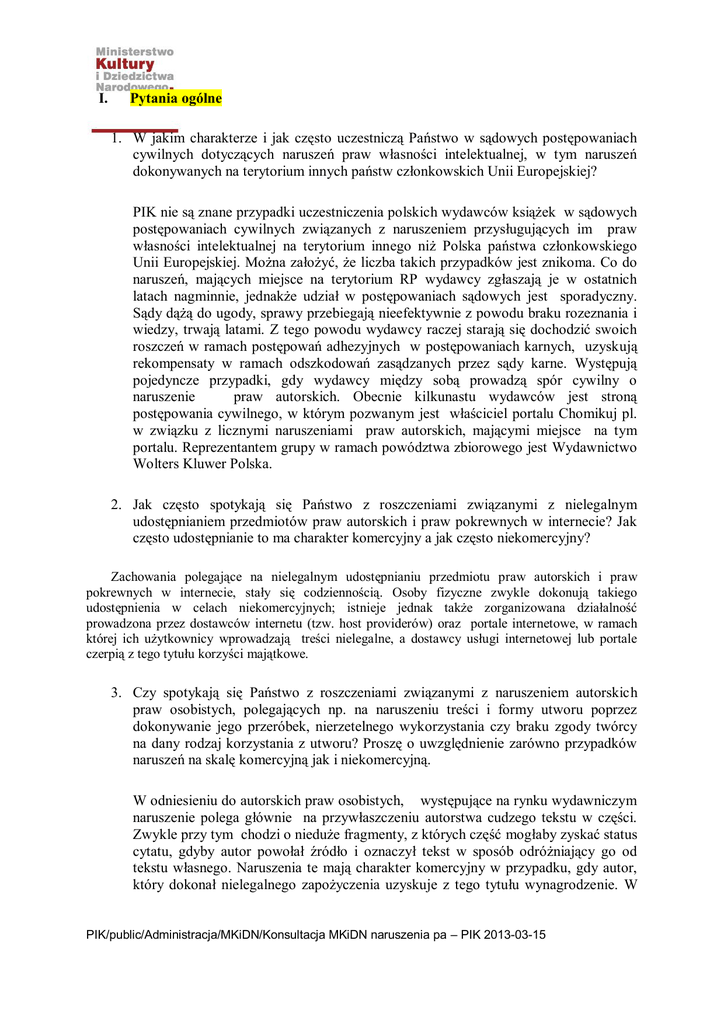 I. Pytania ogólne 1. W jakim charakterze i jak często uczestniczą Państwo w sądowych postępowaniach cywilnych dotyczących naruszeń praw własności intelektualnej, w tym naruszeń dokonywanych na terytorium innych państw członkowskich Unii Europejskiej? PIK nie są znane przypadki uczestniczenia polskich wydawców książek w sądowych postępowaniach cywilnych związanych z naruszeniem przysługujących im praw własności intelektualnej na terytorium innego niż Polska państwa członkowskiego Unii Europejskiej. Można założyć, że liczba takich przypadków jest znikoma. Co do naruszeń, mających miejsce na terytorium RP wydawcy zgłaszają je w ostatnich latach nagminnie, jednakże udział w postępowaniach sądowych jest sporadyczny. Sądy dążą do ugody, sprawy przebiegają nieefektywnie z powodu braku rozeznania i wiedzy, trwają latami. Z tego powodu wydawcy raczej starają się dochodzić swoich roszczeń w ramach postępowań adhezyjnych w postępowaniach karnych, uzyskują rekompensaty w ramach odszkodowań zasądzanych przez sądy karne. Występują pojedyncze przypadki, gdy wydawcy między sobą prowadzą spór cywilny o naruszenie praw autorskich. Obecnie kilkunastu wydawców jest stroną postępowania cywilnego, w którym pozwanym jest właściciel portalu Chomikuj pl. w związku z licznymi naruszeniami praw autorskich, mającymi miejsce na tym portalu. Reprezentantem grupy w ramach powództwa zbiorowego jest Wydawnictwo Wolters Kluwer Polska. 2. Jak często spotykają się Państwo z roszczeniami związanymi z nielegalnym udostępnianiem przedmiotów praw autorskich i praw pokrewnych w internecie? Jak często udostępnianie to ma charakter komercyjny a jak często niekomercyjny? Zachowania polegające na nielegalnym udostępnianiu przedmiotu praw autorskich i praw pokrewnych w internecie, stały się codziennością. Osoby fizyczne zwykle dokonują takiego udostępnienia w celach niekomercyjnych; istnieje jednak także zorganizowana działalność prowadzona przez dostawców internetu (tzw. host providerów) oraz portale internetowe, w ramach której ich użytkownicy wprowadzają treści nielegalne, a dostawcy usługi internetowej lub portale czerpią z tego tytułu korzyści majątkowe. 3. Czy spotykają się Państwo z roszczeniami związanymi z naruszeniem autorskich praw osobistych, polegających np. na naruszeniu treści i formy utworu poprzez dokonywanie jego przeróbek, nierzetelnego wykorzystania czy braku zgody twórcy na dany rodzaj korzystania z utworu? Proszę o uwzględnienie zarówno przypadków naruszeń na skalę komercyjną jak i niekomercyjną. W odniesieniu do autorskich praw osobistych, występujące na rynku wydawniczym naruszenie polega głównie na przywłaszczeniu autorstwa cudzego tekstu w części. Zwykle przy tym chodzi o nieduże fragmenty, z których część mogłaby zyskać status cytatu, gdyby autor powołał źródło i oznaczył tekst w sposób odróżniający go od tekstu własnego. Naruszenia te mają charakter komercyjny w przypadku, gdy autor, który dokonał nielegalnego zapożyczenia uzyskuje z tego tytułu wynagrodzenie. W PIK/public/Administracja/MKiDN/Konsultacja MKiDN naruszenia pa – PIK 2013-03-15 ostatnich latach wzrosła liczba takich sporów, przy czym mnożą się przypadki nadużywania nieuzasadnionych roszczeń w celu uzyskania rekompensaty. Mamy wskazania na pojedyncze przypadki naruszania prawa do integralności utworu, np. w związku z wprowadzeniem go do bazy informacji prawnej i poddaniu wymogom narzuconym przez funkcjonalności tego programu. 7. Jak oceniają Państwo system egzekwowania praw własności intelektualnej w Polsce, w szczególności na drodze cywilnoprawnej? Jakie czynniki zachęcają do korzystania z tej drogi dochodzenia roszczeń a jakie stanowią w tym zakresie barierę? System egzekwowania praw własności intelektualnej w Polsce na drodze cywilnoprawnej jest niewydolny. Procesy trwają bardzo długo, odnosi się wrażenie odwlekania przez sędziów prowadzących tego typu postępowania spraw w czasie. Podstawowym problemem wedle naszej oceny jest brak wyspecjalizowanych w sprawach z zakresu prawa autorskiego i praw pokrewnych sędziów. Sędziowie, którzy nigdy lub sporadycznie mieli kontakt z prawem autorskim, nie są często w stanie przyswoić sobie tej specjalistycznej wiedzy. Kolejną barierę, zwłaszcza w sprawach naruszenia praw do programów komputerowych czy systemów informacji prawnej, tworzy notoryczny brak biegłych o określonych kwalifikacjach lub niskie kwalifikacje biegłych wpisanych na listy. Jedynym zachęcającym czynnikiem dochodzenia roszczeń na drodze cywilnoprawnej jest naszym zdaniem niemożność załatwienia sprawy na drodze polubownej (pozasądowo) oraz świadomość, że zgłaszane roszczenia na drodze karnej są przez sądy umarzane z ww powodów. 8. Co jest najbardziej kosztownym elementem postępowań cywilnych w sprawach o naruszenia praw własności intelektualnej? Dostrzegamy tu trzy podstawowe czynniki kosztotwórcze: - opłaty sądowe , - koszty zastępstwa procesowego zwłaszcza w sytuacji przedłużających się spraw, odraczanych na długie terminy; - koszty biegłych, jeżeli wnioski z opinii biegłego zostały dopuszczone. - koszty zgromadzenia materiału dowodowego, który w znanych wydawcom przypadkach musi być bardzo szczegółowy i brak jest jednolitych kryteriów jakim taki materiał dowodowy musiałby podlegać 9. Jak oceniają Państwo przygotowanie polskich sądów do rozpoznawania spraw dotyczących naruszeń praw własności intelektualnej? Czy – z punktu widzenia Państwa praktyki – orzecznictwo sądów jest jednolite czy też występują w nim rozbieżności? Jakiego rodzaju są to rozbieżności (w miarę możliwości proszę o podanie przykładów) i czym mogą one być spowodowane? Dotychczasowe obserwacje i uzyskane informacje od członków Izby prowadzą do wniosku, że sądy nie są przygotowane do rozpatrywania