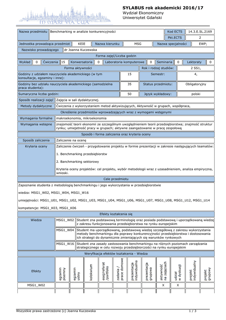 SYLABUS rok akademicki 2016/17 Wydział Ekonomiczny Uniwersytet Gdański Nazwa przedmiotu Benchmarking w analizie konkurencyjności Jednostka prowadząca przedmiot Nazwisko prowadzącego KEIE Nazwa kierunku MSG Kod ECTS 14.3.E.SL.2169 Pkt.ECTS 2 Nazwa specjalności EWP; dr Joanna Kuczewska Forma zajęć/Liczba godzin Wykład 0 Ćwiczenia 15 Konwersatoria 0 Laboratoria komputerowe Forma aktywności 0 Seminaria 0 Lektoraty Rok i rodzaj studiów: 2 SS1, Godziny z udziałem nauczyciela akademickiego (w tym konsultacje, egzaminy i inne): 15 Semestr: 4, Godziny bez udziału nauczyciela akademickiego (samodzielna praca studenta): 35 Status przedmiotu: Obligatoryjny Sumaryczna liczba godzin: 50 Język wykładowy: polski 0 Sposób realizacji zajęć Zajęcia w sali dydaktycznej. Metody dydaktyczne Ćwiczenia z wykorzystaniem metod aktywizujących, Aktywność w grupach, współpraca, Określenie przedmiotów wprowadzających wraz z wymogami wstępnymi Wymagania formalne makroekonomia, mikroekonomia Wymagania wstepne znajomość teorii ekonomii ze szczególnym uwzględnieniem teorii przedsiębiorstwa; znajmość struktur rynku; umiejetność pracy w grupach; aktywne zaangażowanie w pracę zespołową Sposób i forma zaliczenia oraz kryteria oceny Sposób zaliczenia Kryteria oceny Zaliczenie na ocenę Zaliczenie ćwiczeń - przygotowanie projektu w formie prezentacji w zakresie następujących teamatów: 1. Benchmarking przedsiębiorstw 2. Banchmarking sektorowy Kryteria oceny projektów: cel projektu, wybór metodologii wraz z uzasadnieniem, analiza empiryczna, wnioski. Cele przedmiotu Zapoznanie studenta z metodologią benchmarkingu i jego wykorzystania w przedsiębiorstwie wiedza: MSG1_W02, MSG1_W04, MSG1_W16 umiejętności: MSG1_U01, MSG1_U02, MSG1_U03, MSG1_U04, MSG1_U06, MSG1_U07, MSG1_U08, MSG1_U12, MSG1_U14 kompetencje: MSG1_K03, MSG1_K06 Efekty kształcenia się Wiedza MSG1_W02 Student zna podstawową terminologię oraz posiada podstawową i uporządkowaną wiedzę z zakresu funkcjonowania przedsiębiorstwa na rynku europejskim MSG1_W04 Student ma uporządkowaną, podstawową wiedzę szczegółową z zakresu wykorzystania metody benchmarkingu dla poprawy konkurencyjności przedsiębiorstwa i dostosowania ich strategii do dynamicznie zmieniających się warunków rynkowych MSG1_W16 Student zna zasady zastosowania benchmarkingu na różnych poziomach zarządzania strategicznego w celu rozwoju przedsiębiorczości na rynku europejskim Weryfikacja efektów kształcenia - Wiedza Efekty MSG1_W02 Wszystkie prawa zastrzeżone (c) Joanna Kuczewska X X 1/3 SYLABUS rok akademicki 2016/17 Wydział Ekonomiczny Uniwersytet Gdański MSG1_W04 X X MSG1_W16 X X Umiejętności X MSG1_U01 Student potrafi prawidłowo interpretować zjawiska ekonomiczne, właściwie analizować przyczyny i przebieg procesów gospodarczych wpływających na konkurencyjność przedsiębiorstw MSG1_U02 Student potrafi wykorzystać wiedzę z zakresu konkurencyjności przedsiębiorstwa w odniesieniu do funkcjonowania podmiotów gospodarczych na rynku międzynarodowym, ze szczególnym uwzględnieniem rynku Unii Europejskiej MSG1_U03 Student potrafi interpretować podstawowe problemy i procesy współczesnej gospodarki światowej, ich przyczyny i przebieg MSG1_U04 Student potrafi dokonywać obserwacji i analiz podstawowych procesów gospodarczych, potrafi interpretować dane statystyczne oraz wskaźniki ekonomiczne niezbędne w opracowaniu metodologii benchmarkingu MSG1_U06 Student umie wykorzystywać wiedzę z zakresu wykorzystania benchmarkingu w pracy zawodowej MSG1_U07 Student potrafi identyfikować i analizować relacje występujące między podmiotami gospodarczymi a innymi instytucjami w celu doboru benchmarks w analizie sektorowej MSG1_U08 Student potrafi dokonywać wybory alternatywnych rozwiązań strategicznych dla przedsiębiorstwa z wykorzystaniem metod i narzędzi pozwalających na wybór optymalnego scenariusza MSG1_U12 Student potrafi wykorzystać zasady benchmarkingu na różnych poziomach zarządzania strategicznego w celu rozwoju przedsiębiorczości na rynku europejskim MSG1_U14 Student posiada umiejętność przygotowania metodologii benchmarkingu na poziomie przedsiębiorstwa oraz sektora Weryfikacja efektów kształcenia - Umiejętności Efekty MSG1_U01 X X MSG1_U02 X X MSG1_U03 X X MSG1_U04 X X MSG1_U06 X X X MSG1_U07 X X X MSG1_U08 X X MSG1_U12 X X MSG1_U14 X X Kompetencje MSG1_K03 Umiejętność pracy w grupie; wspólne analizowanie problemu i delegowanie uprawnień w zespole; umiejętności analizowania i wyboru czynników istotnych dla poprawy konkurencyjności przedsiębiorstwa MSG1_K06 Student potrafi myśleć i działać w sposób przedsiębiorczy Weryfikacja efektów kształcenia - Kompetencje Efekty MSG1_K03 Wszystkie prawa zastrzeżone (c) Joanna Kuczewska X X 2/3 SYLABUS rok akademicki 2016/17 Wydział Ekonomiczny Uniwersytet Gdański MSG1_K06 X X Treści programowe Temat 1. Metodologia procesu benchmarkingu Definicja benchmarkingu, benchmarking a analiza pozycji konkurencyjnej, typy benchmarkingu, modele benchmarkingu, fazy wdrażania procesu benchmarkingu Temat 2 Korzyści i pułapki wdrażania procesu benchmarkingu Identyfikacja korzyści wykorzystania najlepszej praktyki w dążeniu do doskonałości biznesu, identyfikacja i eliminacja pułapek benchmarkingu Temat 3 Europejska procedura benchmarkingu Metodologia europejskiej procedur benchmarkingu - benchmarking przedsiębiorstw, sektorów, warunków ramowych oraz instytucji publicznych, miejsce benchmarkingu w europejskiej polityce jakości i wspierania konkurencyjności Temat 4 Benchmarking przedsiębiorstw Pogramy i działania wspólnotowe; inicjatywy krajów członkowskich - program Promoting Business Excellence (PROBE) oraz The Benchmark Index Temat 5 Benchmarking sektorów, warunków ramowych i instytucji publicznych Programy i inicjatywy wspólnotowe w zakresie benchmarkingu warunków ramowych, sektorów oraz instytucji sektora publiczneg