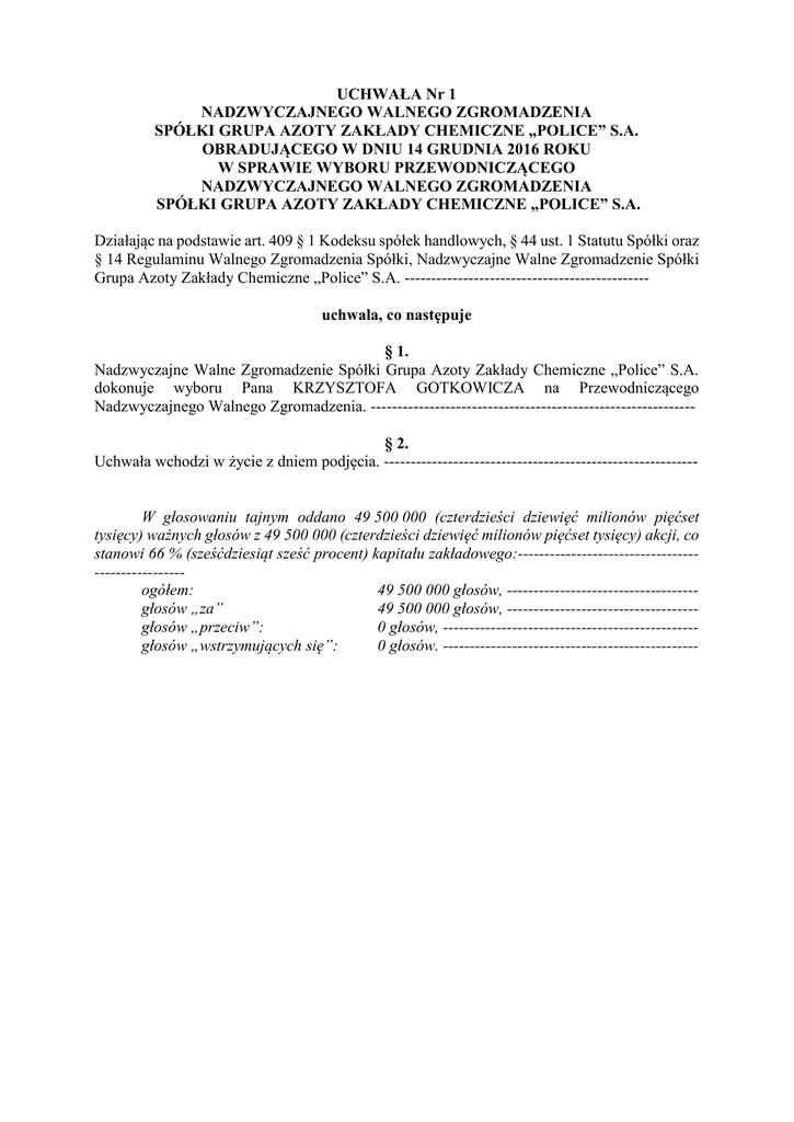 UCHWAŁA Nr 1 NADZWYCZAJNEGO WALNEGO ZGROMADZENIA SPÓŁKI GRUPA AZOTY ZAKŁADY CHEMICZNE „POLICE” S.A. OBRADUJĄCEGO W DNIU 14 GRUDNIA 2016 ROKU W SPRAWIE WYBORU PRZEWODNICZĄCEGO NADZWYCZAJNEGO WALNEGO ZGROMADZENIA SPÓŁKI GRUPA AZOTY ZAKŁADY CHEMICZNE „POLICE” S.A. Działając na podstawie art. 409 § 1 Kodeksu spółek handlowych, § 44 ust. 1 Statutu Spółki oraz § 14 Regulaminu Walnego Zgromadzenia Spółki, Nadzwyczajne Walne Zgromadzenie Spółki Grupa Azoty Zakłady Chemiczne „Police” S.A. ---------------------------------------------uchwala, co następuje § 1. Nadzwyczajne Walne Zgromadzenie Spółki Grupa Azoty Zakłady Chemiczne „Police” S.A. dokonuje wyboru Pana KRZYSZTOFA GOTKOWICZA na Przewodniczącego Nadzwyczajnego Walnego Zgromadzenia. ------------------------------------------------------------§ 2. Uchwała wchodzi w życie z dniem podjęcia. ----------------------------------------------------------W głosowaniu tajnym oddano 49 500 000 (czterdzieści dziewięć milionów pięćset tysięcy) ważnych głosów z 49 500 000 (czterdzieści dziewięć milionów pięćset tysięcy) akcji, co stanowi 66 % (sześćdziesiąt sześć procent) kapitału zakładowego:-------------------------------------------------ogółem: 49 500 000 głosów, -----------------------------------głosów „za” 49 500 000 głosów, -----------------------------------głosów „przeciw”: 0 głosów, -----------------------------------------------głosów „wstrzymujących się”: 0 głosów. ------------------------------------------------ 2 UCHWAŁA Nr 2 NADZWYCZAJNEGO WALNEGO ZGROMADZENIA SPÓŁKI GRUPA AZOTY ZAKŁADY CHEMICZNE „POLICE” S.A. OBRADUJĄCEGO W DNIU 14 GRUDNIA 2016 ROKU W SPRAWIE PRZYJĘCIA PORZĄDKU OBRAD Działając na podstawie § 20 ust. 1 Regulaminu Walnego Zgromadzenia Spółki, Nadzwyczajne Walne Zgromadzenie Spółki Grupa Azoty Zakłady Chemiczne „Police” S.A. uchwala, co następuje § 1. Nadzwyczajne Walne Zgromadzenie Spółki Grupa Azoty Zakłady Chemiczne „Police” S.A. przyjmuje następujący porządek obrad: ----------------------------------------------------------------1. Otwarcie Nadzwyczajnego Walnego Zgromadzenia i wybór Przewodniczącego. -----------2. Stwierdzenie prawidłowości zwołania Nadzwyczajnego Walnego Zgromadzenia i jego zdolności do podejmowania uchwał. ---------------------------------------------------------------3. Przyjęcie porządku obrad. ----------------------------------------------------------------------------4. Wybór Komisji Skrutacyjnej. ------------------------------------------------------------------------5. Podjęcie uchwały w sprawie powołania Członka Rady Nadzorczej Grupy Azoty Zakłady Chemiczne „Police” S.A. ----------------------------------------------------------------------------6. Zamknięcie obrad. ------------------------------------------------------------------------------------§ 2. Uchwała wchodzi w życie z dniem podjęcia. ----------------------------------------------------------W głosowaniu jawnym oddano 49 500 000 (czterdzieści dziewięć milionów pięćset tysięcy) ważnych głosów z 49 500 000 (czterdzieści dziewięć milionów pięćset tysięcy) akcji, co stanowi 66 % (sześćdziesiąt sześć procent) kapitału zakładowego:-------------------------------------------------ogółem: 49 500 000 głosów, -----------------------------------głosów „za” 49 500 000 głosów, -----------------------------------głosów „przeciw”: 0 głosów, -----------------------------------------------głosów „wstrzymujących się”: 0 głosów. -----------------------------------------------Przewodniczący stwierdził, że powyższa uchwała została przyjęta jednogłośnie. ------- 3 UCHWAŁA Nr 3 NADZWYCZAJNEGO WALNEGO ZGROMADZENIA SPÓŁKI GRUPA AZOTY ZAKŁADY CHEMICZNE „POLICE” S.A. OBRADUJĄCEGO W DNIU 14 GRUDNIA 2016 ROKU W SPRAWIE POWOŁANIA CZŁONKA RADY NADZORCZEJ GRUPY AZOTY ZAKŁADY CHEMICZNE „POLICE” S.A. Działając na podstawie art. 385 § 1 i 2 Kodeksu spółek handlowych w związku z § 34 Statutu Spółki, Nadzwyczajne Walne Zgromadzenie spółki Grupa Azoty Zakłady Chemiczne „Police” S.A. -----------------------------------------------------------------------------------------------uchwala, co następuje § 1. Nadzwyczajne Walne Zgromadzenie spółki Grupa Azoty Zakłady Chemiczne „Police” S.A. powołuje do składu Rady Nadzorczej Grupy Azoty Zakłady Chemiczne „Police” S.A. na VII wspólną kadencję, której koniec upływa z dniem odbycia Zwyczajnego Walnego Zgromadzenia spółki Grupa Azoty Zakłady Chemiczne „Police” S.A. zatwierdzającego sprawozdanie finansowe za rok obrotowy 2018, Panią Marię Więcek (PESEL: 61042606308) jako członka Rady Nadzorczej wybieranego przez pracowników Spółki, w trybie § 34Statutu Spółki oraz § 25 ust. 1 „Regulaminu wyboru i odwołania przez pracowników członków Rady Nadzorczej spółki Grupa Azoty Zakłady Chemiczne „Police” S.A.”. ------------------------------§ 2. Uchwała wchodzi w życie z dniem podjęcia. ----------------------------------------------------------W głosowaniu tajnym oddano 49 500 000 (czterdzieści dziewięć milionów pięćset tysięcy) ważnych głosów z 49 500 000 (czterdzieści dziewięć milionów pięćset tysięcy) akcji, co stanowi 66 % (sześćdziesiąt sześć procent) kapitału zakładowego:-------------------------------------------------ogółem: 49 500 000 głosów, -----------------------------------głosów „za” 49 500 000 głosów, -----------------------------------głosów „przeciw”: 0 głosów, -----------------------------------------------głosów „wstrzymujących się”: 0 głosów. -----------------------------------------------Przewodniczący stwierdził, że powyższa uchwała została przyjęta jednogłośnie. -------