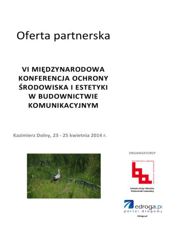 Oferta partnerska VI MIĘDZYNARODOWA KONFERENCJA OCHRONY ŚRODOWISKA I ESTETYKI W BUDOWNICTWIE KOMUNIKACYJNYM Kazimierz Dolny, 23 - 25 kwietnia 2014 r. ORGANIZATORZY Katedra Dróg i Mostów Politechniki Lubelskiej Edroga.pl Politechnika Lubelska oraz Edroga.pl, zapraszają do współpracy podczas VI Międzynarodowej Konferencji Ochrony Środowiska i Estetyki w Budownictwie Komunikacyjnym. Konferencja odbędzie się w dniach 23 - 25 kwietnia 2014 r. w Kazimierzu Dolnym, w „Zajeździe Piastowskim”. Konferencja odbywa się w szczególnym czasie, w którym trwają przygotowania do realizacji nowych zadań inwestycyjnych w zakresie budownictwa komunikacyjnego, zarówno w Polsce jak i w innych krajach Europy. Celem Konferencji jest podsumowanie dotychczasowych doświadczeń i wypracowanie nowych założeń związanych z ochroną środowiska, estetyką oraz nowoczesnych i innowacyjnych rozwiązań w budownictwie komunikacyjnym dla nowego okresu przebudowy i rozbudowy sieci komunikacyjnej. Podczas Konferencji zostaną poruszone następujące zagadnienia: 1. Zrównoważone budownictwo komunikacyjne. 2. Metody prognozowania oddziaływań inwestycji i obiektów komunikacyjnych na środowisko. 3. Estetyka i walory krajobrazu na wszystkich etapach przygotowania, realizacji i eksploatacji urządzeń budownictwa komunikacyjnego. 4. Rola planowania przestrzennego w budownictwie komunikacyjnym. 5. Ochrona środowiska przyrodniczego w procesie przygotowania, realizacji i utrzymania inwestycji oraz obiektów budownictwa komunikacyjnego. 6. Problemy opracowań środowiskowych wykonywanych w budownictwie komunikacyjnym. 7. Innowacyjne materiały, technologie, procesy w budownictwie komunikacyjnym. 8. Wykorzystanie materiałów odpadowych w budownictwie komunikacyjnym. 9. Ekonomia rozwiązań ochrony środowiska w budownictwie komunikacyjnym. ORGANIZATORZY Katedra Dróg i Mostów Politechniki Lubelskiej Edroga.pl Zagadnienia te będą dyskutowane w gronie: przedstawicieli resortu transportu i środowiska, przedstawicieli administracji rządowej i samorządowej, zarządców dróg krajowych, wojewódzkich i miejskich, ekspertów agend rządowych i instytucji oraz służb ochrony środowiska, naukowców z kraju i ze świata, specjalistów ds. ochrony środowiska, ekologii, planistów, projektantów, konsultantów, producentów, dystrybutorów i wykonawców. Patronat naukowy nad Konferencją objęła Sekcja Inżynierii Komunikacyjnej Komitetu Inżynierii Lądowej i Wodnej Polskiej Akademii Nauk oraz prof. dr hab. inż. Piotr Kacejko – Rektor Politechniki Lubelskiej, co potwierdza wysoki poziom merytoryczny Konferencji. Patronat honorowy nad konferencją objął Związek Mostowców Rzeczypospolitej Polskiej oraz Stowarzyszenie Inżynierów i Techników Komunikacji Rzeczypospolitej Polskiej. Jesteśmy przekonani, że tak zróżnicowane grono uczestników zebranych podczas Konferencji umożliwi Państwu zaprezentowanie swoich produktów i usług oraz umożliwi bezpośredni kontakt z potencjalnymi klientami. Zapraszamy Państwa do zostania partnerem tak wyjątkowego wydarzenia jakim jest VI Międzynarodowa Konferencja Ochrony Środowiska i Estetyki w Budownictwie Komunikacyjnym. Poniżej prezentujemy pakiety partnerskie z możliwością wyboru optymalnego wariantu. KONTAKT Justyna Jakubiak Tel. +48 601-140-292 [email protected] Adres do korespondencji: Edroga.pl Sp. z o.o. ul. Wadowicka 8i 30-415 Kraków fax: 12 267 23 33 wew. 21 ORGANIZATORZY Katedra Dróg i Mostów Politechniki Lubelskiej Edroga.pl Partner Platynowy Partner Złoty Partner Srebrny Partner Wspierający Sponsorowanie wybranej sesji problemowej Konferencji Wyświetlanie powtarzalnego, 30 sekundowego spotu reklamowego dostarczonego przez Partnera w przerwach pomiędzy w sesjami (na przemian ze slajdem z informacją o partnerach). Umieszczenie tablicy informacyjnej dostarczonej przez Partnera (stand-up) na sali konferencyjnej + - - - + - - - + - - - 20-minutowe wystąpienie promocyjne przedstawiciela Partnera + + - - Instalacja punktu informacyjnego przez Partnera w hallu konferencyjnym (forma do ustalenia) (max. powierzchnia 6 m2) - - uroczysta kolacja obiad przerwa kawowa - Liczba zarezerwowanych zaproszeń na Konferencję do dyspozycji Partnera 4 2 1 - Umieszczenie tablicy informacyjnej dostarczonej przez Partnera (stand-up) przed salą konferencyjną + + + - 50% 40% 30% 10% + + + + + + + + + + + + PAKIETY PARTNERSKIE Gospodarz Specjalny rabat na zakup powierzchni reklamowej w Portalu drogowym www.edroga.pl Podziękowanie podczas otwarcia i zakończenia Konferencji Wyświetlanie logo Partnera wraz z nazwą pakietu partnerskiego na slajdzie w przerwach pomiędzy w sesjami Zamieszczenie nazwy i logo Partnera z podkreśleniem rodzaju sponsoringu we wszystkich materiałach marketingowych Partner Platynowy Partner Złoty Partner Srebrny Partner Wspierający + + + + + + + + Wyszczególnienie Partnera w komunikacie pokonferencyjnym na stronie www.edroga.pl + + + + Specjalny rabat na zakup powierzchni reklamowej w Portalu drogowym www.edroga.pl 50% 40% 30% 10% Wpisanie Partnera do Wizytówki firm w Portalu drogowym www.edroga.pl – bezpłatna publikacja przez okres 6 miesięcy + + + + 15.000,00 zł 10.000,00 zł 7.000,00 zł 4.000,00 zł PAKIETY PARTNERSKIE dotyczących Konferencji, w programie konferencji oraz w zaproszeniach, w portalu www.edroga.pl w sekcji Patronat medialny Zamieszczenie nazwy i logo Partnera z podkreśleniem rodzaju sponsoringu we wszystkich biuletynach wysyłanych do uczestników Konferencji przed jej rozpoczęciem Dołączenie materiałów informacyjno -promocyjnych dostarczonych przez Partnera do pakietów dla uczestników konferencji Cena pakietów netto