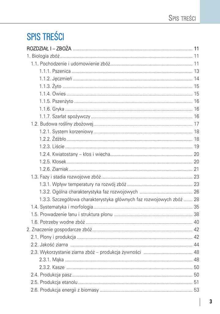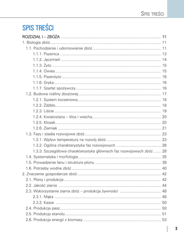 SPIS TREŚCI SPIS TREŚCI ROZDZIAŁ I – ZBOŻA ............................................................................................. 11 1. Biologia zbóż ....................................................................................................... 11 1.1. Pochodzenie i udomowienie zbóż................................................................ 11 1.1.1. Pszenica .............................................................................................. 13 1.1.2. Jęczmień ............................................................................................. 14 1.1.3. Żyto ..................................................................................................... 15 1.1.4. Owies .................................................................................................. 15 1.1.5. Pszenżyto ............................................................................................ 16 1.1.6. Gryka ................................................................................................... 16 1.1.7. Szarłat spożywczy ............................................................................... 16 1.2. Budowa rośliny zbożowej............................................................................. 17 1.2.1. System korzeniowy ............................................................................. 18 1.2.2. Źdźbło.................................................................................................. 18 1.2.3. Liście ................................................................................................... 19 1.2.4. Kwiatostany – kłos i wiecha................................................................ 20 1.2.5. Kłosek.................................................................................................. 20 1.2.6. Ziarniak ................................................................................................ 21 1.3. Fazy i stadia rozwojowe zbóż....................................................................... 23 1.3.1. Wpływ temperatury na rozwój zbóż ................................................... 23 1.3.2. Ogólna charakterystyka faz rozwojowych ......................................... 26 1.3.3. Szczegółowa charakterystyka głównych faz rozwojowych zbóż ....... 28 1.4. Systematyka i morfologia............................................................................. 35 1.5. Prowadzenie łanu i struktura plonu ............................................................. 38 1.6. Potrzeby wodne zbóż ................................................................................... 40 2. Znaczenie gospodarcze zbóż.............................................................................. 42 2.1. Plony i produkcja .......................................................................................... 42 2.2. Jakość ziarna ............................................................................................... 44 2.3. Wykorzystanie ziarna zbóż – produkcja żywności ...................................... 48 2.3.1. Mąka ................................................................................................... 48 2.3.2. Kasze .................................................................................................. 50 2.4. Produkcja pasz.............................................................................................. 50 2.5. Produkcja etanolu ......................................................................................... 51 2.6. Produkcja energii z biomasy ........................................................................ 53 3 SPIS TREŚCI 3. Technologia uprawy pszenicy ozimej ................................................................ 55 3.1. Produkcja i plony .......................................................................................... 55 3.2. Odmiany pszenicy ........................................................................................ 57 3.3. Zmianowanie ................................................................................................ 60 3.4. Termin siewu ................................................................................................ 61 3.5. Przygotowanie roli i siew ............................................................................. 62 3.6. Struktura łanu i prognoza plonu ziarna......................................................... 66 3.7. System nawożenia pszenicy ........................................................................ 72 3.8. Potrzeby pokarmowe łanu............................................................................ 73 3.9. Zapotrzebowanie pszenicy na azot .............................................................. 74 3.9.1. Optymalizacja nawożenia pszenicy azotem ....................................... 75 3.9.2. Pierwiastki wspomagające plonotwórcze działanie azotu ................ 80 4. Technologia uprawy jęczmienia jarego .............................................................. 83 4.1. Kierunki produkcji i plony ............................................................................ 83 4.2. Odmiany jęczmienia ..................................................................................... 85 4.3. Stanowisko ................................................................................................... 86 4.4. Przygotowanie roli i siew ............................................................................. 88 4.5. Struktura łanu i prognoza plonu ................................................................... 89 4.6. Nawożenie ................................................................................................... 91 4.6.1. Składniki pokarmowe.......................................................................... 91 4.6.2. Efektywna technologia nawożenia ..................................................... 91 5