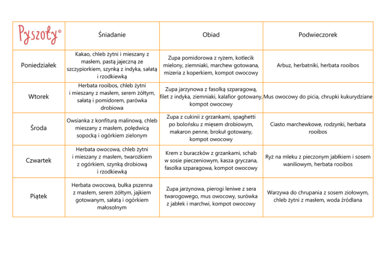 Poniedziałek Wtorek Śniadanie Obiad Podwieczorek Kakao, chleb żytni i mieszany z masłem, pastą jajeczną ze szczypiorkiem, szynką z indyka, sałatą i rzodkiewką Zupa pomidorowa z ryżem, kotlecik mielony, ziemniaki, marchew gotowana, mizeria z koperkiem, kompot owocowy Arbuz, herbatniki, herbata rooibos Herbata rooibos, chleb żytni Zupa jarzynowa z fasolką szparagową, i mieszany z masłem, serem żółtym, filet z indyka, ziemniaki, kalafior gotowany, Mus owocowy do picia, chrupki kukurydziane sałatą i pomidorem, parówka kompot owocowy drobiowa Środa Owsianka z konfiturą malinową, chleb mieszany z masłem, polędwicą sopocką i ogórkiem zielonym Zupa z cukinii z grzankami, spaghetti po bolońsku z mięsem drobiowym, makaron penne, brokuł gotowany, kompot owocowy Ciasto marchewkowe, rodzynki, herbata rooibos Czwartek Herbata owocowa, chleb żytni i mieszany z masłem, twarożkiem z ogórkiem, szynką drobiową i rzodkiewką Krem z buraczków z grzankami, schab w sosie pieczeniowym, kasza gryczana, fasolka szparagowa, kompot owocowy Ryż na mleku z pieczonym jabłkiem i sosem waniliowym, herbata rooibos Piątek Herbata owocowa, bułka pszenna z masłem, serem żółtym, jajkiem gotowanym, sałatą i ogórkiem małosolnym Zupa jarzynowa, pierogi leniwe z sera twarogowego, mus owocowy, surówka z jabłek i marchwi, kompot owocowy Warzywa do chrupania z sosem ziołowym, chleb żytni z masłem, woda źródlana