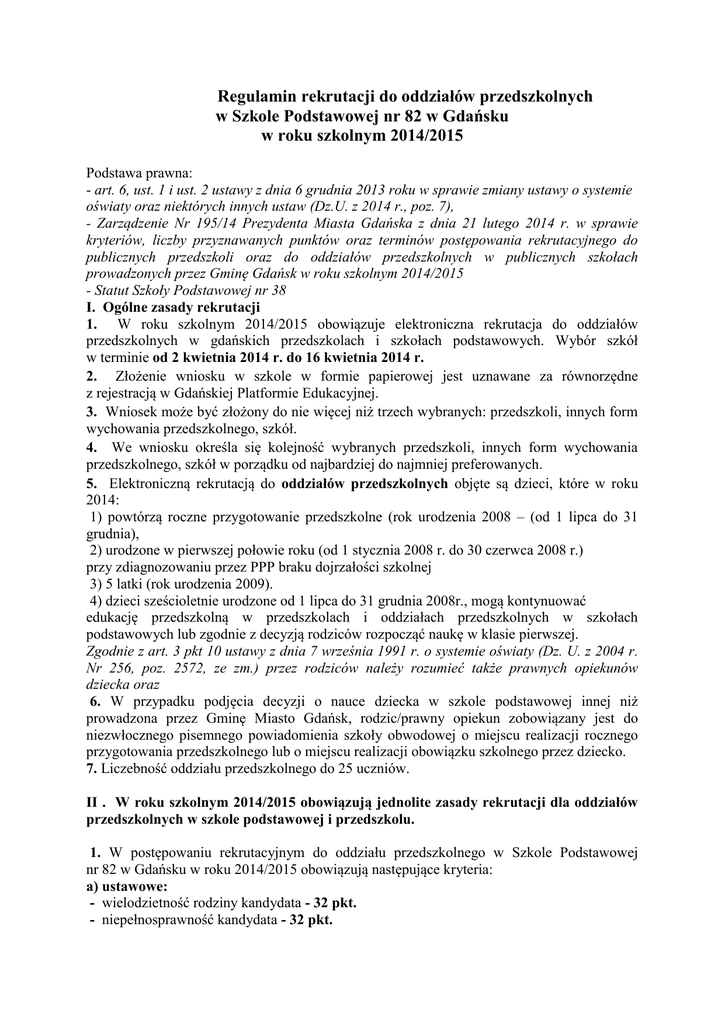 Regulamin rekrutacji do oddziałów przedszkolnych w Szkole Podstawowej nr 82 w Gdańsku w roku szkolnym 2014/2015 Podstawa prawna: - art. 6, ust. 1 i ust. 2 ustawy z dnia 6 grudnia 2013 roku w sprawie zmiany ustawy o systemie oświaty oraz niektórych innych ustaw (Dz.U. z 2014 r., poz. 7), - Zarządzenie Nr 195/14 Prezydenta Miasta Gdańska z dnia 21 lutego 2014 r. w sprawie kryteriów, liczby przyznawanych punktów oraz terminów postępowania rekrutacyjnego do publicznych przedszkoli oraz do oddziałów przedszkolnych w publicznych szkołach prowadzonych przez Gminę Gdańsk w roku szkolnym 2014/2015 - Statut Szkoły Podstawowej nr 38 I. Ogólne zasady rekrutacji 1. W roku szkolnym 2014/2015 obowiązuje elektroniczna rekrutacja do oddziałów przedszkolnych w gdańskich przedszkolach i szkołach podstawowych. Wybór szkół w terminie od 2 kwietnia 2014 r. do 16 kwietnia 2014 r. 2. Złożenie wniosku w szkole w formie papierowej jest uznawane za równorzędne z rejestracją w Gdańskiej Platformie Edukacyjnej. 3. Wniosek może być złożony do nie więcej niż trzech wybranych: przedszkoli, innych form wychowania przedszkolnego, szkół. 4. We wniosku określa się kolejność wybranych przedszkoli, innych form wychowania przedszkolnego, szkół w porządku od najbardziej do najmniej preferowanych. 5. Elektroniczną rekrutacją do oddziałów przedszkolnych objęte są dzieci, które w roku 2014: 1) powtórzą roczne przygotowanie przedszkolne (rok urodzenia 2008 – (od 1 lipca do 31 grudnia), 2) urodzone w pierwszej połowie roku (od 1 stycznia 2008 r. do 30 czerwca 2008 r.) przy zdiagnozowaniu przez PPP braku dojrzałości szkolnej 3) 5 latki (rok urodzenia 2009). 4) dzieci sześcioletnie urodzone od 1 lipca do 31 grudnia 2008r., mogą kontynuować edukację przedszkolną w przedszkolach i oddziałach przedszkolnych w szkołach podstawowych lub zgodnie z decyzją rodziców rozpocząć naukę w klasie pierwszej. Zgodnie z art. 3 pkt 10 ustawy z dnia 7 września 1991 r. o systemie oświaty (Dz. U. z 2004 r. Nr 256, poz. 2572, ze zm.) przez rodziców należy rozumieć także prawnych opiekunów dziecka oraz 6. W przypadku podjęcia decyzji o nauce dziecka w szkole podstawowej innej niż prowadzona przez Gminę Miasto Gdańsk, rodzic/prawny opiekun zobowiązany jest do niezwłocznego pisemnego powiadomienia szkoły obwodowej o miejscu realizacji rocznego przygotowania przedszkolnego lub o miejscu realizacji obowiązku szkolnego przez dziecko. 7. Liczebność oddziału przedszkolnego do 25 uczniów. II . W roku szkolnym 2014/2015 obowiązują jednolite zasady rekrutacji dla oddziałów przedszkolnych w szkole podstawowej i przedszkolu. 1. W postępowaniu rekrutacyjnym do oddziału przedszkolnego w Szkole Podstawowej nr 82 w Gdańsku w roku 2014/2015 obowiązują następujące kryteria: a) ustawowe: - wielodzietność rodziny kandydata - 32 pkt. - niepełnosprawność kandydata - 32 pkt. - niepełnosprawność jednego z rodziców kandydata - 32 pkt. - niepełnosprawność obojga rodziców kandydata - 32 pkt. - niepełnosprawność rodzeństwa kandydata - 32 pkt. - samotne wychowywanie kandydata w rodzinie - 32 pkt. - objęcie kandydata pieczą zastępczą - 32 pkt. b) samorządowe: - dziecko obojga rodziców pracujących /rodziców studiujących /uczących się w systemie dziennym – 8 pkt. - dziecko posiadające rodzeństwo w przedszkolu/szkole pierwszego wyboru – 4 pkt. - dziecko zamieszkujące w obwodzie Szkoły Podstawowej nr 82 w Gdańsku – 16 pkt. 2. Wzór formularza i oświadczeń (o wielodzietności i samotnym wychowywaniu dziecka) oraz wszystkie kryteria ustawowe i samorządowe będą wprowadzone w Formularzu rekrutacyjnym i dostępne na stronie: www.edu.gdansk.pl od 2 kwietnia 2014 r. od godz. 9.00. 3. Rodzice/prawni opiekunowie dzieci urodzonych w okresie od 1 lipca 2008 r. do 31 grudnia 2008 r., które obecnie uczęszczają do oddziałów przedszkolnych w szkole (a rodzic zadecyduje o pozostawieniu dziecka w oddziale przedszkolnym), składają deklarację o kontynuowaniu wychowania przedszkolnego w kolejnym roku szkolnym w szkole, do której uczęszcza dziecko w terminie do 26 marca 2014 roku. 4. Rekrutacja dzieci spoza Gminy Gdańsk możliwa będzie, w przypadku pojawienia się wolnych miejsc, od 1 czerwca do 31 sierpnia 2014 r. W powyższym terminie Rodzice dzieci zamieszkałych poza Gminą Gdańsk wypełnioną Kartę Zapisu dziecka do placówki składają w wybranym przedszkolu/szkole podstawowej. 5. Rekrutacja dzieci posiadających orzeczenie o potrzebie kształcenia specjalnego odbywa się, w systemie elektronicznym. Gdańsk przygotował szeroką ofertę edukacyjną dla dzieci potrzebujących specjalistycznej opieki. Oferta będzie dostępna w systemie elektronicznej rekrutacji. 6. Jeżeli w wyniku postępowania rekrutacyjnego dzieci, które mają obowiązek realizacji rocznego przygotowania przedszkolnego (pięciolatki i sześciolatki urodzone w II połowie 2008 r.) nie zostaną przyjęte do wybranego oddziału przedszkolnego w przedszkolu/szkole podstawowej, Prezydent Miasta wskaże rodzicom miejsce realizacji tego obowiązku. III Komisja Rekrutacyjna 1. Postępowanie rekrutacyjne do oddziałów przedszkolnych w Szkole Podstawowej nr 82 w Gdańsku w roku szk. 2014/2015 przeprowadza Komisja Rekrutacyjna powołana przez Dyrektora Szkoły. Do Komisji powołani zostali: Sylwia Różycka - przewodniczący Komisji Rekrutacyjnej , Wioleta Bazylewicz-Bogdał – członek komisji, Alicja Senn – członek komisji. 2. Nad pracą Komisji Rekrutacyjnej bezpośredni nadzór sprawuje Dyrektor Szkoły. 3. Do zadań Komisji Rekrutacyjnej należy w szczególności: 1) ustalenie wyników postępowania rekrutacyjnego i podanie do publicznej wiadomości listy kandydatów zakwalifikowanych i kandydatów niezakwalifikowanych 2) sporządzenie dokumentacji z postępowania kwalifikacyjnego, 3) ustalenie i podanie do publicznej wiadomości listy kandydatów przyjętych i kandydatów niep