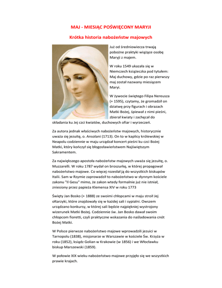 MAJ - MIESIĄC POŚWIĘCONY MARYJI Krótka historia nabożeństw