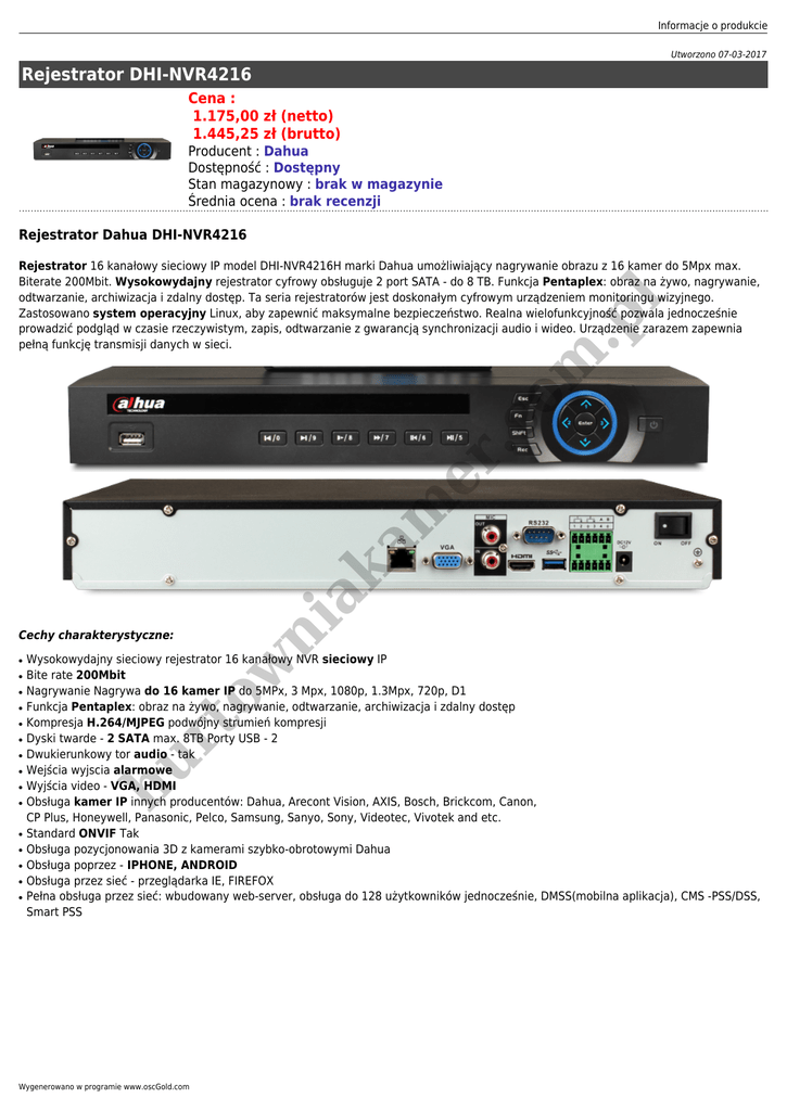 Informacje o produkcie Utworzono 07-03-2017 Rejestrator DHI-NVR4216 Cena : 1.175,00 zł (netto) 1.445,25 zł (brutto) Producent : Dahua Dostępność : Dostępny Stan magazynowy : brak w magazynie Średnia ocena : brak recenzji Rejestrator Dahua DHI-NVR4216 ni ak am er .c om .p l Rejestrator 16 kanałowy sieciowy IP model DHI-NVR4216H marki Dahua umożliwiający nagrywanie obrazu z 16 kamer do 5Mpx max. Biterate 200Mbit. Wysokowydajny rejestrator cyfrowy obsługuje 2 port SATA - do 8 TB. Funkcja Pentaplex: obraz na żywo, nagrywanie, odtwarzanie, archiwizacja i zdalny dostęp. Ta seria rejestratorów jest doskonałym cyfrowym urządzeniem monitoringu wizyjnego. Zastosowano system operacyjny Linux, aby zapewnić maksymalne bezpieczeństwo. Realna wielofunkcyjność pozwala jednocześnie prowadzić podgląd w czasie rzeczywistym, zapis, odtwarzanie z gwarancją synchronizacji audio i wideo. Urządzenie zarazem zapewnia pełną funkcję transmisji danych w sieci. Cechy charakterystyczne: ● ● ● ● ● ● ● ● ● ● ● ● ow ● Wysokowydajny sieciowy rejestrator 16 kanałowy NVR sieciowy IP Bite rate 200Mbit Nagrywanie Nagrywa do 16 kamer IP do 5MPx, 3 Mpx, 1080p, 1.3Mpx, 720p, D1 Funkcja Pentaplex: obraz na żywo, nagrywanie, odtwarzanie, archiwizacja i zdalny dostęp Kompresja H.264/MJPEG podwójny strumień kompresji Dyski twarde - 2 SATA max. 8TB Porty USB - 2 Dwukierunkowy tor audio - tak Wejścia wyjscia alarmowe Wyjścia video - VGA, HDMI Obsługa kamer IP innych producentów: Dahua, Arecont Vision, AXIS, Bosch, Brickcom, Canon, CP Plus, Honeywell, Panasonic, Pelco, Samsung, Sanyo, Sony, Videotec, Vivotek and etc. Standard ONVIF Tak Obsługa pozycjonowania 3D z kamerami szybko-obrotowymi Dahua Obsługa poprzez - IPHONE, ANDROID Obsługa przez sieć - przeglądarka IE, FIREFOX Pełna obsługa przez sieć: wbudowany web-server, obsługa do 128 użytkowników jednocześnie, DMSS(mobilna aplikacja), CMS -PSS/DSS, Smart PSS rt ● hu ● Wygenerowano w programie www.oscGold.com .p l Model DHI-NVR4216H Procesor Dual Core System operacyjny LINUX Obsługa kamer 16 kanały Audio Wejście audio 1 kanał, RCA Wyjście audio 1 kanał, RCA Dwukierunkowy tor audio 1 Wyświetlanie ni ak am System er .c om Specyfikacja: 1 HDMI, 1 VGA Rozdzielczość 1920× 1080, 1280× 1024, 1280× 720, 1024× 768 Podział 1/4/8/9/16 OSD Nazwa kamery, Czas, zanik wideo, blokada kamery, detekcja ruchu, nagrywanie ow Wyjście wideo Nagrywanie 5Mp(2560× 1920)/3Mp(2048× 1536)/1080P(1920× 1080)/720P(1280× 720)/ D1(704× 576/704× 480) hu Rozdzielczość H.264/G.711 rt Kompresja Video/Audio Prędkość Nagrywania 200Mbps Max. zajetość pasma 48~ 8192kbps Tryby Nagrań Ręczne, Terminarz (Regularne(Ciągłe), MD, Alarm), Stop Interwał Nagrań 1~120 min (default: 60 min), Pre-record: 1~30 sec, Post-record: 10~300 sec Detekcja alarm Wyzwalanie zdarzeń Nagrywanie, PTZ, Trasa, Video Push, Email, FTP, Snapshot, Buzzer & Komunikaty ekranowe Detekcja ruchu Strefy: 396(22×18), zanik wideo & zasłonięcie kamery Wejścia alarmowe 4 Wyjścia alarmowe 2 Odtwarzanie & Archiwizacja Odtwarzanie kanałów 1/4/9/16 Tryb szukania Czas/Data, Alarm, MD & Exact search (co do sekundy), smart search Funkcje Odtwarzania Play, Pause, Stop, Rewind, Fast play, Slow play, Next file, Previous file, Next camera, Previous camera, Full screen, Repeat, Shuffle, Backup selection, Digital zoom Archiwizacja USB Urządzenie/Zewnetrzna nagrywarka SATA/ ściąganie przez sieć Sieć Informacje o produkcie Port 1 RJ-45 port (10/100Mbps) Funkcje Sieciowe HTTP, TCP/IP, IPv4/IPv6, UPNP, RTSP, UDP, SMTP, NTP, DHCP, DNS, IP Filter, PPPOE, DDNS, FTP, Alarm Server, IP Search(Support Dahua IP camera, DVR, NVS and etc.) Max. Liczba użytkowników 128 użytkowników Obsługa Smart Phone iPhone, iPad, Android, Windows Phone Obsługa dysków HDD 2 SATA port, max. do 8TB Dodatkowe interfejsy USB 2 porty,USB2.0 RS232 1 port dla komunikacji z PC klawiaturą RS485 1 port dla kontroli PTZ 20W(without HDD) Warunki pracy -10°C~+55°C / 10%~90%RH / 86~106kpa Wymiary(W×D×H) 1U 375mm× 282mm× 56mm Waga 2KG (bez HDD) er .c om DC12V/4A Pobór pradu hu rt ow ni ak am Zasilanie .p l Ogólne Wygenerowano w programie www.oscGold.com