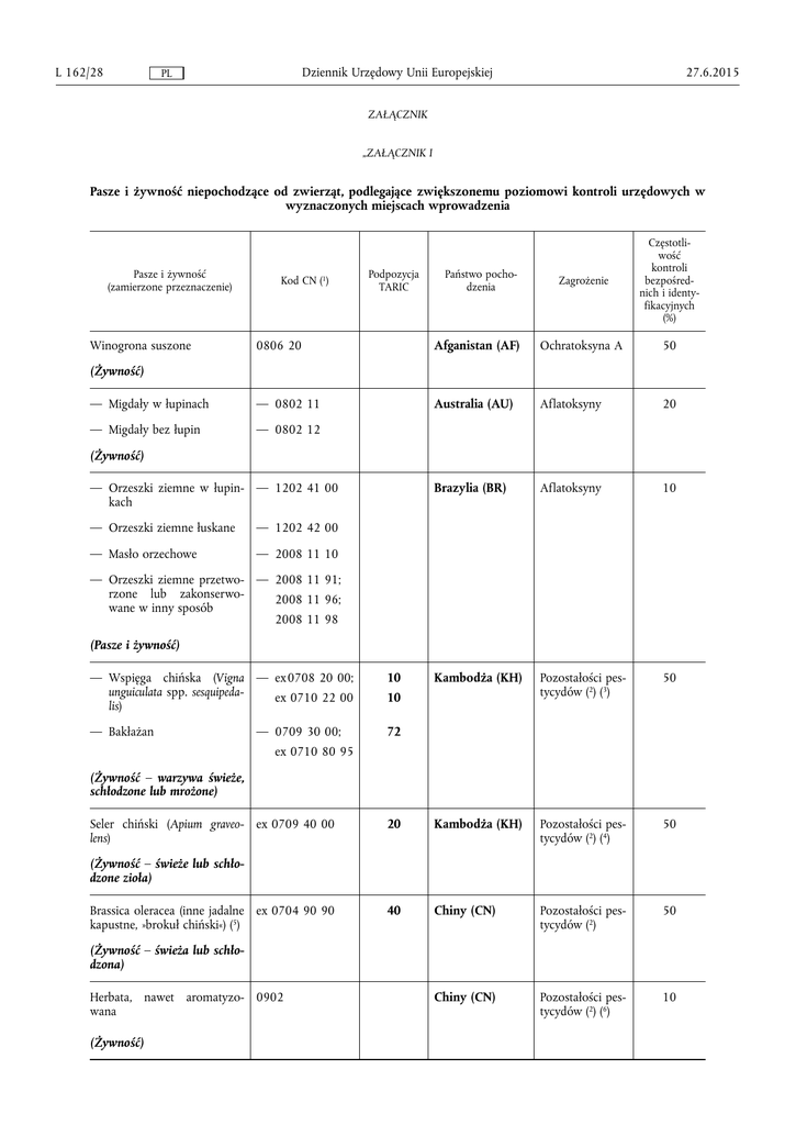 L 162/28 Dziennik Urzędowy Unii Europejskiej PL 27.6.2015 ZAŁĄCZNIK „ZAŁĄCZNIK I Pasze i żywność niepochodzące od zwierząt, podlegające zwiększonemu poziomowi kontroli urzędowych w wyznaczonych miejscach wprowadzenia Pasze i żywność (zamierzone przeznaczenie) Winogrona suszone Kod CN (1) Podpozycja TARIC Państwo pocho dzenia Zagrożenie Częstotli wość kontroli bezpośred nich i identy fikacyjnych (%) 0806 20 Afganistan (AF) Ochratoksyna A 50 — Migdały w łupinach — 0802 11 Australia (AU) Aflatoksyny 20 — Migdały bez łupin — 0802 12 Brazylia (BR) Aflatoksyny 10 Kambodża (KH) Pozostałości pes tycydów (2) (3) 50 20 Kambodża (KH) Pozostałości pes tycydów (2) (4) 50 40 Chiny (CN) Pozostałości pes tycydów (2) 50 Chiny (CN) Pozostałości pes tycydów (2) (6) 10 (Żywność) (Żywność) — Orzeszki ziemne w łupin — 1202 41 00 kach — Orzeszki ziemne łuskane — 1202 42 00 — Masło orzechowe — 2008 11 10 — Orzeszki ziemne przetwo — 2008 11 91; rzone lub zakonserwo 2008 11 96; wane w inny sposób 2008 11 98 (Pasze i żywność) — Wspięga chińska (Vigna — ex 0708 20 00; unguiculata spp. sesquipeda ex 0710 22 00 lis) 10 — Bakłażan 72 — 0709 30 00; 10 ex 0710 80 95 (Żywność – warzywa świeże, schłodzone lub mrożone) Seler chiński (Apium graveo ex 0709 40 00 lens) (Żywność – świeże lub schło dzone zioła) Brassica oleracea (inne jadalne ex 0704 90 90 kapustne, »brokuł chiński«) (5) (Żywność – świeża lub schło dzona) Herbata, nawet aromatyzo 0902 wana (Żywność) 27.6.2015 Dziennik Urzędowy Unii Europejskiej PL Pasze i żywność (zamierzone przeznaczenie) — Bakłażan Kod CN (1) — 0709 30 00; Podpozycja TARIC 72 ex 0710 80 95 — Przepękla ogórkowata — ex 0709 99 90; (Momordica charantia) ex 0710 80 95 Państwo pocho dzenia L 162/29 Zagrożenie Częstotli wość kontroli bezpośred nich i identy fikacyjnych (%) Republika Domi Pozostałości pes nikańska (DO) tycydów (2) (7) 10 Republika Domi Pozostałości pes nikańska (DO) tycydów (2) (7) 20 Egipt (EG) Pozostałości pes tycydów (2) (8) 10 Egipt (EG) Pozostałości pes tycydów (2) (9) 10 Indie (IN) Salmonella (10) 50 Indie (IN) Salmonella (10) 20 Indie (IN) Aflatoksyny 20 Indie (IN) Chloramfenikol 50 70 70 (Żywność – warzywa świeże, schłodzone lub mrożone) — Wspięga chińska (Vigna — ex 0708 20 00; unguiculata spp. sesquipeda ex 0710 22 00 lis) 10 — Papryka (słodka i inna niż — 0709 60 10; słodka) (Capsicum spp.) ex 0709 60 99 20 (Żywność – warzywa świeże, — 0710 80 51; schłodzone lub mrożone) ex 0710 80 59 20 Truskawki (świeże) 10 0810 10 00 (Żywność) Papryka (słodka i inna niż 0709 60 10; słodka) (Capsicum spp.) ex 0709 60 99; 20 (Żywność – świeża, schło 0710 80 51; dzona lub mrożona) ex 0710 80 59 20 Liście betelu (Piper betle L.) 10 ex 1404 90 00 (Żywność) Nasiona sezamu 1207 40 90 (Żywność – świeża lub schło dzona) — Capsicum owoce annuum, całe — 0904 21 10 — Capsicum annuum, owoce — ex 0904 22 00 rozgniatane lub mielone 10 — Suszone całe owoce z ro — 0904 21 90 dzaju Capsicum, inne niż słodka papryka (Capsicum annuum) — Gałka muszkatołowa (My — 0908 11 00; ristica fragrans) 0908 12 00 (Żywność – suszone przy prawy) Enzymy; preparaty enzyma 3507 tyczne (Pasze i żywność) L 162/30 PL Pasze i żywność (zamierzone przeznaczenie) Dziennik Urzędowy Unii Europejskiej Kod CN (1) Podpozycja TARIC — Gałka muszkatołowa (My — 0908 11 00; ristica fragrans) 0908 12 00 Państwo pocho dzenia 27.6.2015 Zagrożenie Częstotli wość kontroli bezpośred nich i identy fikacyjnych (%) Indonezja (ID) Aflatoksyny 20 40 Kenia (KE) Pozostałości pes tycydów (2) (11) 10 ex 1211 90 86; 30 Maroko (MA) 10 (Żywność – świeże lub schło ex 2008 99 99 dzone zioła) 70 Pozostałości pes tycydów (2) (12) Peru (PE) Pozostałości pes tycydów (2) (13) 10 Sierra Leone (SL) Aflatoksyny 50 Sudan (SD) Aflatoksyny 50 20 Tajlandia (TH) Pozostałości pes tycydów (2) (14) 10 10 Tajlandia (TH) Salmonella (10) 50 — Wspięga chińska (Vigna — ex 0708 20 00; unguiculata spp. sesquipeda ex 0710 22 00 lis) 10 Tajlandia (TH) Pozostałości pes tycydów (2) (15) 20 — Bakłażan 72 (Żywność – suszone przy prawy) — Groch w strąkach (niełu — ex 0708 10 00 skany) (Żywność – świeża lub schło dzona) Mięta Winogrona stołowe 0806 10 10 (Żywność – świeża) Pestki arbuza (Egusi, Citrullus ex 1207 70 00; lanatus) i produkty pochodne ex 1106 30 90; 10 ex 2008 99 99 50 30 (Żywność) — Orzeszki ziemne w łupin — 1202 41 00 kach — Orzeszki ziemne łuskane — 1202 42 00 — Masło orzechowe — 2008 11 10 — Orzeszki ziemne przetwo — 2008 11 91; rzone lub zakonserwo 2008 11 96; wane w inny sposób 2008 11 98 (Pasze i żywność) Papryka (inna niż słodka) ex 0709 60 99 (Capsicum spp.) (Żywność – świeża lub schło dzona) Liście betelu (Piper betle L.) ex 1404 90 00 (Żywność) — 0709 30 00; ex 0710 80 95 (Żywność – warzywa świeże, schłodzone lub mrożone) 10 27.6.2015 Dziennik Urzędowy Unii Europejskiej PL Pasze i żywność (zamierzone przeznaczenie) — Morele suszone Kod CN (1) Podpozycja TARIC — 0813 10 00 Państwo pocho dzenia L 162/31 Zagrożenie Częstotli wość kontroli bezpośred nich i identy fikacyjnych (%) Turcja (TR) Siarczyny (16) 10 Turcja (TR) Pozostałości pes tycydów (2) (17) 10 Turcja (TR) Pozostałości pes tycydów (2) (18) 50 Stany Zjedno czone (US) Aflatoksyny 20 Uzbekistan (UZ) Siarczyny (16) 50 Uzbekistan (UZ) Ochratoksyna A 50 Wietnam (VN) Pozostałości pes tycydów (2) (19) 50 Wietnam (VN) Pozostałości pes tycydów (2) (19) 50 — Morele inaczej przetwo — 2008 50 61 rzone lub zakonserwo wane (Żywność) — Papryka słodka (Capsicum — 0709 60 10; annuum) 0710 80 51 (Żywność – warzywa świeże, schłodzone lub mrożone) Liście winorośli ex 2008 99 99 11; 19 (Żywność) — Pis