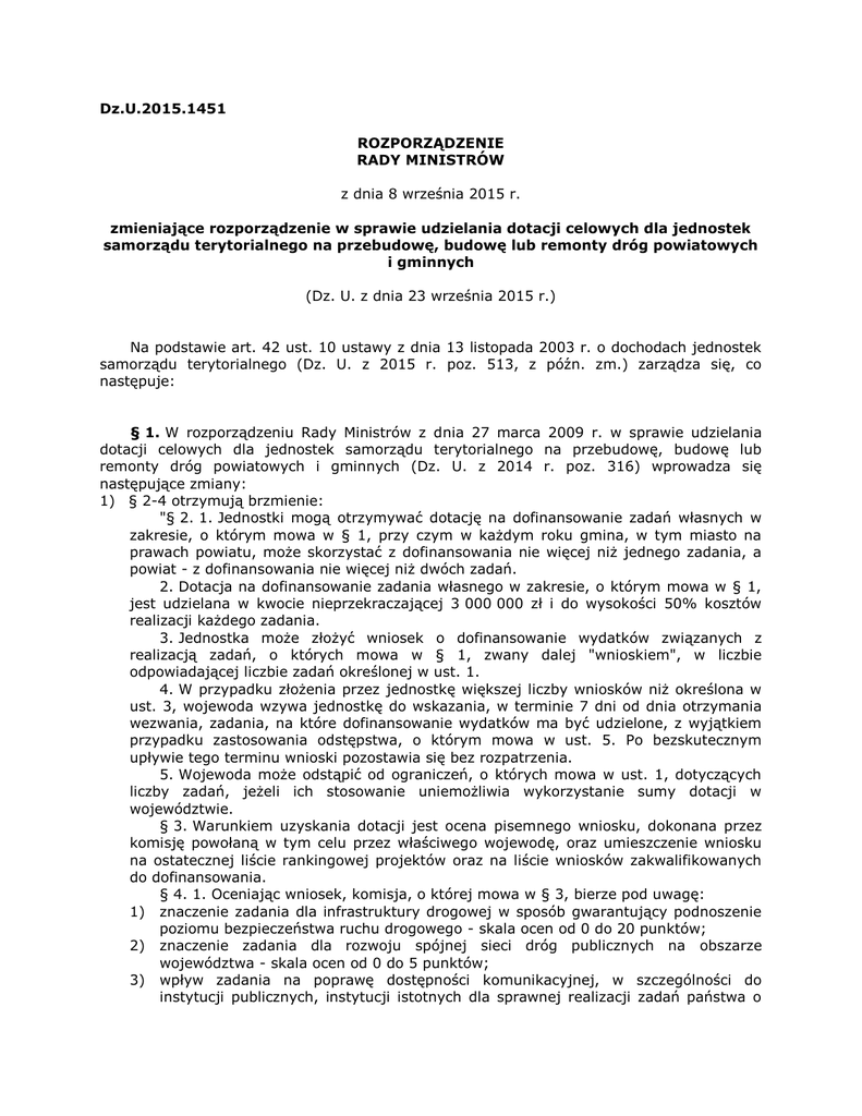Dz.U.2015.1451 ROZPORZĄDZENIE RADY MINISTRÓW z dnia 8 września 2015 r. zmieniające rozporządzenie w sprawie udzielania dotacji celowych dla jednostek samorządu terytorialnego na przebudowę, budowę lub remonty dróg powiatowych i gminnych (Dz. U. z dnia 23 września 2015 r.) Na podstawie art. 42 ust. 10 ustawy z dnia 13 listopada 2003 r. o dochodach jednostek samorządu terytorialnego (Dz. U. z 2015 r. poz. 513, z późn. zm.) zarządza się, co następuje: § 1. W rozporządzeniu Rady Ministrów z dnia 27 marca 2009 r. w sprawie udzielania dotacji celowych dla jednostek samorządu terytorialnego na przebudowę, budowę lub remonty dróg powiatowych i gminnych (Dz. U. z 2014 r. poz. 316) wprowadza się następujące zmiany: 1) § 2-4 otrzymują brzmienie: "§ 2. 1. Jednostki mogą otrzymywać dotację na dofinansowanie zadań własnych w zakresie, o którym mowa w § 1, przy czym w każdym roku gmina, w tym miasto na prawach powiatu, może skorzystać z dofinansowania nie więcej niż jednego zadania, a powiat - z dofinansowania nie więcej niż dwóch zadań. 2. Dotacja na dofinansowanie zadania własnego w zakresie, o którym mowa w § 1, jest udzielana w kwocie nieprzekraczającej 3 000 000 zł i do wysokości 50% kosztów realizacji każdego zadania. 3. Jednostka może złożyć wniosek o dofinansowanie wydatków związanych z realizacją zadań, o których mowa w § 1, zwany dalej "wnioskiem", w liczbie odpowiadającej liczbie zadań określonej w ust. 1. 4. W przypadku złożenia przez jednostkę większej liczby wniosków niż określona w ust. 3, wojewoda wzywa jednostkę do wskazania, w terminie 7 dni od dnia otrzymania wezwania, zadania, na które dofinansowanie wydatków ma być udzielone, z wyjątkiem przypadku zastosowania odstępstwa, o którym mowa w ust. 5. Po bezskutecznym upływie tego terminu wnioski pozostawia się bez rozpatrzenia. 5. Wojewoda może odstąpić od ograniczeń, o których mowa w ust. 1, dotyczących liczby zadań, jeżeli ich stosowanie uniemożliwia wykorzystanie sumy dotacji w województwie. § 3. Warunkiem uzyskania dotacji jest ocena pisemnego wniosku, dokonana przez komisję powołaną w tym celu przez właściwego wojewodę, oraz umieszczenie wniosku na ostatecznej liście rankingowej projektów oraz na liście wniosków zakwalifikowanych do dofinansowania. § 4. 1. Oceniając wniosek, komisja, o której mowa w § 3, bierze pod uwagę: 1) znaczenie zadania dla infrastruktury drogowej w sposób gwarantujący podnoszenie poziomu bezpieczeństwa ruchu drogowego - skala ocen od 0 do 20 punktów; 2) znaczenie zadania dla rozwoju spójnej sieci dróg publicznych na obszarze województwa - skala ocen od 0 do 5 punktów; 3) wpływ zadania na poprawę dostępności komunikacyjnej, w szczególności do instytucji publicznych, instytucji istotnych dla sprawnej realizacji zadań państwa o kluczowym znaczeniu dla bezpieczeństwa obywateli oraz do lokalnych ośrodków gospodarczych, dostępności komunikacyjnej na obszarach wiejskich oraz poprawę infrastruktury drogowej wykorzystywanej na potrzeby transportu zbiorowego - skala ocen od 0 do 7 punktów; 4) współpracę jednostki w zakresie dofinansowania realizacji zadania z innymi jednostkami lub podmiotami - skala ocen od 0 do 5 punktów; 5) kontynuację zadania - skala ocen od 0 do 5 punktów. 2. Przy ocenie spełnienia warunku, o którym mowa w ust. 1: 1) pkt 1 - uwzględnia się w szczególności prawidłowość przyjętych rozwiązań techniczno-budowlanych, elastyczność w kształtowaniu elementów drogi wynikającą z lokalnych potrzeb komunikacyjnych oraz jej otoczenia, kompleksowość zaplanowanych robót, stosowanie rozwiązań techniczno-budowlanych podnoszących poziom bezpieczeństwa niechronionych uczestników ruchu oraz gwarantujących sprawne odwodnienie drogi; 2) pkt 2 - uwzględnia się w szczególności znaczenie danej drogi dla sieci dróg publicznych oraz jej ponadlokalny charakter, kryteria zaliczania dróg do kategorii dróg powiatowych i gminnych, określone odpowiednio w art. 6a ust. 1 i art. 7 ust. 1 ustawy z dnia 21 marca 1985 r. o drogach publicznych (Dz. U. z 2015 r. poz. 460, z późn. zm.); 3) pkt 3 - uwzględnia się w szczególności objęcie zadaniem odcinków dróg zapewniających połączenie komunikacyjne niezbędne dla rozwoju obszarów wiejskich, ośrodków gospodarczych, przedsiębiorców prowadzących działalność gospodarczą ważną dla społeczności lokalnych, podniesienie efektywności realizacji zadań publicznych, w tym w obszarze ochrony zdrowia, edukacji i administracji publicznej, połączeń drogowych istotnych dla sprawnej realizacji zadań państwa o kluczowym znaczeniu dla bezpieczeństwa obywateli oraz ważnych dla transportu zbiorowego; 4) pkt 4 - uwzględnia się wielkość udziału innych jednostek lub podmiotów we wkładzie własnym jednostki; 5) pkt 5 - uwzględnia się, czy planowane do dofinansowania zadanie stanowi zamknięcie danego ciągu drogi lub kolejny odcinek w ciągu danej drogi, która została zbudowana, przebudowana lub wyremontowana, w okresie ostatnich 3 lat, licząc od roku, w którym jest składany wniosek, bez względu na źródło finansowania. 3. Minister właściwy do spraw transportu zatwierdza ostateczną listę rankingową projektów na podstawie oceny złożonych wniosków dokonanej przez komisję, o czym informuje ministra właściwego do spraw finansów publicznych, wskazując jednocześnie możliwość uruchomienia na wniosek właściwego wojewody procedury przekazywania środków finansowych. 4. Na podstawie ostatecznej listy rankingowej projektów właściwy wojewoda zatwierdza listę wniosków zakwalifikowanych do dofinansowania w ramach limitu środków ustalonego dla danego województwa. Zatwierdzenie listy jest równoznaczne z dokonaniem podziału limitu środków ustalonego dla województwa. 5. Właściwy wojewoda może zmienić listę wniosków zakwalifikowanych do dofinansowania w przypadku wycofania