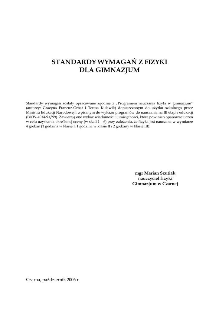 STANDARDY WYMAGAŃ Z FIZYKI DLA GIMNAZJUM