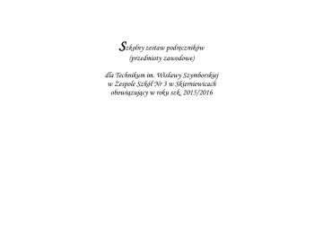 Szkolny zestaw podręczników (przedmioty zawodowe) dla Technikum im. Wisławy Szymborskiej w Zespole Szkół Nr 3 w Skierniewicach obowiązujący w roku szk. 2015/2016 SZKOLNY ZESTAW PODRĘCZNIKÓW TECHNIKUM ( przedmioty zawodowe) TECHNIK HOTELARSTWA, 422402 Program nauczania dla zawodu technik hotelarstwa, 422402 o strukturze przedmiotowej PRZEDMIOTY Nr dopuszczenia PODRĘCZNIK SZKOLNY KLASA PIERWSZA Bezpieczeństwo i higiena pracy Bezpieczeństwo i higiena pracy Bezpieczeństwo i higiena pracy Bezpieczeństwo i higiena pracy AUTOR WYDAWCA WSiP Wanda Bukała, Krzysztof Szczęch Ekonomik A. Komosa Barbara CymańskaGarbowska, Danuta Witrykus, Grzegora Wolak, Jadwiga Pietras Organizacja pracy w hotelarstwie 20/2014 Organizacja pracy w hotelarstwie Działalność przedsiębiorstwa hotelarskiego 68/2013 Usługi żywieniowe w hotelarstwie Organizacja pracy w hotelarstwie Marketing usług hotelarskich Język obcy zawodowy angielski 34/2013 Podstawy działalności Renata Tylińska, przedsiębiorstwa Maria Wajgner hotelarskiego KLASA DRUGA, TRZECIA Usługi żywieniowe Bożena Graneckaw hotelarstwie Wrzosek Obsługa gości w Witold Drogoń recepcji Marketing Jan Center w hotelarstwie How can I help you J. Dolińskaczęść I,II Romanowicz D. Nowakowska Deutsch Fur Profis Amadeusz Lipczak Język obcy zawodowy niemiecki 9/2013 WSIP WSIP WSIP WSIP WSIP REA Lektor Klett Techniki pracy w hotelarstwie Obsługa konsumenta Obsługa informatyczna w hotelarstwie 35/2007 Obsługa gości w recepcji Obsługa gości cz I, II Nie ma Witold Dragoń WSIP Renata Szajna, Danuta Ławniczak, Alina Ziaja REA SZKOLNY ZESTAW PODRĘCZNIKÓW TECHNIKUM ( przedmioty zawodowe) technik żywienia i usług gastronomicznych 343404 rok szkolny 2015/2016 Program nauczania dla zawodu technik żywienia i usług gastronomicznych, 343404 o strukturze przedmiotowej PRZEDMIOTY Wyposażenie i zasady bezpieczeństwa w gastronomii Nr dopuszczenia 11/2014 PODRĘCZNIK SZKOLNY KLASA PIERWSZA Sporządzanie i ekspedycja potraw i napojów. Część 3. Wyposażenie zakładów gastronomicznych AUTOR WYDAWCA Marzanna Zienkiewicz 163801 Bezpieczeństwo i higiena pracy Wanda Bukała Krzysztof Szczęch Technologia gastronomiczna z towaroznawstwem 21/2013 Anna Kmiołek Procesy technologiczne w gastronomii 57/2013 Sporządzanie napojów i potraw. Towaroznawstwo i przechowywanie żywności Sporządzanie i ekspedycja potraw i napojów. Część1 Technologia gastronomiczna Anna Kmiołek Wydawnictwa Szkolne i Pedagogiczne Sp. z o.o. WSIP WSIP PRZEDMIOTY Działalność gospodarcza w gastronomii Nr dopuszczenia 158501 Język obcy zawodowy angielski Język obcy zawodowy niemiecki Zasady żywienia 1/2013 Technologia gastronomiczna z towaroznawstwem 21/2013 Procesy technologiczne w gastronomii 57/2013 KLASA DRUGA PODRĘCZNIK SZKOLNY AUTOR WYDAWCA Prowadzenie działalności gospodarczej Teresa Gorzelany, Wiesława Aue Highly Recommended T. Stott, Rod Revell Oxford Zeszyt ćwiczeń j. zaw. w gastronomii Mit Beruf auf Deutsch Rafał Sarna WSIP Zasady żywienia. Planowanie i ocena Hanna Kunachowicz Irena Nadolna Beata Przygoda Beata Sińska Halina Turlejska Sporządzanie napojów i potraw. Towaroznawstwo i przechowywanie żywności. Anna Kmiołek Sporządzanie i ekspedycja potraw i napojów. Część1.Technologia gastronomiczna Anna Kmiołek B. Kujawa M. Stinia WSIP Nowa Era WSIP WSIP WSIP KLASA TRZECIA PRZEDMIOTY Planowanie żywienia i produkcji gastronomicznej Obsługa konsumentów w gastronomii Usługi gastronomiczne Nr dopuszczenia 23/2013 PODRĘCZNIK SZKOLNY Organizacja produkcji gastronomicznej AUTOR WYDAWCA Anna Kmiołek WSIP o Usługi gastronomiczne Anna Kmiołek WSIP Prowadzenie działalności gospodarczej Teresa Gorzelany, Wiesława Aue Anna Kmiołek WSIP Anna Kmiołek WSIP Zasady żywienia. Planowanie i ocena Hanna Kunachowicz Irena Nadolna Beata Przygoda Beata Sińska Halina Turlejska WSIP Język obcy zawodowy Język angielski Highly Recommended T. Stott, Rod Revell Oxford Rafał Sarna WSIP Język niemiecki Zeszyt ćwiczeń j. zaw. w gastronomii Mit Beruf auf Deutsch Działalność gospodarcza w gastronomii Procesy technologiczne w gastronomii 56/2013 Nr dopuszczenia 158501 65/2013 21/2013 Technologia gastronomiczna z towaroznawstwem Zasady żywienia 1/2013 Sporządzanie i ekspedycja potraw i napojów. Część,2 Technologia gastronomiczna Sporządzanie napojów i potraw. Towaroznawstwo i przechowywanie żywności. B. Kujawa M. Stinia WSIP Nowa Era SZKOLNY ZESTAW PODRĘCZNIKÓW ( przedmioty zawodowe) TECHNIK EKONOMISTA 331403 ROK SZKOLNY 2015/2016 Program nauczania dla zawodu technik ekonomista, 331403 o strukturze przedmiotowej PRZEDMIOTY Nr dopuszcz enia Bezpieczeństwo i higiena pracy Podstawy ekonomii Ekonomika Prawo Marketing Zasady rachunkowości Język obcy zawodowy angielski Język obcy zawodowy niemiecki Statystyka Kadry I Płace 47 37 PODRĘCZNIK SZKOLNY KLASA PIERWSZA Bezpieczeństwo i higiena pracy Podstawy ekonomii Ekonomika przedsiębiorstw KLASA DRUGA Elementy prawa Podstawy marketingu Zasady rachunkowości English for Banking and Finance1, 2 Deutsch Fur Profis 49/2013 Zarys statystyki Kadry I Płace WYDAWCA AUTOR WSiP Wanda Bukała, Krzysztof Szczęch Difin Difin J. Majcher-Mierzejewska K. Guza Ekonomik Difin WSiP Pearson Jacek Musiałkiewicz Aldona Nowicka, Robert Nowacki Grażyna Borowska Marjone Rosenberg Lektor Klett Mariola Gurgul WSiP WSiP B. Jaworska Damian Dębski, Paweł Dębski Ćwiczenia Sporządzanie Kształcenie dokumentów dotyczących rozliczeń Kadr z ZUS i Usługi Biurowe Magdalena Meinert, Władysława Winnicka- Meinert. Pracownia ekonomicznoinformatyczna Rachunkowość i sprawozdawczość finansowa Pracownia rachunkowości Analiza EkonomicznoFinansowa Technika biurowa WSiP Ewa Stefaniak-Prasek 61/2013 62/2013 Zeszyt testów i ćwiczeń przygotowujących do egzaminu potwierdzającego kwalifikacje A.35 Rachunkowość przedsiębiorcy. Księgowość i kalkulacja. Część 1. Księgowość i kalkulacja. Część 2 63/2013 I