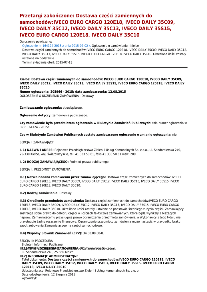 Przetargi zakończone: Dostawa części zamiennych do samochodów:IVECO EURO CARGO 120E18, IVECO DAILY 35C09, IVECO DAILY 35C12, IVECO DAILY 35C13, IVECO DAILY 35S15, IVECO EURO CARGO 120E18, IVECO DAILY 35C10 Ogłoszenie powiązane: Ogłoszenie nr 164124-2015 z dnia 2015-07-02 r. Ogłoszenie o zamówieniu - Kielce Dostawa części zamiennych do samochodów:IVECO EURO CARGO 120E18, IVECO DAILY 35C09, IVECO DAILY 35C12, IVECO DAILY 35C13, IVECO DAILY 35S15, IVECO EURO CARGO 120E18, IVECO DAILY 35C10. Określone ilości zostały ustalone na podstawie... Termin składania ofert: 2015-07-13 Kielce: Dostawa części zamiennych do samochodów: IVECO EURO CARGO 120E18, IVECO DAILY 35C09, IVECO DAILY 35C12, IVECO DAILY 35C13, IVECO DAILY 35S15, IVECO EURO CARGO 120E18, IVECO DAILY 35C10 Numer ogłoszenia: 205966 - 2015; data zamieszczenia: 12.08.2015 OGŁOSZENIE O UDZIELENIU ZAMÓWIENIA - Dostawy Zamieszczanie ogłoszenia: obowiązkowe. Ogłoszenie dotyczy: zamówienia publicznego. Czy zamówienie było przedmiotem ogłoszenia w Biuletynie Zamówień Publicznych: tak, numer ogłoszenia w BZP: 164124 - 2015r. Czy w Biuletynie Zamówień Publicznych zostało zamieszczone ogłoszenie o zmianie ogłoszenia: nie. SEKCJA I: ZAMAWIAJĄCY I. 1) NAZWA I ADRES: Rejonowe Przedsiębiorstwo Zieleni i Usług Komunalnych Sp. z o.o., ul. Sandomierska 249, 25-330 Kielce, woj. świętokrzyskie, tel. 41 333 50 61, faks 41 333 50 61 wew. 209. I. 2) RODZAJ ZAMAWIAJĄCEGO: Podmiot prawa publicznego. SEKCJA II: PRZEDMIOT ZAMÓWIENIA II.1) Nazwa nadana zamówieniu przez zamawiającego: Dostawa części zamiennych do samochodów: IVECO EURO CARGO 120E18, IVECO DAILY 35C09, IVECO DAILY 35C12, IVECO DAILY 35C13, IVECO DAILY 35S15, IVECO EURO CARGO 120E18, IVECO DAILY 35C10. II.2) Rodzaj zamówienia: Dostawy. II.3) Określenie przedmiotu zamówienia: Dostawa części zamiennych do samochodów:IVECO EURO CARGO 120E18, IVECO DAILY 35C09, IVECO DAILY 35C12, IVECO DAILY 35C13, IVECO DAILY 35S15, IVECO EURO CARGO 120E18, IVECO DAILY 35C10. Określone ilości zostały ustalone na podstawie średniego zużycia części. Zamawiający zastrzega sobie prawo do odbioru części w ilościach faktycznie zamawianych, które będą wynikały z bieżących napraw. Zamawiającemu przysługuje prawo ograniczenia przedmiotu zamówienia, a Wykonawcy z tego tytułu nie przysługuje żadne roszczenie finansowe. Ograniczenie przedmiotu zamówienia może nastąpić w przypadku braku zapotrzebowania Zamawiającego na części samochodowe. II.4) Wspólny Słownik Zamówień (CPV): 34.30.00.00-0. SEKCJA III: PROCEDURA Biuletyn Informacji Publicznej Rejonowe Zieleni i UsługPrzetarg Komunalnych Sp. z o. o. III.1) TRYBPrzedsiębiorstwo UDZIELENIA ZAMÓWIENIA: nieograniczony ul. Sandomierska 249, 25-330 Kielce III.2) INFORMACJE ADMINISTRACYJNE Tytuł dokumentu: Dostawa części zamiennych do samochodów:IVECO EURO CARGO 120E18, IVECO DAILY 35C09, IVECO DAILY 35C12, IVECO DAILY 35C13, IVECO DAILY 35S15, IVECO EURO CARGO 120E18, IVECO DAILY 35C10 Udostępniający: Rejonowe Przedsiębiorstwo Zieleni i Usług Komunalnych Sp. z o. o. Data udostępnienia: 12 Sierpnia 2015 wytworzył: ● Zamówienie dotyczy projektu/programu finansowanego ze środków Unii Europejskiej: nie SEKCJA IV: UDZIELENIE ZAMÓWIENIA IV.1) DATA UDZIELENIA ZAMÓWIENIA: 06.08.2015. IV.2) LICZBA OTRZYMANYCH OFERT: 4. IV.3) LICZBA ODRZUCONYCH OFERT: 0. IV.4) NAZWA I ADRES WYKONAWCY, KTÓREMU UDZIELONO ZAMÓWIENIA: ● CELKAR Sp. z o.o., ul.Podłęska 25, 32-005 Niepołomice, kraj/woj. małopolskie. IV.5) Szacunkowa wartość zamówienia (bez VAT): 259160,07 PLN. IV.6) INFORMACJA O CENIE WYBRANEJ OFERTY ORAZ O OFERTACH Z NAJNIŻSZĄ I NAJWYŻSZĄ CENĄ ● ● ● Cena wybranej oferty: 180532,27 Oferta z najniższą ceną: 180532,27 / Oferta z najwyższą ceną: 303792,13 Waluta: PLN. Biuletyn Informacji Publicznej Rejonowe Przedsiębiorstwo Zieleni i Usług Komunalnych Sp. z o. o. ul. Sandomierska 249, 25-330 Kielce Tytuł dokumentu: Dostawa części zamiennych do samochodów:IVECO EURO CARGO 120E18, IVECO DAILY 35C09, IVECO DAILY 35C12, IVECO DAILY 35C13, IVECO DAILY 35S15, IVECO EURO CARGO 120E18, IVECO DAILY 35C10 Udostępniający: Rejonowe Przedsiębiorstwo Zieleni i Usług Komunalnych Sp. z o. o. Data udostępnienia: 12 Sierpnia 2015 wytworzył: