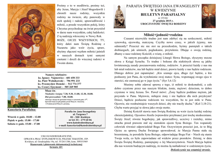Prośmy o to w modlitwie, prośmy też, aby Jezus, Maryja i Józef błogosławili i chronili nasze rodziny, wszystkie rodziny na świecie, aby panowały w nich spokój i radość, sprawiedliwość i miłość, a przede wszystkim pokój, który Chrystus przychodząc na świat przyniósł w darze nam wszystkim, całej ludzkości. Z tą nadzieją wkroczmy w Nowy Rok. BOŻE, OJCZE WSZYSTKICH, TY, który dałeś nam Świętą Rodzinę z Nazaretu jako wzór życia, spraw, abyśmy złączeni węzłem miłości jaśnieli w naszych domach tymi samymi cnotami i doszli do wiecznej radości w Twoim domu. ________________________________________________________________________________ Numery telefonów: ks. Ignacy Najmowicz – 601 650 333 ks. Piotr Wolnikowski – 796 991 233 ks. Przemysław Demski – 512 774 377 ks. Cezary Ejsymont – 505 269 905 Msze św. Niedziele i święta: 7.30, 9.30, 11.00, 12.30, 18.00. Dni powszednie: 7.00, 18.00. Adoracja i okazja do spowiedzi świętej w czawartek godz. 1700. Spowedź święta na pół godziny przed Mszą św. wieczorną i 15 minut przed Mszą św. poranną. Kancelaria Parafialna: Parafiaśw.JanaEwangelisty ul.Targowa7 82–500Kwidzyn nrtel.55–2796006 www.katedrakwidzyn.pl e-mail:[email protected] Wtorek w godz. 10.00 – 12.00 Piątek w godz. 15.00 – 17.00 Sobota w godz. 15.00 – 17.00 USŁUGI KSEROGRAFICZNE, OPRAWA PRAC DYPLOMOWYCH, PISANIE TEKSTÓW, ITP. Kwidzyn, ul. Grudziądzka 14a, tel. 55/2611386, kom. 509351969 Skanowanie i plotowanie dokumentacji technicznej formatu A0+ PARAFIA ŚWIĘTEGO JANA EWANGELISTY W KWIDZYNIE BIULETYN PARAFIALNY nr 155/66/ 27 grudnia 2015 r. UROCZYSTOŚĆ ŚWIĘTEJ RODZINY Miłość+jedność=rodzina Czasami niezwykle trudno jest nam zdobyć się na serdeczność, miłość synowską, ojcowską, matczyną. Czyżby nowe czasy, w jakich żyjemy, nas odmieniły? Przecież nic nie stoi na przeszkodzie, byśmy pamiętali o takich drobiazgach, jak uśmiech, pogłaskanie, przytulenie. Dbając o swoją rodzinę, dbamy o nasz rodzinny Kościół, o wiarę, o miłość. Na samym początku dzisiejszej Liturgii Słowa Bożego, słyszymy mocne słowa z Księgi Syracha. Te trudne i bolesne dla niektórych słowa są jakby kwintesencją zasady poszanowania rodziny, rodziców. A przecież każdy z nas ma lub miał rodziców, ma lub będzie miał dzieci, prawie każdy z nas będzie rodzicem. Dlatego dobrze jest zapamiętać: „Kto szanuje ojca, długo żyć będzie, a kto posłuszny jest Panu, da wytchnienie swej matce: Synu, wspomagaj swego ojca w starości, nie zasmucaj go w jego życiu.” (Syr 3,6.12) Musimy sobie zdawać sprawę z tego, iż miłość to doskonałość, a całe dobro czynione przez nas naszym bliskim, żonie, mężowi. dzieciom, to dobro czynione w imię Jezusa. Św. Paweł mówi: „Żony bądźcie poddane mężom, jak przystało w Panu. Mężowie, miłujcie żony i nie bądźcie dla nich przykrymi! Dzieci, bądźcie posłuszne rodzicom we wszystkim, bo to jest miłe w Panu. Ojcowie, nie rozdrażniajcie waszych dzieci, aby nie traciły ducha.” (Kol 3,18-21). Chyba warto przyjąć te słowa jako swoje motto. Dzisiaj Kościół stawia nam Świętą Rodzinę za wzór życia każdej rodziny chrześcijańskiej. Ojcostwo Józefa (wprawdzie przybrane) jest trochę niedoceniane. Święty Józef, równie bogobojny, jak sprawiedliwy, uczciwy i rzetelny, mimo strachu przed prawem stał się ziemskim ojcem Syna Bożego. Ten wspaniały człowiek również odpowiedział Bogu Fiat. Oczywistym przecież jest, że to Bóg Ojciec za sprawą Ducha Świętego spowodował, że Maryja Panna stała się brzemienną, że porodziła Syna Bożego, odpowiadając Bogu Fiat – Niech się stanie Twoja wola, co było zapowiadane od wieków przez proroków. Dzisiaj, w dniu Święta Świętej Rodziny, pamiętajmy o Jej Macierzyństwie. Niech Maryja będzie dla nas wzorem budzącym nadzieję, że można Ją naśladować w codziennym życiu. Dokończenie na ostatniej stronie. INTENCJE MSZALNE OGŁOSZENIA DUSZPASTERSKIE Dziś przeżywamy Uroczystość Świętej Rodziny, jednakże ten dzień jest także liturgicznym wspomnieniem św. Jana Ewangelisty, patrona naszej katedry i parafii, dlatego wszystkich parafian zachęcamy do modlitwy za wstawiennictwem naszego Patrona. 2. Dziś także na godz. 17.30 do kaplicy bł. Doroty zapraszamy Wspólnotę Żywego Różańca na wymianę tajemnic. 3. Zachęcamy wszystkich do modlitwy i krótkiej adoracji Nowonarodzaonego przy naszej szopce. 4. W poniedziałek, 28 grudnia, z racji święta Świętych Młodzianków, czyli dzieci betlejemskich zamordowanych z rozkazu Heroda, podczas Mszy Świętej o godz. 18.00 błogosławieństwo niemowląt i małych dzieci. Serdecznie zapraszamy rodziców ze swoimi najmniejszymi pociechami. 5. W czwartek, 31 grudnia, zapraszamy serdecznie na nabożeństwo dziękczynno przebłagalne na zakończenie roku kalendarzowego. Początek nabożeństwa o godz. 18.00. 6. Dnia 1 stycznia, w piątek, przypada Uroczystość Świętej Bożej Rodzicielki Maryi, w tym dniu obecność na Mszy św. jest obowiązkowa. Nie będzie Mszy św. o godz. 7.30, pozostałe Msze święte według porządku niedzielnego. W tym dniu z racji uroczystości nie obowiązuje nas wstrzemięźliwość od pokarmów mięsnych. Zapraszamy wszystkich, byśmy w nowym roku prosili Pana Boga o wszelkie błogosławieństwo i łaski. 7. W tym tygodniu przypada pierwszy piątek i sobota miesiąca. Z powodu uroczystości Świętej Bożej Rodzicielki Maryi, którą będziemy przeżywać w piątek, kapłani odwiedzą swoich chorych w następnym tygodniu. W sobotę zapraszamy na nabożeństwo przebłagalne i Mszę św. wynagradzającą ku czci Niepokalnego Serca NMP na godz. 9.00. 8. Zachęcamy do zamawiania intencji na Msze św., zarówno za żywych jak i za zmarłych. 9. W każdą środę zapraszamy na nowennę i na Mszę św. we wszystkich intencjach czcicieli Matki Bożej Nieustającej Pomocy. Zachęcamy do składania int