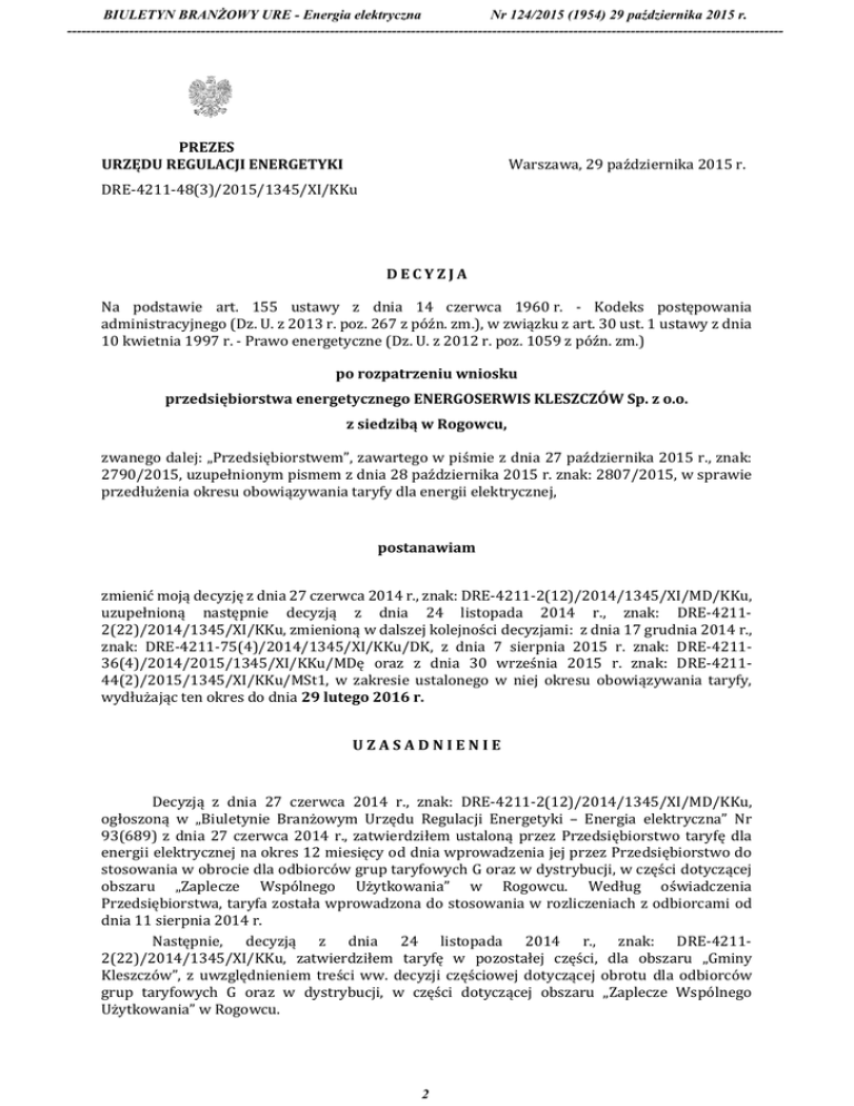 BIULETYN BRANŻOWY URE - Energia elektryczna Nr 124/2015 (1954) 29 października 2015 r. ------------------------------------------------------------------------------------------------------------------------------------------------------ PREZES URZĘDU REGULACJI ENERGETYKI Warszawa, 29 października 2015 r. DRE-4211-48(3)/2015/1345/XI/KKu DECYZJA Na podstawie art. 155 ustawy z dnia 14 czerwca 1960 r. - Kodeks postępowania administracyjnego (Dz. U. z 2013 r. poz. 267 z późn. zm.), w związku z art. 30 ust. 1 ustawy z dnia 10 kwietnia 1997 r. - Prawo energetyczne (Dz. U. z 2012 r. poz. 1059 z późn. zm.) po rozpatrzeniu wniosku przedsiębiorstwa energetycznego ENERGOSERWIS KLESZCZÓW Sp. z o.o. z siedzibą w Rogowcu, zwanego dalej: „Przedsiębiorstwem”, zawartego w piśmie z dnia 27 października 2015 r., znak: 2790/2015, uzupełnionym pismem z dnia 28 października 2015 r. znak: 2807/2015, w sprawie przedłużenia okresu obowiązywania taryfy dla energii elektrycznej, postanawiam zmienić moją decyzję z dnia 27 czerwca 2014 r., znak: DRE-4211-2(12)/2014/1345/XI/MD/KKu, uzupełnioną następnie decyzją z dnia 24 listopada 2014 r., znak: DRE-42112(22)/2014/1345/XI/KKu, zmienioną w dalszej kolejności decyzjami: z dnia 17 grudnia 2014 r., znak: DRE-4211-75(4)/2014/1345/XI/KKu/DK, z dnia 7 sierpnia 2015 r. znak: DRE-421136(4)/2014/2015/1345/XI/KKu/MDę oraz z dnia 30 września 2015 r. znak: DRE-421144(2)/2015/1345/XI/KKu/MSt1, w zakresie ustalonego w niej okresu obowiązywania taryfy, wydłużając ten okres do dnia 29 lutego 2016 r. UZASADNIENIE Decyzją z dnia 27 czerwca 2014 r., znak: DRE-4211-2(12)/2014/1345/XI/MD/KKu, ogłoszoną w „Biuletynie Branżowym Urzędu Regulacji Energetyki – Energia elektryczna” Nr 93(689) z dnia 27 czerwca 2014 r., zatwierdziłem ustaloną przez Przedsiębiorstwo taryfę dla energii elektrycznej na okres 12 miesięcy od dnia wprowadzenia jej przez Przedsiębiorstwo do stosowania w obrocie dla odbiorców grup taryfowych G oraz w dystrybucji, w części dotyczącej obszaru „Zaplecze Wspólnego Użytkowania” w Rogowcu. Według oświadczenia Przedsiębiorstwa, taryfa została wprowadzona do stosowania w rozliczeniach z odbiorcami od dnia 11 sierpnia 2014 r. Następnie, decyzją z dnia 24 listopada 2014 r., znak: DRE-42112(22)/2014/1345/XI/KKu, zatwierdziłem taryfę w pozostałej części, dla obszaru „Gminy Kleszczów”, z uwzględnieniem treści ww. decyzji częściowej dotyczącej obrotu dla odbiorców grup taryfowych G oraz w dystrybucji, w części dotyczącej obszaru „Zaplecze Wspólnego Użytkowania” w Rogowcu. 2 BIULETYN BRANŻOWY URE - Energia elektryczna Nr 124/2015 (1954) 29 października 2015 r. ------------------------------------------------------------------------------------------------------------------------------------------------------ W dalszej kolejności, decyzją z dnia 17 grudnia 2014 r., znak: DRE-421175(4)/2014/1345/XI/KKu/DK, zatwierdziłem zmianę taryfy zakresie wysokości stawki jakościowej dla poszczególnych grup taryfowych. Decyzją z dnia 7 sierpnia 2015 r. znak: DRE-4211-36(4)/2014/2015/1345/XI/KKu/MDę, zatwierdziłem zmianę taryfy w zakresie przedłużenia okresu jej obowiązywania do dnia 30 września 2015 r. Następnie, decyzją z dnia 30 września 2015 r. znak: DRE-421144(2)/2015/1345/XI/KKu/MSt1 zatwierdziłem zmianę taryfy w zakresie przedłużenia okresu jej obowiązywania do dnia 31 października 2015 r. Pismem z dnia 27 października 2015 r., znak: 2790/2015, uzupełnionym pismem z dnia 28 października 2015 r. znak: 2807/2015, Przedsiębiorstwo wystąpiło z wnioskiem o przedłużenie okresu obowiązywania taryfy dla energii elektrycznej w dystrybucji i obrocie dla grup taryfowych G do dnia 29 lutego 2016 r. Przedłużenie okresu obowiązywania taryfy umożliwi Przedsiębiorstwu uwzględnienie w nowej taryfie stawek i opłat wynikających z nowozatwierdzonych taryf jego dostawców na rok 2016. Zgodnie z art. 155 Kodeksu postępowania administracyjnego, decyzja ostateczna, na mocy której strona nabyła prawo, może być w każdym czasie za zgodą strony uchylona lub zmieniona przez organ administracji publicznej, który ją wydał, jeżeli przepisy szczególne nie sprzeciwiają się uchyleniu lub zmianie takiej decyzji i przemawia za tym interes społeczny lub słuszny interes strony. Zważywszy, iż w niniejszej sprawie uznałem, że zostały spełnione przesłanki określone w powyższym przepisie, umożliwiające zmianę decyzji, postanowiłem orzec, jak w sentencji. Niemniej jednak nie zwalnia to Przedsiębiorstwa z obowiązku wystąpienia w roku bieżącym o korektę taryfy w zakresie stawek opłaty przejściowej i opłaty OZE obowiązujących w roku 2016. POUCZENIE 1. Od niniejszej decyzji przysługuje odwołanie do Sądu Okręgowego w Warszawie - Sądu Ochrony Konkurencji i Konsumentów, za moim pośrednictwem, w terminie dwutygodniowym od dnia jej doręczenia (art. 30 ust. 2 i 3 ustawy - Prawo energetyczne oraz art. 47946 pkt 1 i art. 47947 § 1 Kodeksu postępowania cywilnego). 2. Odwołanie od decyzji powinno czynić zadość wymaganiom przepisanym dla pisma procesowego oraz zawierać oznaczenie zaskarżonej decyzji i wartości przedmiotu sporu, przytoczenie zarzutów, zwięzłe ich uzasadnienie, wskazanie dowodów, a także zawierać wniosek o uchylenie albo o zmianę decyzji w całości lub w części (art. 479 49 Kodeksu postępowania cywilnego). 3. Stosownie do art. 47 ust. 3 pkt 1 w związku z art. 31 ust. 3 pkt 2 ustawy – Prawo energetyczne, niniejsza decyzja zostanie skierowana do ogłoszenia w „Biuletynie Branżowym Urzędu Regulacji Energetyki – Energia elektryczna”. Z upoważnienia Prezesa Urzędu Regulacji Energetyki /-/ Adam Dobrowolski Dyrektor Departamentu Rynków Energii Elektrycznej i Ciepła Otrzymuje: 1. ENERGOSERWIS KLESZCZÓW Sp. z o.o. ul. Instalacyjna 2, 97-427 Rogowiec 2. aa Niniejsza decyzja zwolniona jest z opłaty skarbowej – art. 4 ustawy