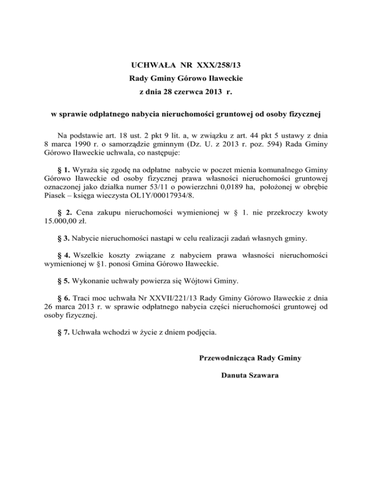 UCHWAŁA NR XXX/258/13 Rady Gminy Górowo Iławeckie z dnia 28 czerwca 2013 r. w sprawie odpłatnego nabycia nieruchomości gruntowej od osoby fizycznej Na podstawie art. 18 ust. 2 pkt 9 lit. a, w związku z art. 44 pkt 5 ustawy z dnia 8 marca 1990 r. o samorządzie gminnym (Dz. U. z 2013 r. poz. 594) Rada Gminy Górowo Iławeckie uchwala, co następuje: § 1. Wyraża się zgodę na odpłatne nabycie w poczet mienia komunalnego Gminy Górowo Iławeckie od osoby fizycznej prawa własności nieruchomości gruntowej oznaczonej jako działka numer 53/11 o powierzchni 0,0189 ha, położonej w obrębie Piasek – księga wieczysta OL1Y/00017934/8. § 2. Cena zakupu nieruchomości wymienionej w § 1. nie przekroczy kwoty 15.000,00 zł. § 3. Nabycie nieruchomości nastąpi w celu realizacji zadań własnych gminy. § 4. Wszelkie koszty związane z nabyciem prawa własności nieruchomości wymienionej w §1. ponosi Gmina Górowo Iławeckie. § 5. Wykonanie uchwały powierza się Wójtowi Gminy. § 6. Traci moc uchwała Nr XXVII/221/13 Rady Gminy Górowo Iławeckie z dnia 26 marca 2013 r. w sprawie odpłatnego nabycia części nieruchomości gruntowej od osoby fizycznej. § 7. Uchwała wchodzi w życie z dniem podjęcia. Przewodnicząca Rady Gminy Danuta Szawara