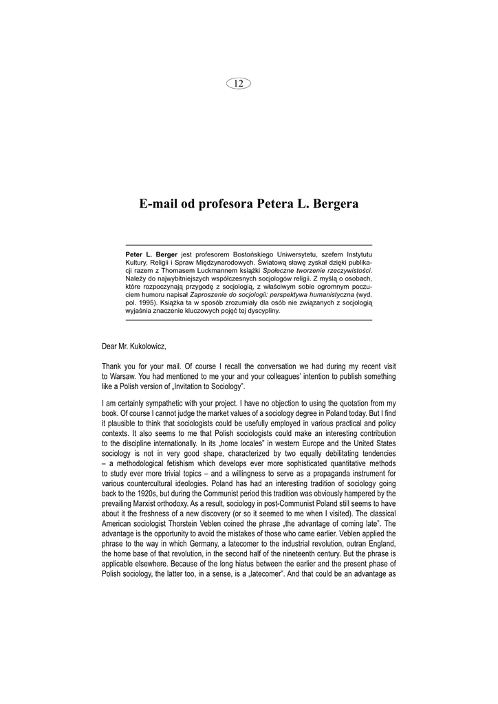 12 E-mail od profesora Petera L. Bergera Peter L. Berger jest profesorem Bostońskiego Uniwersytetu, szefem Instytutu Kultury, Religii i Spraw Międzynarodowych. Światową sławę zyskał dzięki publikacji razem z Thomasem Luckmannem książki Społeczne tworzenie rzeczywistości. Należy do najwybitniejszych współczesnych socjologów religii. Z myślą o osobach, które rozpoczynają przygodę z socjologią, z właściwym sobie ogromnym poczuciem humoru napisał Zaproszenie do socjologii: perspektywa humanistyczna (wyd. pol. 1995). Książka ta w sposób zrozumiały dla osób nie związanych z socjologią wyjaśnia znaczenie kluczowych pojęć tej dyscypliny. Dear Mr. Kukolowicz, Thank you for your mail. Of course I recall the conversation we had during my recent visit to Warsaw. You had mentioned to me your and your colleagues’ intention to publish something like a Polish version of „Invitation to Sociology”. I am certainly sympathetic with your project. I have no objection to using the quotation from my book. Of course I cannot judge the market values of a sociology degree in Poland today. But I find it plausible to think that sociologists could be usefully employed in various practical and policy contexts. It also seems to me that Polish sociologists could make an interesting contribution to the discipline internationally. In its „home locales” in western Europe and the United States sociology is not in very good shape, characterized by two equally debilitating tendencies – a methodological fetishism which develops ever more sophisticated quantitative methods to study ever more trivial topics – and a willingness to serve as a propaganda instrument for various countercultural ideologies. Poland has had an interesting tradition of sociology going back to the 1920s, but during the Communist period this tradition was obviously hampered by the prevailing Marxist orthodoxy. As a result, sociology in post-Communist Poland still seems to have about it the freshness of a new discovery (or so it seemed to me when I visited). The classical American sociologist Thorstein Veblen coined the phrase „the advantage of coming late”. The advantage is the opportunity to avoid the mistakes of those who came earlier. Veblen applied the phrase to the way in which Germany, a latecomer to the industrial revolution, outran England, the home base of that revolution, in the second half of the nineteenth century. But the phrase is applicable elsewhere. Because of the long hiatus between the earlier and the present phase of Polish sociology, the latter too, in a sense, is a „latecomer”. And that could be an advantage as E-mail od prof. Petera L. Bergera 13 against the somewhat decadent sociology of America and „old Europe”. Who knows – perhaps the Durkheims and Webers of the first half of the twenty-first century will come from Poland ! I wish you well. Let me know how the project proceeds. Cordially, Peter Berger From: Peter L. Berger <[email protected]> Date: Tue, Jan 29, 2008 at 11:29 PM Subject: Polish „Invitation” „Zaproszenie” To: [email protected] Szanowny Panie Kukołowicz! Dziękuję za Pański e-mail. Oczywiście, pamiętam rozmowę, którą odbyliśmy podczas mojej ostatniej wizyty w Warszawie. Wspomniał Pan wtedy o zamiarze wydania przez Pana i Pana kolegów czegoś w rodzaju polskiej wersji Zaproszenia do socjologii. Życzę powodzenia w pracy nad Waszym projektem. Nie mam nic przeciwko wykorzystaniu cytatu z mojej książki. Oczywiście, nie mogę ocenić rynkowej wartości wykształcenia socjologicznego w Polsce dzisiaj. Ale wydaje mi się prawdopodobne, że socjologowie mogliby okazać się pożyteczni w wielu kontekstach praktycznych oraz przy opracowywaniu programów i posunięć politycznych. Wydaje mi się także, że polscy socjologowie mogliby wnieść wiele do tej dyscypliny w skali międzynarodowej. W swoich ośrodkach w Europie Zachodniej i w Stanach Zjednoczonych socjologia nie jest w zbyt dobrej formie; charakteryzują ją dwie równie wyniszczające tendencje – fetyszyzm metodologiczny, który coraz bardziej wyrafinowane metody ilościowe stosuje do studiowania coraz bardziej trywialnych zagadnień, i chęć używania socjologii jako instrumentu propagandy różnorodnych ideologii kontrkulturowych. Polska ma interesującą tradycję socjologiczną sięgającą lat dwudziestych, jednak w czasach komunistycznych ta tradycja była w sposób oczywisty skrępowana przez dominującą marksistowską ortodoksję. W rezultacie socjologia w postkomunistycznej Polsce nadal ma w sobie, jak się wydaje, świeżość odkrycia (przynajmniej tak wydawało mi się w czasie mojej wizyty). Klasyk amerykańskiej socjologii Thorstein Veblen ukuł zwrot „korzyść z przychodzenia później”. Przewaga ta jest szansą na uniknięcie błędów poprzedników. Veblen odniósł to określenie do sposobu, w jaki Niemcy, które późno dołączyły do rewolucji przemysłowej, prześcignęły Anglię, główny ośrodek tej rewolucji, w drugiej połowie XIX wieku. I to mogłaby być przewaga [socjologii polskiej] nad dość dekadencką socjologią uprawianą w Ameryce i „starej Europie”. Kto wie, być może nowi Durkheimowie i Weberowie będą w pierwszej połowie XXI wieku wywodzić się z Polski. Życzę powodzenia. Dajcie znać, jak postępują prace nad projektem. Pozdrawiam serdecznie, Peter L. Berger Przekład Dominika Michalak Po co nam socjologia? Książka dla kandydatów na studia socjologiczne i studentów Rozmowy opracowali Tomasz Kukołowicz oraz Stanisław Maksymowicz, Dominika Michalak, Paula Płukarska, Piotr Kowalski, Paweł Kłobukowski przy współpracy Róży Sułek Ilustracje Piotr Kosiński Instytut Socjologii Uniwersytetu Warszawskiego Fundacja na rzecz Warsztatów Analiz Socjologicznych Warszawa 2009