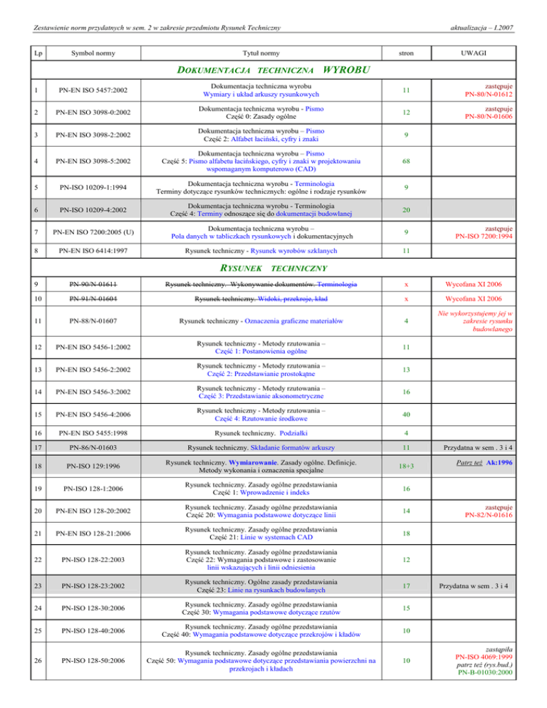 Zestawienie norm przydatnych w sem. 2 w zakresie przedmiotu Rysunek Techniczny Lp Symbol normy aktualizacja – I.2007 Tytuł normy DOKUMENTACJA TECHNICZNA stron UWAGI WYROBU 1 PN-EN ISO 5457:2002 Dokumentacja techniczna wyrobu Wymiary i układ arkuszy rysunkowych 11 zastępuje PN-80/N-01612 2 PN-EN ISO 3098-0:2002 Dokumentacja techniczna wyrobu - Pismo Część 0: Zasady ogólne 12 zastępuje PN-80/N-01606 3 PN-EN ISO 3098-2:2002 Dokumentacja techniczna wyrobu – Pismo Część 2: Alfabet łaciński, cyfry i znaki 9 4 PN-EN ISO 3098-5:2002 Dokumentacja techniczna wyrobu – Pismo Część 5: Pismo alfabetu łacińskiego, cyfry i znaki w projektowaniu wspomaganym komputerowo (CAD) 68 5 PN-ISO 10209-1:1994 Dokumentacja techniczna wyrobu - Terminologia Terminy dotyczące rysunków technicznych: ogólne i rodzaje rysunków 9 6 PN-ISO 10209-4:2002 Dokumentacja techniczna wyrobu - Terminologia Część 4: Terminy odnoszące się do dokumentacji budowlanej 20 7 PN-EN ISO 7200:2005 (U) Dokumentacja techniczna wyrobu – Pola danych w tabliczkach rysunkowych i dokumentacyjnych 9 8 PN-EN ISO 6414:1997 Rysunek techniczny - Rysunek wyrobów szklanych 11 RYSUNEK zastępuje PN-ISO 7200:1994 TECHNICZNY 9 PN-90/N-01611 Rysunek techniczny. Wykonywanie dokumentów. Terminologia x Wycofana XI 2006 10 PN-91/N-01604 Rysunek techniczny. Widoki, przekroje, kład x Wycofana XI 2006 11 PN-88/N-01607 Rysunek techniczny - Oznaczenia graficzne materiałów 4 Nie wykorzystujemy jej w zakresie rysunku budowlanego 12 PN-EN ISO 5456-1:2002 Rysunek techniczny - Metody rzutowania – Część 1: Postanowienia ogólne 11 13 PN-EN ISO 5456-2:2002 Rysunek techniczny - Metody rzutowania – Część 2: Przedstawianie prostokątne 13 14 PN-EN ISO 5456-3:2002 Rysunek techniczny - Metody rzutowania – Część 3: Przedstawianie aksonometryczne 16 15 PN-EN ISO 5456-4:2006 Rysunek techniczny - Metody rzutowania – Część 4: Rzutowanie środkowe 40 16 PN-EN ISO 5455:1998 Rysunek techniczny. Podziałki 4 17 PN-86/N-01603 Rysunek techniczny. Składanie formatów arkuszy 11 18 PN-ISO 129:1996 Rysunek techniczny. Wymiarowanie. Zasady ogólne. Definicje. Metody wykonania i oznaczenia specjalne 18+3 19 PN-ISO 128-1:2006 Rysunek techniczny. Zasady ogólne przedstawiania Część 1: Wprowadzenie i indeks 16 20 PN-EN ISO 128-20:2002 Rysunek techniczny. Zasady ogólne przedstawiania Część 20: Wymagania podstawowe dotyczące linii 14 21 PN-EN ISO 128-21:2006 Rysunek techniczny. Zasady ogólne przedstawiania Część 21: Linie w systemach CAD 18 22 PN-ISO 128-22:2003 Rysunek techniczny. Zasady ogólne przedstawiania Część 22: Wymagania podstawowe i zastosowanie linii wskazujących i linii odniesienia 12 23 PN-ISO 128-23:2002 Rysunek techniczny. Ogólne zasady przedstawiania Część 23: Linie na rysunkach budowlanych 17 24 PN-ISO 128-30:2006 Rysunek techniczny. Zasady ogólne przedstawiania Część 30: Wymagania podstawowe dotyczące rzutów 15 25 PN-ISO 128-40:2006 Rysunek techniczny. Zasady ogólne przedstawiania Część 40: Wymagania podstawowe dotyczące przekrojów i kładów 10 PN-ISO 128-50:2006 Rysunek techniczny. Zasady ogólne przedstawiania Część 50: Wymagania podstawowe dotyczące przedstawiania powierzchni na przekrojach i kładach 26 10 Przydatna w sem . 3 i 4 Patrz teŜ Ak:1996 zastępuje PN-82/N-01616 Przydatna w sem . 3 i 4 zastąpiła PN-ISO 4069:1999 patrz teŜ (rys.bud.) PN-B-01030:2000 Zestawienie norm przydatnych w sem. 2 w zakresie przedmiotu Rysunek Techniczny aktualizacja – I.2007 27 PN-EN ISO 5845-1:2002 Rysunek techniczny Przedstawianie uproszczone zespołów z częściami złącznymi Część 1: Zasady ogólne 11 28 PN-EN ISO 6433:1998 Rysunek techniczny - Oznaczanie części 6 29 PN-ISO 406:1993 Rysunek techniczny - Tolerowanie wymiarów liniowych i kątowych 7 30 PN-ISO 10578:1994 Rysunek techniczny - Tolerowanie kierunku i połoŜenia Pole zewnętrzne tolerancji 9