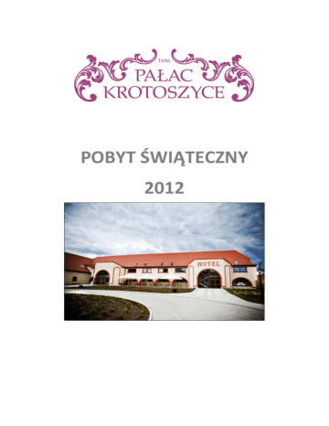 POBYT ŚWIĄTECZNY 2012 HOTEL KROTOSZYCE*** Hotel w Krotoszycach znajduje się w pierwotnych zabudowaniach folwarcznych Pałacu Krotoszyce przy ul. Parkowej 3. Stanowi kompleks bankietowo - konferencyjny, oferujący 59 miejsc noclegowych w miłych i gustownie urządzonych pokojach o standardzie hotelu trzygwiazdkowego. Do dyspozycji Gości oddajemy pokoje 1-, 2- i 3-osobowe. W cenie pobytu hotel oferuje wstęp na basen, do jacuzzi i łaźni parowej. Za dodatkową opłatą można skorzystać z saunarium ( sauna fińska, sauna bio, jacuzzi ) oraz z masaży i zabiegów na ciało. Do Zespołu Pałacowo - Parkowego należy zabytkowy park. Na jego obszarze (6 ha) rosną wiekowe platany, kasztanowce oraz dęby szypułkowe. Na szczególną uwagę zasługuje liczący około 350 lat platan klonolistny. www.palackrotoszyce.pl RESTAURACJA Zapraszamy do naszej restauracji, która jest czynna codziennie ,a jej bogate i smaczne menu zaspokoi najbardziej wyrafinowane oczekiwania Gości. Bar zaskoczy Państwa szeroką gamą koktajli bezalkoholowych i alkoholowych. Smakoszom win oferujemy pełną szafę niezwykłych ich gatunków, a desery zadowolą nawet najbardziej wymagające podniebienia. W sali restauracyjnej o powierzchni 200m2 zorganizujemy dla Państwa uroczystość dla 80 osób. Aranżacja wnętrza jest połączeniem tradycji z nowoczesnością. Loże w kolorze maliny i bar z pikowanym frontem oraz sklepienia krzyżowe i kolumny nadają restauracji romantyczny klimat. Do restauracji należy rozległy ogródek z widokiem na piękny zabytkowy park. www.palackrotoszyce.pl Pobyt świąteczny od 24.12.2012 do 26.12.2012 399,00 zł od osoby 24.12.2012 r. - kolacja wigilijna - nocleg w pokoju dwuosobowym w Hotelu Krotoszyce*** Menu Przystawka Śledź w oleju, śmietanie i w musztardzie Zupa Barszcz czerwony z uszkami Danie główne Karp smażony Pierogi z kapusta i grzybami Groch z kapustą Deser Kutia Makowiec piernik kompot z suszu 25.12.2012 r. - śniadanie - obiadokolacja - nocleg w pokoju dwuosobowym w Hotelu Krotoszyce*** Menu Zupa Krem z borowików z kluseczkami lanymi www.palackrotoszyce.pl Danie główne Polędwiczka z pieca podawana z warzywami grillowanymi ziemniakami opiekanymi i sosem pieprzowym Deser Panna cotta z malinami 25.12.2012 r. - śniadanie KONTAKT I DOJAZD Hotel Krotoszyce - Recepcja ul. Parkowa 3 59-223 Krotoszyce tel. 76 876 83 00 fax. 76 876 83 02 kom. 693 842 844, 609 565 797 Dyrektor Hotelu 668 381 099 e-mail: [email protected] [email protected] Zapraszamy wszystkich Gości, którzy zamiast gwaru i zgiełku górskich kurortów, wielkich miast wolą ciszę, spokój i obcowanie z naturą. www.palackrotoszyce.pl