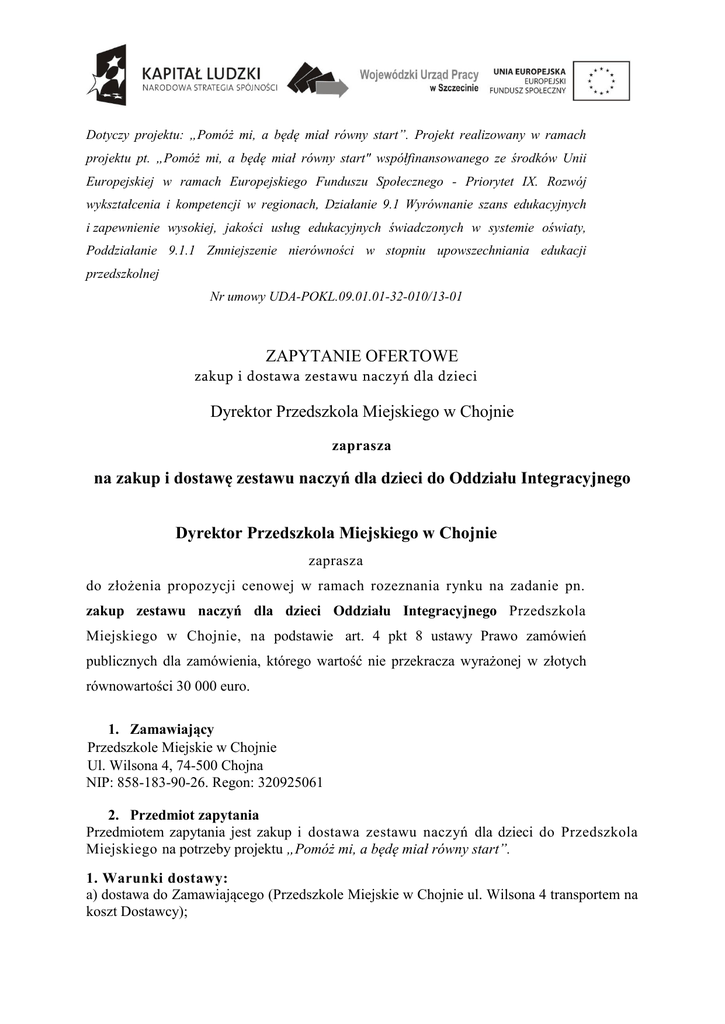 Dotyczy projektu: „Pomóż mi, a będę miał równy start”. Projekt realizowany w ramach projektu pt. „Pomóż mi, a będę miał równy start" współfinansowanego ze środków Unii Europejskiej w ramach Europejskiego Funduszu Społecznego - Priorytet IX. Rozwój wykształcenia i kompetencji w regionach, Działanie 9.1 Wyrównanie szans edukacyjnych i zapewnienie wysokiej, jakości usług edukacyjnych świadczonych w systemie oświaty, Poddziałanie 9.1.1 Zmniejszenie nierówności w stopniu upowszechniania edukacji przedszkolnej Nr umowy UDA-POKL.09.01.01-32-010/13-01 ZAPYTANIE OFERTOWE zakup i dostawa zestawu naczyń dla dzieci Dyrektor Przedszkola Miejskiego w Chojnie zaprasza na zakup i dostawę zestawu naczyń dla dzieci do Oddziału Integracyjnego Dyrektor Przedszkola Miejskiego w Chojnie zaprasza do złożenia propozycji cenowej w ramach rozeznania rynku na zadanie pn. zakup zestawu naczyń dla dzieci Oddziału Integracyjnego Przedszkola Miejskiego w Chojnie, na podstawie art. 4 pkt 8 ustawy Prawo zamówień publicznych dla zamówienia, którego wartość nie przekracza wyrażonej w złotych równowartości 30 000 euro. 1. Zamawiający Przedszkole Miejskie w Chojnie Ul. Wilsona 4, 74-500 Chojna NIP: 858-183-90-26. Regon: 320925061 2. Przedmiot zapytania Przedmiotem zapytania jest zakup i dostawa zestawu naczyń dla dzieci do Przedszkola Miejskiego na potrzeby projektu „Pomóż mi, a będę miał równy start”. 1. Warunki dostawy: a) dostawa do Zamawiającego (Przedszkole Miejskie w Chojnie ul. Wilsona 4 transportem na koszt Dostawcy); b) dostawa po cenach brutto określonych przez Dostawcę dla każdego asortymentu zgodnie ze złożoną ofertą. c) zapłata za dostawę przelewem w terminie 14 dni od daty otrzymania faktury; d) dostawa w ciągu 10 dni od złożonego zamówienia; 3. Szczegółowy opis przedmiotu zamówienia: Według załącznika nr 1 i 2 do oferty 4. Sposób przygotowania oferty Oferta powinna być: - opatrzona pieczątką firmową. - posiadać datę sporządzenia. - zawierać adres łub siedzibę oferenta, numer telefonu, numer NIP. 1. 2. 3. 4. 5. 6. 5. Miejsce oraz termin składania ofert Oferta powinna być przesłana za pośrednictwem: poczty elektronicznej na adres: [email protected], faksem na nr: (91) 414-38-36, pocztą, kurierem, lub też dostarczona osobiście na adres: Przedszkole Miejskie w Chojnie ul. Wilsona 4 74-500 Chojna (pokój Dyrektora Przedszkola) do dnia 11 marca 2015r.do godz. 15: 00 Decyduje data wpływu do Przedszkola Miejskiego w Chojnie nie data stempla pocztowego. Rozstrzygnięcie ofert nastąpi w terminie 1-2 dni roboczych. Oferty, które wpłyną po ww. terminie nie będą rozpatrywane. Wykonawca zostanie poinformowany telefonicznie. Oferty złożone po terminie nie będą rozpatrywane. Oferent może przed upływem terminu składania ofert zmienić lub wycofać swoją ofertę. W toku badania i oceny ofert Zamawiający może żądać od oferentów wyjaśnień dotyczących treści złożonych ofert. 6. Ocena ofert Zamawiający dokona oceny ważnych ofert na podstawie następujących kryteriów: Cena - 100% 7. Wybór najkorzystniejszej oferty O wyborze najkorzystniejszej oferty Zamawiający zawiadomi oferentów telefonicznie Dodatkowych informacji udziela Pani Dorota Stelmach tel.: (91) 414 26 50. Chojna, 2015-02-19 Załączniki : 1.Formularz ofertowy- zał. nr 1 2.Formularz asortymentowo –cenowy - zał. nr 2 -Załącznik nr 1……………………………………….. pieczęć adresowa firmy FORMULARZ OFERTOWY 1. Dane dotyczące wykonawcy: Pełna nawa Wykonawcy ……………………………………………………………................ ………………………………………………………………………………………………….. Adres siedziby…………………………………………………………………………………. NIP …………………………………….. REGON …………………………………………… Tel/FAX ………………………………… 2. Przedmiot oferty: zakup i dostawa zestawu naczyń dla dzieci do Przedszkola Miejskiego w Chojnie, ul. Wilsona 4 w ramach projektu „Pomóż mi, a będę miał równy start”, współfinansowanego ze środków Unii Europejskiej w ramach Europejskiego Funduszu Społecznego. 3. Cena oferty: Szczegółowy wykaz cen został złożony na formularzu asortymentowo – cenowym zgodnie z załącznikiem nr 2. W niniejszym formularzu należy podać cenę oferty do zapłaty przez Przedszkole Miejskie w Chojnie Cena brutto:……………....zł ( słownie:…………………………………………….zł) 4. Płatność: Zapłata realizowana będzie przelewem na konto Wykonawcy w okresie 14 dni od daty otrzymania towaru i wystawienia faktury. 5. Oświadczenia Wykonawcy do wykonania określonej działalności lub czynności, Oświadczam(y), że Wykonawca: 1. Posiada uprawnienia do wykonania określonej działalności lub czynności, jeżeli ustawy nakładają obowiązek posiadania takich uprawnień. 2. Posiada niezbędną wiedzę i doświadczenie oraz dysponuje potencjałem technicznym i osobami zdolnymi do wykonania zamówienia. 3. Oferowany asortyment zgodny z opisanym przedmiotem zamówienia. 4. Oferowana cena zawiera wszystkie koszty związane z wykonaniem przedmiotu zamówienia wraz z dostawą towaru do Zamawiającego. ________________________ Podpis Wykonawcy -Załącznik nr 2FORMULARZ ASORTYMENTOWO – CENOWY Zakup i dostawa zakup i dostawa zestawu naczyń dla dzieci do Przedszkola Miejskiego w Chojnie ul. Wilsona 4 w ramach projektu „ Pomóż mi, a będę miał równy start”, współfinansowanego ze środków Unii Europejskiej w ramach Europejskiego Funduszu Społecznego Lp. Opis materiałów papierniczych i plastycznych Liczba sztuk 1. Talerz głęboki - 17 cm, porcelana gastronomiczna ze wzmocnionymi brzegami, z zdobieniami w krasnale przystosowana do mycia w zmywarkach i stosowania w kuchenkach mi