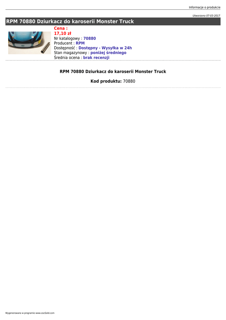Informacje o produkcie Utworzono 07-03-2017 RPM 70880 Dziurkacz do karoserii Monster Truck Cena : 17,10 zł Nr katalogowy : 70880 Producent : RPM Dostępność : Dostępny - Wysyłka w 24h Stan magazynowy : poniżej średniego Średnia ocena : brak recenzji RPM 70880 Dziurkacz do karoserii Monster Truck Kod produktu: 70880 Wygenerowano w programie www.oscGold.com