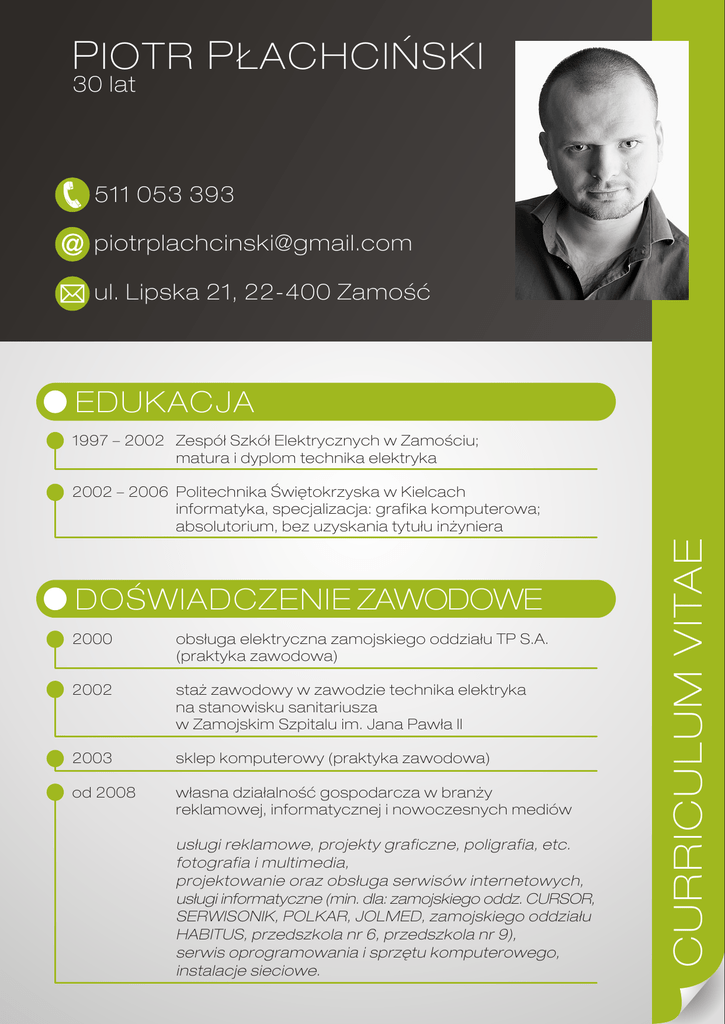 P IOTR P ŁACHCIŃSKI 30 lat 511 053 393 [email protected] ul. Lipska 21, 22-400 Zamość EDUKACJA 1997 – 2002 Zespół Szkół Elektrycznych w Zamościu; matura i dyplom technika elektryka DOŚWIADCZENIE ZAWODOWE 2000 obsługa elektryczna zamojskiego oddziału TP S.A. (praktyka zawodowa) 2002 staż zawodowy w zawodzie technika elektryka na stanowisku sanitariusza w Zamojskim Szpitalu im. Jana Pawła II 2003 sklep komputerowy (praktyka zawodowa) od 2008 własna działalność gospodarcza w branży reklamowej, informatycznej i nowoczesnych mediów usługi reklamowe, projekty graficzne, poligrafia, etc. fotografia i multimedia, projektowanie oraz obsługa serwisów internetowych, usługi informatyczne (min. dla: zamojskiego oddz. CURSOR, SERWISONIK, POLKAR, JOLMED, zamojskiego oddziału HABITUS, przedszkola nr 6, przedszkola nr 9), serwis oprogramowania i sprzętu komputerowego, instalacje sieciowe. CURRICULUM VITAE 2002 – 2006 Politechnika Świętokrzyska w Kielcach informatyka, specjalizacja: grafika komputerowa; absolutorium, bez uzyskania tytułu inżyniera DZIAŁALNOŚĆ DYDAKTYCZNA prowadzenie szkoleń i wykładów z zakresu informatyki, grafiki komputerowej oraz fotografii dla: 2009 Zamojskie Towarzystwo Brata Alberta kurs informatyczny kurs fotograficzny 2009 Gimnazjum nr 5 w Zamościu system CMS – zastosowanie i obsługa 2009 Europejskie Centrum Kształcenia „Eureka” kurs grafiki komputerowej kurs Corel Draw od 2009 Zamojska Grupa Fotograficzna poszerzanie wiedzy z zakresu fotografii klasycznej i cyfrowej oraz współczesnych technik fotograficznych 2010 – 2011 Zespół Szkół Katolickich św. Ojca Pio w Zamościu wykłady o tematyce fotograficznej CURRICULUM VITAE UMIEJĘTNOŚCI biegła obsługa komputera: środowisko Windows, programy biurowe, graficzne, księgowo-fiskalne i inne podstawowa znajomość systemów uniksowych znajomość sprzętu komputerowego klasy PC oraz sieci komputerowych programowanie: C++ (i podobne), PHP, SQL (i podobne), programowanie obiektowe, HTML, CSS, JAVA SCRIPT, inne umiejętność zarządzania hostingami, domenami i aplikacjami sieciowymi znajomość języka angielskiego (poziom średni) prawo jazdy kategorii B (od 2000 r.) opanowanie technik fotograficznych, zmysł estetyczny, kreacja wizualna koordynowanie działań grupy, organizacja wydarzeń i spotkań tematycznych ZAINTERESOWANIA fotografia w tym również tworzenie i organizacja pracy Zamojskiej Grupy Fotograficznej gotowanie ze szczególnym uwielbieniem kuchni włoskiej nowoczesne technologie z branży IT oraz multimediów, nowinki motoryzacyjne, wiedza popularno-naukowa Niniejszym wyrażam dobrowolnie zgodę na przetwarzanie danych osobowych zawartych w moim CV do celów związanych z procesem rekrutacji zgodnie z ustawą z dn. 29.08.97 roku o Ochronie Danych osobowych (Dz. Ust. Nr 133 poz. 883).