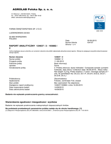 AGROLAB Polska Sp. z. o. o. Ul. Balonna 1, 08-530 Deblin, Polska tel.: +48 81 883 09 65, fax: +48 81 880 18 62 eMail: [email protected] FARMA ŚWIĘTOKRZYSKA SP. Z O.O. LUDWINOWSKA 20/304 02-856 WARSZAWA POLSKA RAPORT ANALITYCZNY 124637 / 2 - 193882 / 2 Data Numer klienta Strona 1 z 4 18-09-2015 104107 Cyfra znajdująca się po ukośniku za numerem zlecenia lub próbki odpowiada aktualnej wersji raportu. Wersja ta zastępuje wszystkie dotychczasowe wersje raportu. Numer zlecenia Numer próbki Przyjęcie próby Pobranie próby Uprawa Oznakowanie próby 124637 / 2 193882 / 2 11-09-2015 Brak informacji. Dynia 2. Próbka zbiorcza: dynia hokkaido/ Composite sample: pumpkin hokkaido, data zbioru/ Collection date: 08.09.2015r., Masa netto/ Net weight: 5,2 kg, Próba średnia z 7 sztuk / Average sample of 7 arts, Nr partii/Batch No: 04.2.D, 04.7.P, 04.8.R, 04.8.S, 04.8.T, 04.9.W, 04.4.J Próbkobiorca Opakowanie Stan próbki Zastąpiono raport analityczny Data rozpoczęcia badań Data zakończenia badań Zleceniodawca Foliowe, zamknięte/ Foil, closed Bez zastrzeŜeń/ No objections 124637/193882 z dnia 16.09.2015 14/09/2015 16/09/2015 Badanie nie wykazało przekroczenia granicy oznaczalności. Stwierdzenie zgodności /niezgodności wyników Badanie nie wykazało przekroczenia maksymalnych dopuszczalnych limitów. Na podstawie przebadanych parametrów próbka nadaje się do obrotu handlowego. [1] [1] Załącznik II Rozporządzenia (EC) Nr 396/2005 z dnia 23.02.2005 r., zmienione przez Rozporządzenie (EC) Nr 1101/2015 AGROLAB Polska Sp. z. o. o. Ul. Balonna 1, 08-530 Deblin, Polska tel.: +48 81 883 09 65, fax: +48 81 880 18 62 eMail: [email protected] Data Numer klienta Strona 2 z 4 18-09-2015 104107 RAPORT ANALITYCZNY Numer zlecenia / Numer próbki 124637 / 2 / 193882 / 2 Niniejszy raport analityczny w wersji 2 zastępuje wszystkie dotychczasowe raporty analityczne WYSTAWIŁ: AGROLAB Polska mgr Izabela Beczek, Tel. +48/818830965 Biuro obsługi klienta AUTORYZOWAŁ: mgr Izabela Lubińska, Kierownik Pracowni Analiz Fizyko-chemicznych mgr Katarzyna Wiśniewska, Kierownik Pracowni Analiz Instrumentalnych Raport dotyczy badań wyłącznie opisanej próbki. Czas badania odpowiada czasowi między datą przyjęcia próby, a datą wystawienia raportu. Przy próbach nieznanego pochodzenia jest moŜliwe sprawdzenie wiarygodności tylko w niektórych przypadkach. Bez pisemnej zgody laboratorium raport nie powinien być powielany inaczej, jak tylko w całości. Załącznik jest integralną częścią raportu. AGROLAB Polska Sp. z. o. o. Ul. Balonna 1, 08-530 Deblin, Polska tel.: +48 81 883 09 65, fax: +48 81 880 18 62 eMail: [email protected] Data Numer klienta Strona 3 z 4 RAPORT ANALITYCZNY Numer zlecenia / Numer próbki 18-09-2015 104107 124637 / 2 / 193882 / 2 Załącznik - lista przebadanych pestycydów Badania wykonano metodą QuEChERS PN-EN 15662:2008 substancja czynna 2-Phenylphenol Numer CAS LOQ mg/ kg substancja czynna Numer CAS LOQ mg/ kg substancja czynna Numer CAS LOQ mg/ kg 90-43-7 0.01 4,4`-Dibromobenzophenone 101007-06-1 0.01 Aldrin Bifenox 42576-02-3 0.01 Bifenthrin 82657-04-3 0.01 Biphenyl (Diphenyl) Boscalid 188425-85-6 0.01 Bromocyclen 1715-40-8 0.01 Bromophos-ethyl 18181-80-1 0.01 Butoksylan piperonylu 51-03-6 0.01 133-06-2 0.02 Carbophenothion 786-19-6 0.01 Acrinathrin Bromophos-methyl 2104-96-3 0.01 Brompropylat Captafol 01-06-2425 0.04 Captan 02-03-3988 0.01 Aclonifen 74070-46-5 0.01 309-00-2 0.005 Benfluralin 1861-40-1 0.01 92-52-4 0.01 4824-78-6 0.01 Carbophenothion-methyl 953-17-3 0.01 Carbosulfan 55285-14-8 0.01 Chlorbensid 103-17-3 0.01 Chlorbenzilat 510-15-6 0.01 Chlorbufam 1967-16-4 0.01 Chlordan-alfa 5103-71-9 0.005 Chlordan-gamma 5103-74-2 0.005 Chlordan-oxy 27304-13-8 0.005 Chlorfenapyr 122453-73-0 0.01 Chlorfenprop-methyl 14437-17-3 0.01 Chlorfenson 80-33-1 0.01 Chlorflurenol 2464-37-1 0.01 Chlorflurenol-methyl 2536-31-4 0.01 Chlormephos 24934-91-6 0.01 Chloroneb 2675-77-6 0.01 Chlorprofam 101-21-3 0.01 Chlorpropylat 02-10-5836 0.01 Chlorpyrifos 2921-88-2 0.01 Chlorpyrifos-methyl 5598-13-0 0.01 Chlorthal-dimethyl 1861-32-1 0.01 Chlorthalonil 1897-45-6 0.01 Chlorthion 500-28-7 0.01 Chlorthiophos 60238-56-4 0.01 Chlozolinat 84332-86-5 0.01 Cyanophos 2636-26-2 0.01 Cyfluthrin 68359-37-5 0.01 Cyhalofop-butyl 122008-85-9 0.01 Cyhalothrin 68085-85-8 0.01 Cypermethrin 52315-07-8 0.01 Deltamethrin 52918-63-5 0.01 Desmetryn 1014-69-3 0.01 Dichlobenil 1194-65-6 0.01 Dichlofenthion 97-17-6 0.01 Dichlofluanid 1085-98-9 0.01 Dichlorvos 62-73-7 0.01 Diclobutrazol 75736-33-3 0.01 60-57-1 0.005 Dicloran 99-30-9 0.01 Dicofol 115-32-2 0.01 Dieldrin Difenyloamina 122-39-4 0.01 Diklofop-metyl 51338-27-3 0.01 Dioxabenzofos 3811-49-2 0.01 Endosulfan alpha 959-98-8 0.005 Endosulfan beta 33213-65-9 0.005 Endosulfansulfat 1031-07-8 0.005 Endrin 72-20-8 0.005 EPN 2104-64-5 0.01 Etaconazol 60207-93-4 0.01 Ethalfluralin 55283-68-6 0.01 Ethoksyquina 91-53-2 0.02 Etridiazol 2593-15-9 0.01 Famoxadon 131807-57-3 0.01 Fenchlorphos 299-84-3 0.01 Fenfluthrin 75867-00-4 0.01 122-14-5 0.01 39515-41-8 0.01 Fenson 80-38-6 0.01 0.01 Fenpropathrin Fenvalerat / Esfenvalerat (Summe RS/ SR-Isomere) 0.01 Fluchloralin 33245-39-5 0.01 Flucythrinat 70124-77-5 0.01 Flumetralin 62924-70-3 0.01 Flumioxazin 103361-09-7 0.01 Fluotrimazol 31251-03-3 0.01 Flurochloridon 61213-25-0 0.01 Folpet 133-07-3 0.02 298-02-2 0.01 Genite 97-16-5 0.01 Halfenprox 111872-58-3 0.01 Fenitrothion Fenvalerat / Esfenvalerat (Suma RR- / / SS-Isomere) Forat HCH-alpha HCH-epsilon 319-84-6 0.005 HCH-beta 319-85-7 0.005 HCH-delta 319-86-8 0.005 07-10-6108 0.01 HCH-gamma (Lindan) 58-89-9 0.005 Heptachlor 76-44-8 0.005 0.005 Heptachlorepoxid-cis 1024-57-3 0.005 Heptachlorepoxid-trans 28044-83-9 0.005 Hexachlorobenzol (HCB) 118-74-1 Iodofenphos 18181-70-9 0.01 Iprodion 36734-19-7 0.01 Izodrin 465-73-6 0.01 lambda-Cyhalothrin 91465-08-6 0.01 Leptophos 21609-90-5 0.01 Methoxychlor 72-43-5 0.005 Mirex 2385-85-5 0.005 Naled 300-76-5 0.01 Nitralin 4726-14-1 0