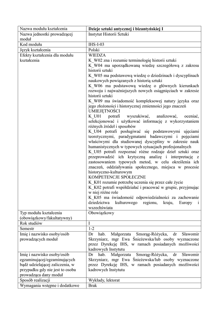 Nazwa modułu kształcenia Nazwa jednostki prowadzącej moduł Kod modułu Język kształcenia Efekty kształcenia dla modułu kształcenia Typ modułu kształcenia (obowiązkowy/fakultatywny) Rok studiów Semestr Imię i nazwisko osoby/osób prowadzących moduł Imię i nazwisko osoby/osób egzaminującej/egzaminujących bądź udzielającej zaliczenia, w przypadku gdy nie jest to osoba prowadząca dany moduł Sposób realizacji Wymagania wstępne i dodatkowe Dzieje sztuki antycznej i bizantyńskiej I Instytut Historii Sztuki IHS-I-03 Polski WIEDZA K_W02 zna i rozumie terminologię historii sztuki K_W04 ma uporządkowaną wiedzę szczegółową z zakresu historii sztuki K_W05 ma podstawową wiedzę o dziedzinach i dyscyplinach naukowych powiązanych z historią sztuki K_W06 ma podstawową wiedzę o głównych kierunkach rozwoju i najważniejszych nowych osiągnięciach w zakresie historii sztuki K_W09 ma świadomość kompleksowej natury języka oraz jego złożoności i historycznej zmienności jego znaczeń UMIEJĘTNOŚCI K_U01 potrafi wyszukiwać, analizować, oceniać, selekcjonować i użytkować informację z wykorzystaniem różnych źródeł i sposobów K_U04 potrafi posługiwać się podstawowymi ujęciami teoretycznymi, paradygmatami badawczymi i pojęciami właściwymi dla studiowanej dyscypliny w zakresie nauk humanistycznych w typowych sytuacjach profesjonalnych K_U05 potrafi rozpoznać różne rodzaje dzieł sztuki oraz przeprowadzić ich krytyczną analizę i interpretację z zastosowaniem typowych metod, w celu określenia ich znaczeń, oddziaływania społecznego, miejsca w procesie historyczno-kulturowym KOMPETENCJE SPOŁECZNE K_K01 rozumie potrzebę uczenia się przez całe życie K_K02 potrafi współdziałać i pracować w grupie, przyjmując w niej różne role K_K05 ma świadomość odpowiedzialności za zachowanie dziedzictwa kulturowego regionu, kraju, Europy i wszechświata Obowiązkowy I 1-2 Dr hab. Małgorzata Smorąg-Różycka, dr Sławomir Skrzyniarz, mgr Ewa Śnieżewska/lub osoby wyznaczone przez Dyrekcję IHS, w ramach posiadanych możliwości kadrowych Instytutu Dr hab. Małgorzata Smorąg-Różycka, dr Sławomir Skrzyniarz, mgr Ewa Śnieżewska/lub osoby wyznaczone przez Dyrekcję IHS, w ramach posiadanych możliwości kadrowych Instytutu Wykłady, lektorat Brak Liczba godzin zajęć dydaktycznych wymagających bezpośredniego udziału nauczyciela akademickiego i studentów, gdy w danym module przewidziane są takie zajęcia Liczba punktów ECTS przypisana modułowi Bilans punktów ECTS Stosowane metody dydaktyczne Metody sprawdzania i oceny efektów kształcenia uzyskanych przez studentów Forma i warunki zaliczenia modułu, w tym zasady dopuszczenia do egzaminu, zaliczenia, a także forma i warunki zaliczenia poszczególnych zajęć wchodzących w zakres danego modułu Treści modułu kształcenia Wykłady 90 godzin, lektorat 120 godzin 17 Historia sztuki wczesnochrześcijańskiej i bizantyńskiej cz. I (obowiązkowy wykład na zaliczenie warunkujący przystąpienie do egzaminu na II roku studiów) – 3 pkt Historia sztuki starożytnej Grecji i Rzymu (obowiązkowy wykład z egzaminem) – 7 pkt Język łaciński (lektorat z egzaminem) – 7 pkt Wykłady bogato ilustrowane zdjęciami, z wykorzystaniem zasobów biblioteki IHS UJ, bibliotek cyfrowych i intermediów, konsultacje; lektorat Egzaminy z Historii sztuki starożytnej Grecji i Rzymu sprawdzające opanowanie podstawowych informacji z zakresu sztuki starożytnej. Egzamin składa się z 2 części: pisemnej w formie testu oraz odpowiedzi ustnej. Zaliczenie testu warunkuje dopuszczenie do części ustnej, niezaliczenie testu jest równoznaczne z oceną negatywną z całego egzaminu. Test jest zaliczony po uzyskaniu przez studenta min. 50% + 1 pkt. Kolokwia oraz egzamin końcowy z języka łacińskiego. Aktywne uczestnictwo we wszystkich zajęciach. W 2. sem. I roku odbywa się pierwsza część wykładu z Historii sztuki wczesnochrześcijańskiej i bizantyńskiej kończąca się zaliczeniem, warunkującym przystąpienie do egzaminu na II roku studiów. Całość wykładu zakończona jest egzaminem w sesji zimowej na II roku studiów (patrz moduł Dzieje sztuki antycznej i bizantyńskiej II). Zdanie trzech egzaminów z Historii sztuki wczesnochrześcijańskiej i bizantyńskiej, Historii sztuki starożytnej Grecji i Rzymu, oraz Języka łacińskiego. Student ma obowiązek przeczytać całą literaturę przedmiotu podaną przez wykładowców. Zadaniem modułu jest wykształcenie w studentach umiejętności badania tradycji antycznych w sztuce Europy łacińskiej od upadku Cesarstwa Rzymskiego do czasów współczesnych. Zajęcia mają dać podstawową wiedzę na temat sztuki klasycznej i trwania rozwiązań klasycznych w Bizancjum, a także oddziaływania tej tradycji na Europę łacińską szczególnie w okresie średniowiecza. Studenci poznają główne zagadnienia sztuki starożytnej i bizantyńskiej analizując język „klasycznych” form na przykładach konkretnych dzieł sztuki, uczą się także analizy treści dzieł sztuki antycznej i bizantyńskie. Omawia się znaczenie języka łacińskiego i badań filologicznych w genezie historii sztuki, rolę badań epigraficznych etc. Analizuje się na konkretnych przykładach słownictwo stosowane w opisach dzieł sztuki i rozbudowuje umiejętności studentów w zakresie etymologii Wykaz literatury podstawowej i uzupełniającej, obowiązującej do zaliczenia danego modułu Metody i kryteria oceniania Wymiar, zasady i forma odbywania praktyk, w przypadku, gdy program kształcenia przewiduje praktyki Moduł obejmuje następujące przedmioty: 1. Historia sztuki wczesnochrześcijańskiej i bizantyńskiej (obowiązkowy wykład na zaliczenie, warunkujący przystąpienie do egzaminu na II roku studiów) cz. I 2. Historia sztuki starożytnej Grecji i Rzymu (obowiązkowy wykład z egzaminem) 3. Język łaciński (lektorat z egzaminem) Określone w tabelach