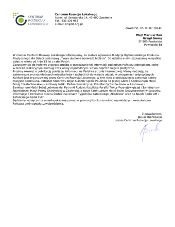 Centrum Rozwoju Lokalnego Adres: ul. Senatorska 14, 42-400 Zawiercie Tel.: 533 421 953 e-mail: [email protected] Zawiercie, dn. 03.07.2014r. Wójt Mariusz Reń Urząd Gminy 37-500 Pawłosiów Pawłosiów 88 W imieniu Centrum Rozwoju Lokalnego informujemy, że została ogłoszona II edycja Ogólnopolskiego Konkursu Plastycznego dla Dzieci pod nazwą „Twoja ulubiona opowieść biblijna”. Do udziału w nim zapraszamy wszystkie dzieci w wieku od 4 do 13 lat z całej Polski. Zwracamy się do Państwa z gorącą prośbą o przekazanie tej informacji podległym Państwu jednostkom, które w okresie wakacyjnym animują czas wolny najmłodszym, w tym poprzez zajęcia plastyczne. Prosimy również o publikację poniższej informacji na Państwa stronie internetowej. Mamy nadzieję, że zainteresuje ona najmłodszych mieszkańców i zachęci ich do wzięcia udziału w zmaganiach artystycznych. Konkurs jest organizowany przez Centrum Rozwoju Lokalnego. W tym roku przedsięwzięciu patronują cztery maryjnie sanktuaria. Patronat honorowy objął: Klasztor Ojców Paulinów na Jasnej Górze i Sanktuarium Matki Bożej Częstochowskiej – Królowej Polski. Partnerami akcji są: Klasztor Ojców Paulinów w Leśniowie i Sanktuarium Matki Bożej Leśniowskiej Patronki Rodzin; Katolicka Parafia Trójcy Przenajświętszej i Sanktuarium Najświętszej Maryi Panny Skarżyckiej w Zawierciu, a także Sanktuarium Matki Bożej Szczyrkowskiej w Szczyrku. Informacje o konkursie można śledzić na łamach Tygodnika Katolickiego „Niedziela” oraz na falach Radia eM i Katolickiego Radia FIAT. Będziemy wdzięczni za wszelką okazaną pomoc w promocji konkursu wśród najmłodszych mieszkańców Państwa gminy/powiatu/województwa. Z poważaniem, Janusz Bieńkowski prezes Centrum Rozwoju Lokalnego Informacja o konkursie: Centrum Rozwoju Lokalnego zaprasza do udziału w II edycji Ogólnopolskiego Konkursu Plastycznego dla Dzieci pn. „Twoja ulubiona opowieść biblijna”. Konkurs skierowany jest do dzieci w wieku 4-13 lat z całej Polski. Zwycięzcy konkursu otrzymają tablety, a ich prace zostaną opublikowane w wyjątkowym kalendarzu na rok 2015. Dochód ze sprzedaży publikacji zostanie przekazany na realizację prorodzinnych inicjatyw społecznych. Aby wziąć udział w artystycznych zmaganiach, należy wykonać pracę plastyczną przedstawiającą ulubioną scenę ze Starego lub Nowego Testamentu. Prace konkursowe – wykonane dowolną techniką – na arkuszu papieru w formacie A-4, w orientacji poziomej, należy przesyłać do 15 sierpnia 2014 r. na adres Centrum Rozwoju Lokalnego, ul. Senatorska 14, 42-400 Zawiercie lub dostarczyć osobiście w dni robocze w godz. 7.00-15.00 pod wskazany adres. Do każdej pracy należy dołączyć: formularz zgłoszeniowy i oświadczenie opiekuna prawnego uczestnika konkursu. W tym roku patronat honorowy nad konkursem objął Klasztor Ojców Paulinów na Jasnej Górze i Sanktuarium Matki Bożej Częstochowskiej - Królowej Polski. Partnerami akcji są: Klasztor Ojców Paulinów w Leśniowie i Sanktuarium Matki Bożej Leśniowskiej Patronki Rodzin; Katolicka Parafia Trójcy Przenajświętszej i Sanktuarium Najświętszej Maryi Panny Skarżyckiej w Zawierciu, Sanktuarium Matki Bożej Szczyrkowskiej w Szczyrku. Organizator przy realizacji konkursu współpracuje również ze Stowarzyszeniem Zbója Szczyrka. Patronat medialny nad konkursem objęli: Tygodnik Katolicki „Niedziela”, Radio eM oraz Katolickie Radio FIAT. Więcej informacji o konkursie (w tym regulamin konkursu oraz formularze zgłoszeniowe) dostępnych jest na stronie internetowej www.crl.org.pl lub u osoby koordynującej: Aleksandra Kubas-Chojna, tel. 535 080 573, e-mail: [email protected].