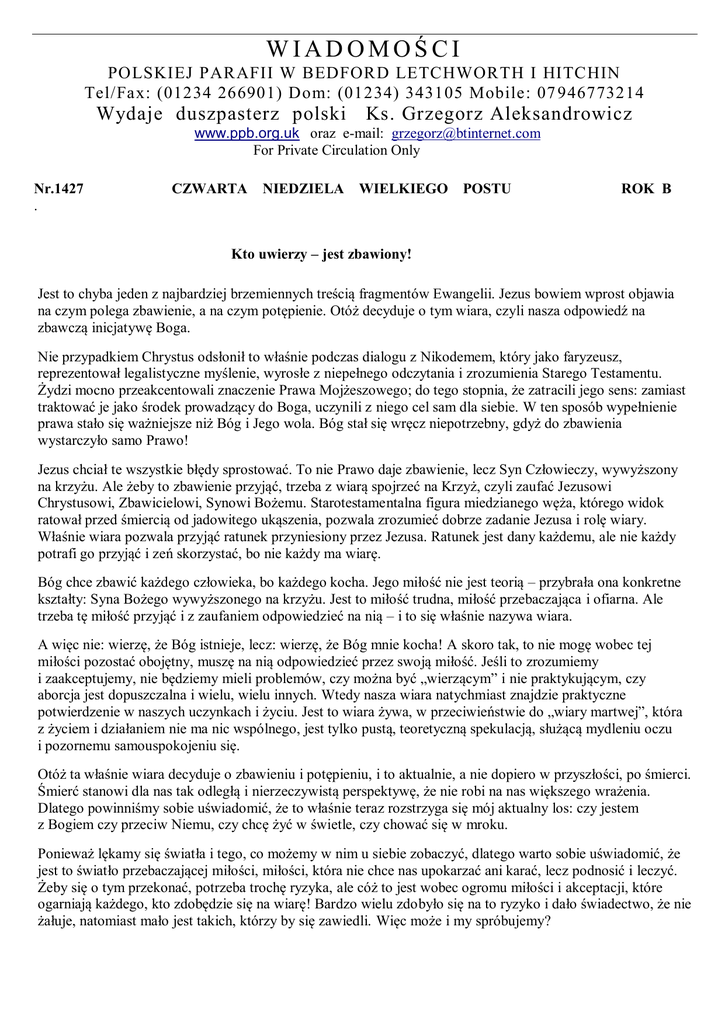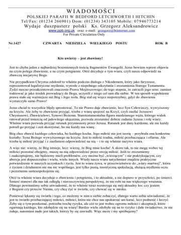 WIADOMOŚCI POLSKIEJ PARAFII W BEDFORD LETCHWORTH I HITCHIN Tel/Fax: (01234 266901) Dom: (01234) 343105 Mobile: 07 946773214 Wydaje duszpasterz polski Ks. Grzegorz Aleksandrowicz www.ppb.org.uk oraz e-mail: [email protected] For Private Circulation Only Nr.1427 . CZWARTA NIEDZIELA WIELKIEGO POSTU ROK B Kto uwierzy – jest zbawiony! Jest to chyba jeden z najbardziej brzemiennych treścią fragmentów Ewangelii. Jezus bowiem wprost objawia na czym polega zbawienie, a na czym potępienie. Otóż decyduje o tym wiara, czyli nasza odpowiedź na zbawczą inicjatywę Boga. Nie przypadkiem Chrystus odsłonił to właśnie podczas dialogu z Nikodemem, który jako faryzeusz, reprezentował legalistyczne myślenie, wyrosłe z niepełnego odczytania i zrozumienia Starego Testamentu. Żydzi mocno przeakcentowali znaczenie Prawa Mojżeszowego; do tego stopnia, że zatracili jego sens: zamiast traktować je jako środek prowadzący do Boga, uczynili z niego cel sam dla siebie. W ten sposób wypełnienie prawa stało się ważniejsze niż Bóg i Jego wola. Bóg stał się wręcz niepotrzebny, gdyż do zbawienia wystarczyło samo Prawo! Jezus chciał te wszystkie błędy sprostować. To nie Prawo daje zbawienie, lecz Syn Człowieczy, wywyższony na krzyżu. Ale żeby to zbawienie przyjąć, trzeba z wiarą spojrzeć na Krzyż, czyli zaufać Jezusowi Chrystusowi, Zbawicielowi, Synowi Bożemu. Starotestamentalna figura miedzianego węża, którego widok ratował przed śmiercią od jadowitego ukąszenia, pozwala zrozumieć dobrze zadanie Jezusa i rolę wiary. Właśnie wiara pozwala przyjąć ratunek przyniesiony przez Jezusa. Ratunek jest dany każdemu, ale nie każdy potrafi go przyjąć i zeń skorzystać, bo nie każdy ma wiarę. Bóg chce zbawić każdego człowieka, bo każdego kocha. Jego miłość nie jest teorią – przybrała ona konkretne kształty: Syna Bożego wywyższonego na krzyżu. Jest to miłość trudna, miłość przebaczająca i ofiarna. Ale trzeba tę miłość przyjąć i z zaufaniem odpowiedzieć na nią – i to się właśnie nazywa wiara. A więc nie: wierzę, że Bóg istnieje, lecz: wierzę, że Bóg mnie kocha! A skoro tak, to nie mogę wobec tej miłości pozostać obojętny, muszę na nią odpowiedzieć przez swoją miłość. Jeśli to zrozumiemy i zaakceptujemy, nie będziemy mieli problemów, czy można być „wierzącym” i nie praktykującym, czy aborcja jest dopuszczalna i wielu, wielu innych. Wtedy nasza wiara natychmiast znajdzie praktyczne potwierdzenie w naszych uczynkach i życiu. Jest to wiara żywa, w przeciwieństwie do „wiary martwej”, która z życiem i działaniem nie ma nic wspólnego, jest tylko pustą, teoretyczną spekulacją, służącą mydleniu oczu i pozornemu samouspokojeniu się. Otóż ta właśnie wiara decyduje o zbawieniu i potępieniu, i to aktualnie, a nie dopiero w przyszłości, po śmierci. Śmierć stanowi dla nas tak odległą i nierzeczywistą perspektywę, że nie robi na nas większego wrażenia. Dlatego powinniśmy sobie uświadomić, że to właśnie teraz rozstrzyga się mój aktualny los: czy jestem z Bogiem czy przeciw Niemu, czy chcę żyć w świetle, czy chować się w mroku. Ponieważ lękamy się światła i tego, co możemy w nim u siebie zobaczyć, dlatego warto sobie uświadomić, że jest to światło przebaczającej miłości, miłości, która nie chce nas upokarzać ani karać, lecz podnosić i leczyć. Żeby się o tym przekonać, potrzeba trochę ryzyka, ale cóż to jest wobec ogromu miłości i akceptacji, które ogarniają każdego, kto zdobędzie się na wiarę! Bardzo wielu zdobyło się na to ryzyko i dało świadectwo, że nie żałuje, natomiast mało jest takich, którzy by się zawiedli. Więc może i my spróbujemy? MSZE ŚWIĘTE I NABOŻEŃSTWA w BEDFORD: Charity Reg.No.1119423 Niedziela,15.03.2015 CZWARTA NIEDZIELA WIELKIEGO POSTU ( Rok B ) Godz. 9.30 - za dusze ś.p. Kazimierza Borowskiego w 5-tą rocznicę śmierci i ś.p. rodziców Borowskich - int. Pani Ewy Borowskiej. Godz.11.00 - za dusze ś.p.Józefa Karaś w 10-tą rocznicę śmierci – int. córki z rodziną. Godz.19.00 - za dusze ś.p. Iwony Pilarczyk - int. córki. Poniedziałek, 16.03. Godz. 9.30 - za dusze ś.p. Gwen Kiedrowskiej. Wtorek, 17.03.2015 Godz. 9.30 - Intencja wolna. Środa, 18.03.2015 Godz.19.00 -O błog.Boże i potrzebne łaski dla Andrzeja z okazji urodzin - int.żony z rodziną Czwartek,19.03.2015 UROCZYSTOŚĆ ŚWIĘTEGO JÓZEFA OBLUBIEŃCA NMP Godz. 9.30 - za dusze ś.p. Mariana Chocian w rocznicę śmierci - int. żony Krystyny. Piątek, 20.03.2015 Godz.15.00 - DROGA KRZYŻOWA Godz.15.30 - Intencja wolna. Koronka do Miłosierdzia Bożego. Godz.19.00 - Intencja wolna DROGA KRZYŻOWA. Sobota, 21.03.2015 Godz. 9.30 - Intencja wolna. Godz.10.00 - ADORACJA NAJŚWIETSZEGO SAKRAMENTU. Godz.19.00 - Intencja wolna. Niedziela,22.03.2015 PIĄTA NIEDZIELA WIELKIEGO POSTU ( Rok B ) Godz. 9.30 - za dusze ś.p. rodziców Józefy i Jana Stankiewiczów - int. Pani J.Szyszko. Godz.11.00 - za dusze ś.p. Anieli Kobylarz - int. wnuków. Godz.19.00 - Intencja wolna. CHRZEST ŚW.: W naszym kościele w Bedford Sakrament Chrztu Swiętego otrzymali CYPRIAN WOJDA i FRANCISZEK MICHAŁ LIGĘZA w niedzielę 8 marca 2015 r. Nowo ochrzczonym dzieciom i ich rodzicom życzymy błogosławieństwa i opieki Bożej. OGŁOSZENIA PARAFIALNE: 1. Witamy w naszej parafii w Bedford nowego księdza – KS. CEZARY KOMOSIŃSKI, który będzie pomagał w naszej parafii a jednocześnie będzie odpowiedzialny za duszpasterstwo dla Polaków zamieszkałych w Letchworth, Baldock, Royston, Hitchin, Stevenage, Welwyn Garden City i Hatfield na terenie Archidiecezji Westminster. Ksiądz zamieszka w The Vicarage w naszym kościele w Bedford. 2. Ofiary zebrane w naszym kościele przy żłóbku stajenki Betlejemskiej w okresie świąt Bożego Narodzenia wyniosły Ł 202.41 i zostały przeznaczone na cele charytatywne 3. Obecnie w okresie Wielkiego Postu zbierane są dobr
