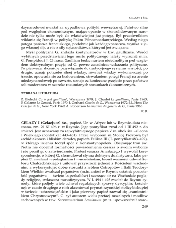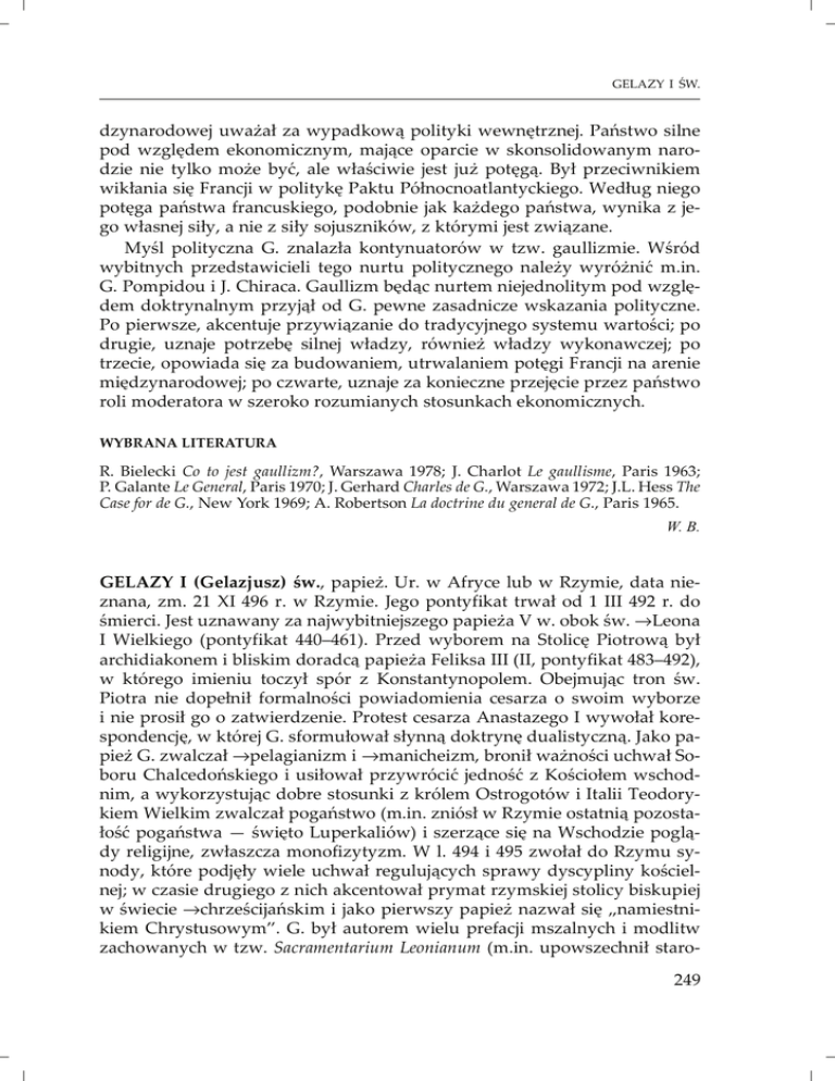 GELAZY I ŚW. dzynarodowej uważał za wypadkowa˛ polityki wewne˛trznej. Państwo silne pod wzgle˛dem ekonomicznym, maja˛ce oparcie w skonsolidowanym narodzie nie tylko może być, ale właściwie jest już pote˛ga˛. Był przeciwnikiem wikłania sie˛ Francji w polityke˛ Paktu Północnoatlantyckiego. Według niego pote˛ga państwa francuskiego, podobnie jak każdego państwa, wynika z jego własnej siły, a nie z siły sojuszników, z którymi jest zwia˛zane. Myśl polityczna G. znalazła kontynuatorów w tzw. gaullizmie. Wśród wybitnych przedstawicieli tego nurtu politycznego należy wyróżnić m.in. G. Pompidou i J. Chiraca. Gaullizm be˛da˛c nurtem niejednolitym pod wzgle˛dem doktrynalnym przyja˛ł od G. pewne zasadnicze wskazania polityczne. Po pierwsze, akcentuje przywia˛zanie do tradycyjnego systemu wartości; po drugie, uznaje potrzebe˛ silnej władzy, również władzy wykonawczej; po trzecie, opowiada sie˛ za budowaniem, utrwalaniem pote˛gi Francji na arenie mie˛dzynarodowej; po czwarte, uznaje za konieczne przeje˛cie przez państwo roli moderatora w szeroko rozumianych stosunkach ekonomicznych. WYBRANA LITERATURA R. Bielecki Co to jest gaullizm?, Warszawa 1978; J. Charlot Le gaullisme, Paris 1963; P. Galante Le General, Paris 1970; J. Gerhard Charles de G., Warszawa 1972; J.L. Hess The Case for de G., New York 1969; A. Robertson La doctrine du general de G., Paris 1965. W. B. GELAZY I (Gelazjusz) św., papież. Ur. w Afryce lub w Rzymie, data nieznana, zm. 21 XI 496 r. w Rzymie. Jego pontyfikat trwał od 1 III 492 r. do śmierci. Jest uznawany za najwybitniejszego papieża V w. obok św. →Leona I Wielkiego (pontyfikat 440–461). Przed wyborem na Stolice˛ Piotrowa˛ był archidiakonem i bliskim doradca˛ papieża Feliksa III (II, pontyfikat 483–492), w którego imieniu toczył spór z Konstantynopolem. Obejmuja˛c tron św. Piotra nie dopełnił formalności powiadomienia cesarza o swoim wyborze i nie prosił go o zatwierdzenie. Protest cesarza Anastazego I wywołał korespondencje˛, w której G. sformułował słynna˛ doktryne˛ dualistyczna˛. Jako papież G. zwalczał →pelagianizm i →manicheizm, bronił ważności uchwał Soboru Chalcedońskiego i usiłował przywrócić jedność z Kościołem wschodnim, a wykorzystuja˛c dobre stosunki z królem Ostrogotów i Italii Teodorykiem Wielkim zwalczał pogaństwo (m.in. zniósł w Rzymie ostatnia˛ pozostałość pogaństwa — świe˛to Luperkaliów) i szerza˛ce sie˛ na Wschodzie pogla˛dy religijne, zwłaszcza monofizytyzm. W l. 494 i 495 zwołał do Rzymu synody, które podje˛ły wiele uchwał reguluja˛cych sprawy dyscypliny kościelnej; w czasie drugiego z nich akcentował prymat rzymskiej stolicy biskupiej w świecie →chrześcijańskim i jako pierwszy papież nazwał sie˛ „namiestnikiem Chrystusowym”. G. był autorem wielu prefacji mszalnych i modlitw zachowanych w tzw. Sacramentarium Leonianum (m.in. upowszechnił staro249 GELAZY I ŚW. rzymskie wezwanie Kyrie eleison, zwane niekiedy Błaganiem G.), mylnie natomiast jest uważany za autora Dekretu, który pochodzi z VI w., i Sakramentarza G., autorstwa duchownego rzymskiego z VII w. WAŻNIEJSZE PRACE 60 listów, 50 fragmentów i 6 traktatów teologicznych pomieszczonych w: A. Thiel Epistulae Pontificum Romanorum, Braunsberg 1868; S. Löwenfeld Epistula Pontificum Romanorum ineditae, London 1885. Fragm. listów G. w: H. Rahner (red.) Kościół i państwo we wczesnym chrześcijaństwie, Warszawa 1986. Spór o granice działań chrześcijańskiego →państwa i chrześcijańskiego →Kościoła, tocza˛cy sie˛ przez cały V w., znalazł zwieńczenie w dwóch konkurencyjnych koncepcjach: dualistycznej, zwia˛zanej z imieniem G., oraz →bizantyjskiej, →cezaropapieskiej, która˛ z reguły ła˛czy sie˛ z osoba˛ cesarza →Justyniana I. G., świadom stylu myślenia cesarzy wschodnich, nawia˛zuja˛cych do tradycji rzymskich, lecz posiłkuja˛cych sie˛ także wzorcami hellenistycznymi, wskazywał, że cesarz — be˛da˛c synem, a nie zwierzchnikiem Kościoła — winien w sprawach wiary uczyć sie˛, a nie nauczać, ponieważ nie do niego należy prymat nauczycielski w Kościele. Z nadania Boskiego cesarz ma przywileje w sprawach państwa, lecz nie w sprawach należa˛cych do Kościoła; nie moga˛c uzurpować sobie niczego, co byłoby sprzeczne „z nakazami porza˛dku niebiańskiego”, winien powstrzymywać sie˛ przed wkraczaniem w dziedzine˛ przez samego Boga zastrzeżona˛ dla Kościoła przezeń ustanowionego. Ów zakaz i jego podstawe˛ wskazał G. mówia˛c otwarcie, że to „Bóg chciał, aby do kapłanów należało kierowanie Kościołem, a nie do władzy świeckiej, która jeśli jest prawowierna, winna podług woli Bożej być podległa swojemu Kościołowi i jego kapłanom” (H. Rahner, op.cit., s. 166). Formuła →św. Ambrożego, zgodnie z która˛ to, co poświe˛cone bezpośrednio Bogu, nie podlega jurysdykcji cesarskiej, oraz teza →św. Augustyna, iż pokój ustanawiany przez władców świeckich jest zaledwie zacza˛tkiem rzeczywistego pokoju, znalazły dopełnienie w wypowiedzi G. Przywołuja˛c rzymska˛ dystynkcje˛ mówił już o dwóch rza˛dza˛cych światem siłach: władzy cesarzy oraz „uświe˛conym →autorytecie biskupów”, którzy przed sa˛dem Bożym zdaja˛ sprawe˛ także za królów. Wspominał, że chrześcijańscy władcy, działaja˛cy w zakresie beneficjum udzielonego przez Boga, winni podporza˛dkować sie˛ normom wia˛ża˛cym chrześcijan i zdać sie˛ na osa˛d duchownych, których zwia˛zek ze Stwórca˛ rzeczywistości jest szczególnie bliski. Wedle G., prymatowi nauczycielskiemu, z którego moga˛ korzystać jedynie obdarzeni →autorytetem biskupi, winna towarzyszyć zwierzchność jurysdykcyjna w obre˛bie Kościoła, rozcia˛gaja˛ca sie˛ w szczególności na duchownych wyła˛czonych z kre˛gu poddanych jurysdykcji cesarskiej. Istnienie 250 GELAZY I ŚW. niezależn