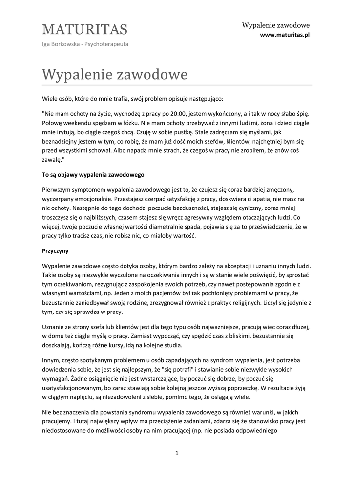 Wypalenie zawodowe MATURITAS www.maturitas.pl Iga Borkowska - Psychoterapeuta Wypalenie zawodowe Wiele osób, które do mnie trafia, swój problem opisuje następująco: "Nie mam ochoty na życie, wychodzę z pracy po 20:00, jestem wykończony, a i tak w nocy słabo śpię. Połowę weekendu spędzam w łóżku. Nie mam ochoty przebywać z innymi ludźmi, żona i dzieci ciągle mnie irytują, bo ciągle czegoś chcą. Czuję w sobie pustkę. Stale zadręczam się myślami, jak beznadziejny jestem w tym, co robię, że mam już dość moich szefów, klientów, najchętniej bym się przed wszystkimi schował. Albo napada mnie strach, że czegoś w pracy nie zrobiłem, że znów coś zawalę." To są objawy wypalenia zawodowego Pierwszym symptomem wypalenia zawodowego jest to, że czujesz się coraz bardziej zmęczony, wyczerpany emocjonalnie. Przestajesz czerpać satysfakcję z pracy, doskwiera ci apatia, nie masz na nic ochoty. Następnie do tego dochodzi poczucie bezduszności, stajesz się cyniczny, coraz mniej troszczysz się o najbliższych, czasem stajesz się wręcz agresywny względem otaczających ludzi. Co więcej, twoje poczucie własnej wartości diametralnie spada, pojawia się za to przeświadczenie, że w pracy tylko tracisz czas, nie robisz nic, co miałoby wartość. Przyczyny Wypalenie zawodowe często dotyka osoby, którym bardzo zależy na akceptacji i uznaniu innych ludzi. Takie osoby są niezwykle wyczulone na oczekiwania innych i są w stanie wiele poświęcić, by sprostać tym oczekiwaniom, rezygnując z zaspokojenia swoich potrzeb, czy nawet postępowania zgodnie z własnymi wartościami, np. Jeden z moich pacjentów był tak pochłonięty problemami w pracy, że bezustannie zaniedbywał swoją rodzinę, zrezygnował również z praktyk religijnych. Liczył się jedynie z tym, czy się sprawdza w pracy. Uznanie ze strony szefa lub klientów jest dla tego typu osób najważniejsze, pracują więc coraz dłużej, w domu też ciągle myślą o pracy. Zamiast wypocząć, czy spędzić czas z bliskimi, bezustannie się doszkalają, kończą różne kursy, idą na kolejne studia. Innym, często spotykanym problemem u osób zapadających na syndrom wypalenia, jest potrzeba dowiedzenia sobie, że jest się najlepszym, że "się potrafi" i stawianie sobie niezwykle wysokich wymagań. Żadne osiągnięcie nie jest wystarczające, by poczuć się dobrze, by poczuć się usatysfakcjonowanym, bo zaraz stawiają sobie kolejną jeszcze wyższą poprzeczkę. W rezultacie żyją w ciągłym napięciu, są niezadowoleni z siebie, pomimo tego, że osiągają wiele. Nie bez znaczenia dla powstania syndromu wypalenia zawodowego są również warunki, w jakich pracujemy. I tutaj największy wpływ ma przeciążenie zadaniami, zdarza się że stanowisko pracy jest niedostosowane do możliwości osoby na nim pracującej (np. nie posiada odpowiedniego 1 Wypalenie zawodowe MATURITAS www.maturitas.pl Iga Borkowska - Psychoterapeuta przeszkolenia), nieadekwatne wynagrodzenie pracownika do wkładu pracy, niejasne lub wygórowane oczekiwania, brak pochwał. Jak leczyć wypalenie zawodowe? Kiedy objawy wypalenia zawodowego utrzymują się przez kilka miesięcy lub nasilają się, tzn. - odczuwasz chroniczne zmęczenie, - masz poczucie wyobcowania, - twoje relacje z najbliższymi się pogarszają, - towarzyszy ci poczucie pustki, - masz objawy depresji to znaczy, że doszedłeś do etapu, kiedy pomoc specjalisty - psychoterapeuty jest niezbędna. Psychoterapia będzie polegała na zdiagnozowaniu i zmianie schematów w twoim myśleniu, które przyczyniły się do wypalenia. Schematy te tworzą się na podstawie wcześniejszych doświadczeń. Tak jak stwierdzenie, że ziemia jest okrągła, podobnie za słuszne i oczywiste przyjmujemy treści zawarte w schematach. Przykładem takiego schematu często posiadanego przez osoby narażone na wypalenie zawodowe jest: "jeśli nie odnoszę sukcesu zawodowego, nie zasługuję na szacunek" lub "jestem wartościowy, tylko jeśli inni ludzie mnie cenią" lub "muszę zawsze dawać z siebie wszystko". Tego typu schematy kształtują każdy dzień - być może miałbyś ochotę na poczytanie luźnej książki wieczorem, ale schemat kieruje twoimi decyzjami, wobec tego zaczynasz przeglądać artykuły z twojej branży - twoje potrzeby nie mają znaczenia, liczy się to, co zapewni ci uznanie wśród otoczenia. Podczas psychoterapii zdasz sobie sprawę, jakie dysfunkcyjne schematy myślenia posiadasz, a następnie wspólnie z terapeutą zastąpisz je zdrowszym sposobem myślenia. 2