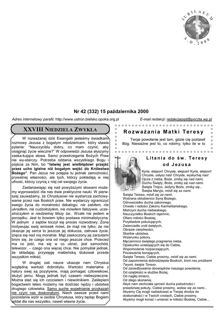 NR 42 (332)/1 15 października 2000 r. PO GÓRACH, DOLINACH... Nr 42 (332) 15 października 2000 Adres internetowy parafii: http://www.ustron.bielsko.opoka.org.pl XXVIII NIEDZIELA ZWYKŁA W rozwaŜanej dziś Ewangelii jesteśmy świadkami rozmowy Jezusa z bogatym młodzieńcem, który stawia pytanie: “Nauczycielu dobry, co mam czynić, aby osiągnąć Ŝycie wieczne?” W odpowiedzi Jezusa słyszymy zaska-kujące słowa. Samo przestrzeganie BoŜych Praw nie wy-starczy. Potrzeba oddania wszystkiego Bogu i pójścia za Nim, bo “łatwiej jest wielbłądowi przejść przez ucho igielne niŜ bogatym wejść do Królestwa BoŜego”. Pan Jezus nie potępia tu jednak zamoŜności, prywatnej własności, ale tych, którzy pokładają w niej ufność, którzy czynią z niej cel swojego Ŝycia. Zastanawiając się nad powyŜszymi słowami moŜemy wyprowadzić dla nas dwie praktyczne nauki. W pierwszej zauwaŜamy, Ŝe Chrystusowi nie wystarcza zachowywanie przez nas Boskich praw. Nie wystarczy ograniczyć swego Ŝycia do moralności dekalogu: nie zabiłem, nie ukradłem, nie cudzołoŜyłem, nie mówiłem fałszywie, uczestniczyłem w niedzielnej Mszy św.. Wcale nie jestem w porządku. Jest to bowiem tylko postawa minimalistyczna. W jednym z sądów toczył się proces rozwodowy. śona motywując swój wniosek mówi, Ŝe mąŜ nie tylko, Ŝe nie okazuje jej serca to jeszcze jej dokucza, zatruwa Ŝycie, znęca się nad nią moralnie. MąŜ zaskoczony jej zarzutami broni się, Ŝe czego ona od niego jeszcze chce. PrzecieŜ ma co jeść, ma się w co ubrać, jest samochód, telewizor, – czego ona więcej chce. Nie pomyślał jednak, Ŝe składając przysięgę małŜeńską ślubował przede wszystkim miłość. W drugiej zaś nauce ukazuje nam Chrystus względną wartość dobrobytu. Wartości materialne z natury swej są pozytywne, mają pomagać człowiekowi, słuŜyć jemu. Mogą jednak być czasem niebezpieczne. MoŜna stać się ich czcicielem i niewolnikiem. Zaślepieni bogactwem łatwo moŜemy nie dostrzec nędzy i ubóstwa drugiego człowieka. Samo suche wypełnianie przykazań nie czyni nas doskonałymi. Niech zawsze przed nami pozostanie wzór w osobie Chrystusa, który będąc Bogiem oddał dla nas wszystko, nawet własne Ŝycie. E-mail redakcji: [email protected] RozwaŜania Matki Teresy Twoje powołanie jest tam, gdzie cię postawił Bóg. NiewaŜne jest to, co robimy, tylko ile w to Litania do św. Teresy od Jezusa Kyrie, elejson! Chryste, elejson! Kyrie, elejson! Chryste, usłysz nas! Chryste, wysłuchaj nas! Ojcze z nieba, BoŜe, zmiłuj się nad nami. Duchu Święty, BoŜe, zmiłuj się nad nami. Święta Trójco, Jedyny BoŜe, zmiłuj się... Święta Maryjo, módl się za nami. Święta Tereso, módl się za nami. Wybrana oblubienico Syna BoŜego, Odnowicielko ducha zakonnego, Chwało i radości Zakonu Karmelitańskiego, Mistrzyni ducha niebieskiego, Nauczycielko Boskich tajemnic, Ofiaro miłości Boskiej, Przykładzie pokutujących, Zwierciadło cnót świętych, Obrazie cierpliwości, Skarbie ubóstwa, Wizerunku pokory, Męczennico świętego pragnienia nieba, Opiekunko uciekających się do Ciebie, WspomoŜenie rozpaczających, Pocieszenie konających, Święta Tereso, Ciebie prosimy, módl się za nami. Od zapomnienia dobrodziejstw Boskich, broń nas prośbami Twymi, święta Tereso. Od zaniedbywania obowiązków naszego powołania, Od oziębłości w słuŜbie BoŜej, Od nagłej śmierci, Od złego skonania, Abyś nam zechciała uprosić ducha poboŜności i prawdziwej pokuty, Ciebie prosimy, wstaw się za nami... Abyśmy Cię mogli naśladować w Twojej drodze do doskonałości i w Twoich cnotach, Ciebie prosimy, Abyśmy mogli konać i umierać w miłości Boskiej, Ciebie... NR 42 (332)/2 PO GÓRACH, DOLINACH... W DUCHU PATRIOTYCZNYM DZIECIOM NA DOBRANOC Modlitwa Jaskółki CHARAKTER NARODOWY POLAKÓW A NIEPODLEGŁOŚĆ POLSKI (CZ. III) Naród na oszczerstwa i zamach na swoją wolność odpowiedział wytęŜoną pracą. Zachęcał doń Ignacy Jan Paderewski słowami: Sprawa narodu, to praca ciągła, praca stała, wytrwałość niezłomna, ofiarność nieprzerwana z pokolenia na pokolenie, zaniechać jej nigdy nie wolno. Polacy wygrali wojnę o granice, zbudowali prawdziwie demokratyczny ustrój i umoŜliwiono narodowościom wcho-dzącym w skład II Rzeczypospolitej swobodne wyznawanie wiary i rozwijanie kultury. Z trzech zaborów powstała silna struktura państwowa. Znakomici ekonomisci: Grabski i Kwiatkowski uratowali gospodarkę. Polskie produkty prze-mysłowe wygrywały konkurencję na światowych rynkach. Ze szkół odrodzonej Polski wyszli obywatele o wysokich kwalifikacjach moralnych i umysłowych. W 1939r. hitlerowskie Niemcy i bolszewicka Rosja zgodnie z wcześniejszymi planami po 6 - tygodniowej, dramatycznej i osamotnionej walce unicestwiły II Rzeczypospolitą. Polacy wykazali się męstwem i hartem ducha. Nie było wśród nich kolaborantów w rodzaju Quislinga. Stali się wzorem oporu przeciwko Niemcom. Nazywano ich najlepszymi Ŝołnierzami świata. Nie wyrzekli się ani Polskości, ani wiary w okresie podwójnej okupacji. Swoją religijnością i przywiązaniem do Kościoła Katolickiego zadziwili nawet Hansa Franka do tego stopnia, Ŝe stwierdził iŜ: “Kościół jest dla umysłów polskich centralnym punktem zbornym, który promieniuje stale w milczeniu i spełnia przez to funkcję jakby wiecznego światła“. Z wiary czerpali Polacy siłę do obrony śydów skazanych na eksterminację. Być moŜe niektórzy z nich “wdzięczni“ za ocalenie nazywają nas teraz antysemitami i ksenofobami. Komunizm wycisnął niezatarte piętno na naszym charakterze narodowym. Zaatakował przede wszystkim sumienie. Zostały podwaŜone zasady moralne - pojawiła się dwulicowość w zachowaniu Polaków. Doszło do alienacji Ŝycia społecznego, zawodowego i narodowego. Nieuczciwość, nieprawość, naduŜycia, marnotrawstwo, powszechne złodziejstwo stawało się