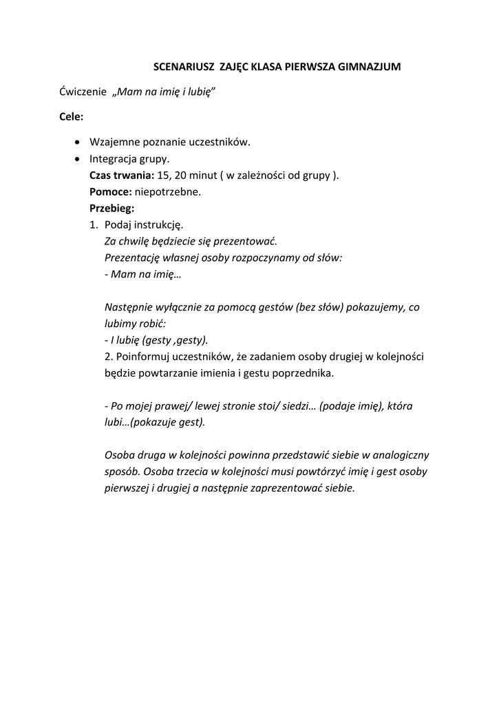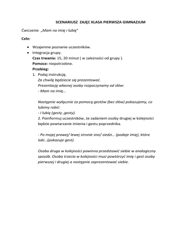 SCENARIUSZ ZAJĘC KLASA PIERWSZA GIMNAZJUM Ćwiczenie „Mam na imię i lubię” Cele: Wzajemne poznanie uczestników. Integracja grupy. Czas trwania: 15, 20 minut ( w zależności od grupy ). Pomoce: niepotrzebne. Przebieg: 1. Podaj instrukcję. Za chwilę będziecie się prezentowad. Prezentację własnej osoby rozpoczynamy od słów: - Mam na imię… Następnie wyłącznie za pomocą gestów (bez słów) pokazujemy, co lubimy robid: - I lubię (gesty ,gesty). 2. Poinformuj uczestników, że zadaniem osoby drugiej w kolejności będzie powtarzanie imienia i gestu poprzednika. - Po mojej prawej/ lewej stronie stoi/ siedzi… (podaje imię), która lubi…(pokazuje gest). Osoba druga w kolejności powinna przedstawid siebie w analogiczny sposób. Osoba trzecia w kolejności musi powtórzyd imię i gest osoby pierwszej i drugiej a następnie zaprezentowad siebie.