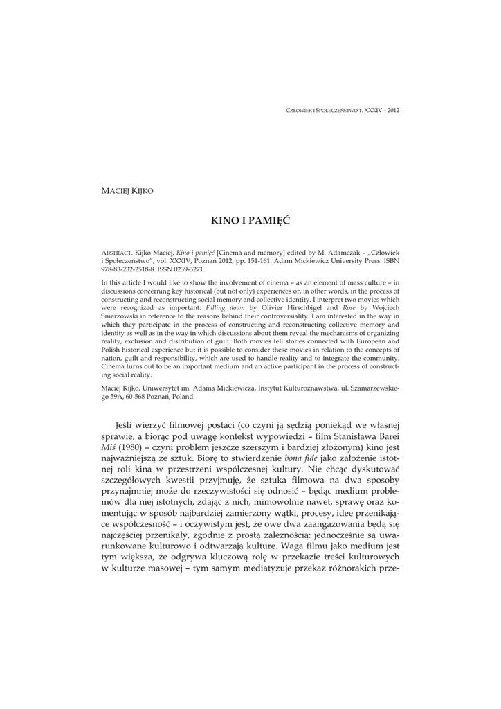 CZ'OWIEK I SPO'ECZE(STWO T. XXXIV – 2012 MACIEJ KIJKO KINO I PAMI ! ABSTRACT. Kijko Maciej, Kino i pami ! [Cinema and memory] edited by M. Adamczak – „Cz owiek i Spo ecze!stwo”, vol. XXXIV, Pozna! 2012, pp. 151-161. Adam Mickiewicz University Press. ISBN 978-83-232-2518-8. ISSN 0239-3271. In this article I would like to show the involvement of cinema – as an element of mass culture – in discussions concerning key historical (but not only) experiences or, in other words, in the process of constructing and reconstructing social memory and collective identity. I interpret two movies which were recognized as important: Falling down by Olivier Hirschbigel and Rose by Wojciech Smarzowski in reference to the reasons behind their controversiality. I am interested in the way in which they participate in the process of constructing and reconstructing collective memory and identity as well as in the way in which discussions about them reveal the mechanisms of organizing reality, exclusion and distribution of guilt. Both movies tell stories connected with European and Polish historical experience but it is possible to consider these movies in relation to the concepts of nation, guilt and responsibility, which are used to handle reality and to integrate the community. Cinema turns out to be an important medium and an active participant in the process of constructing social reality. Maciej Kijko, Uniwersytet im. Adama Mickiewicza, Instytut Kulturoznawstwa, ul. Szamarzewskiego 59A, 60-568 Pozna!, Poland. Je"li wierzy# filmowej postaci (co czyni j$ s%dzi$ poniek$d we w asnej sprawie, a bior$c pod uwag% kontekst wypowiedzi – film Stanis awa Barei Mi" (1980) – czyni problem jeszcze szerszym i bardziej z o&onym) kino jest najwa&niejsz$ ze sztuk. Bior% to stwierdzenie bona fide jako za o&enie istotnej roli kina w przestrzeni wspó czesnej kultury. Nie chc$c dyskutowa# szczegó owych kwestii przyjmuj%, &e sztuka filmowa na dwa sposoby przynajmniej mo&e do rzeczywisto"ci si% odnosi# – b%d$c medium problemów dla niej istotnych, zdaj$c z nich, mimowolnie nawet, spraw% oraz komentuj$c w sposób najbardziej zamierzony w$tki, procesy, idee przenikaj$ce wspó czesno"# – i oczywistym jest, &e owe dwa zaanga&owania b%d$ si% najcz%"ciej przenika y, zgodnie z prost$ zale&no"ci$: jednocze"nie s$ uwarunkowane kulturowo i odtwarzaj$ kultur%. Waga filmu jako medium jest tym wi%ksza, &e odgrywa kluczow$ rol% w przekazie tre"ci kulturowych w kulturze masowej – tym samym mediatyzuje przekaz ró&norakich prze- 152 Maciej Kijko kona! pomi%dzy ró&nymi poziomami kultury. W pozbawionym elitarystycznych uprzedze! ogl$dzie wida# równie&, &e tre"ci kultury masowej nie s$ koniecznie naznaczone uproszczeniem, trywializacj$, czy nakierowaniem na prosty, konsumpcjonistyczny hedonizm – w kategoriach niespecjalistycznych podejmuje si% w jej przestrzeni dyskusje o zasadniczym charakterze. Przyjmuj$c to za o&enie, zaj$# chcia bym si% dwoma filmami pokazuj$cymi – obok opowiadanej historii – istotne kwestie o charakterze antropologicznym i filozoficznym, wprowadzaj$c tym samym w przestrze! szeroko poj%tego dyskursu spo ecznego (pomijaj$c nawet warstw% dyskusji intelektualnych) zagadnienia o nie daj$cej si% zlekcewa&y# wadze, a przy tym rozstrzygane zwykle w odmienny od prezentowanego w nich sposób. Oba filmy dotykaj$ problemu pami%ci i to&samo"ci, oba te& wyznaczaj$ przestrze! swoich w asnych problemów – nie b%d% si% jednak zajmowa nimi kompleksowo, wybiórczo selekcjonuj$c i podkre"laj$c w$tki dla mnie istotne. Ka&dy z tych filmów – co w tym kontek"cie istotne – wywo a dyskusje przekraczaj$c$ swoim zasi%giem obszar osób zainteresowanych filmem wy $cznie, anga&uj$c g osy podnosz$ce kwestie ogólne. Wa&no"# ich wynika z odniesienia – nie wprost wprawdzie – do do"wiadcze!, które naznaczaj$ nasza codzienno"#. Co chcia bym jednak zastrzec, to &e nie b%d$ mnie interesowa y zasadniczo walory "ci"le filmowe owych obrazów, same jedynie idee, które mog% w nich odnale)#, czy które ilustruj$ (w zamierzony, b$d) nie, sposób). W roku 2004 wszed na ekrany film Oliviera Hirschbigela Upadek (2004). Ukazane w nim ostatnie dni Hitlera w bunkrze, w obl%&onym Berlinie, wywo a y dyskusj% dotycz$c$ pami%ci II wojny "wiatowej. G osy sprzeciwu wywo a o pokazanie g ównego sprawcy tragedii jako cz owieka, jednego z nas – g aszcz$cego ulubionego psa, zajadaj$cego ze smakiem pierogi, ale te& dotkni%tego ludzkimi s abo"ciami podesz ego wieku – kamera rejestruje mimowolne, ustawiczne dr&enie d oni. Tym, co wzbudzi o opór, jest zbli&enie postaci tradycyjnie uznawanej za odleg $ od wzorca cz owiecze!stwa, za jednego z najwi%kszych zbrodniarzy historii (by odwo a# si% do najbardziej rozpowszechnionej retoryki) do codziennego &ycia – jak gdyby (twierdzono) twórcy filmu chcieli sugerowa#, &e Hitler jest cz owiekiem takim jak my. Zarzucano im banalizowanie tragedii, sprowadzanie tego, co ca y czas wymyka si% zrozumieniu, do zdarze! o zwyczajnym wymiarze1. ________________ 1 Samo podejmowanie dyskusji w tej przestrzeni skazuje nieuchronnie na ugrz%)ni%cie w retoryce niepodwa&alnej s uszno"ci, utrwalonej w ci$gu kilkudziesi%ciu lat pos ugiwania si% ni$ – zmierzenie si% z ni$, próba podwa&enia jest ju& obarczona sporym ryzykiem. Kino i pami ! 153 Podda# dyskusji w kontek"cie tego filmu i tak zarysowanej problematyki (nie stanowi$cej wyczerpuj$cej charakterystyki obrazu) chcia bym kwestie dotycz$ce pami%ci, która tworzy si% wokó przesz ych wydarze!, mechanizmów selekcji i opracowywania tre"ci do zapami%tania, a tak&e ich wp ywu na konstruowanie to&samo"ci zbiorowej. Uporanie si% z do"wiadczeniem drugiej wojny "wiatowej – odnowienie czy odtworzenie spo ecze!stwa – wymaga o przedsi%wzi%cia szeregu dziaa! o charakterze porz$dkuj$cym. Procesy s$dowe, wymierzanie sprawiedliwo"ci i d ugoletnie w wielu przypadkach "ciganie odpowiedzialnych za wojn% to jedna z metod, inn$ jest odbudowa, najzupe niej literalnie rozumiana, "