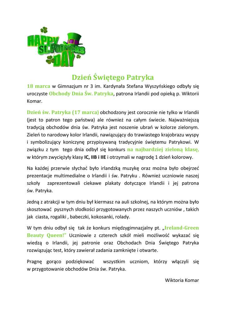 Dzień Świętego Patryka 18 marca w Gimnazjum nr 3 im. Kardynała Stefana Wyszyńskiego odbyły się uroczyste Obchody Dnia Św. Patryka, patrona Irlandii pod opieką p. Wiktorii Komar. Dzień św. Patryka (17 marca) obchodzony jest corocznie nie tylko w Irlandii (jest to patron tego państwa) ale również na całym świecie. Najważniejszą tradycją obchodów dnia św. Patryka jest noszenie ubrań w kolorze zielonym. Zieleń to narodowy kolor Irlandii, nawiązujący do trawiastego krajobrazu wyspy i symbolizujący koniczynę przypisywaną tradycyjnie świętemu Patrykowi. W związku z tym tego dnia odbył się konkurs na najbardziej zieloną klasę, w którym zwyciężyły klasy IC, IIB i IIE i otrzymali w nagrodę 1 dzień kolorowy. Na każdej przerwie słychać było irlandzką muzykę oraz można było obejrzeć prezentacje multimedialne o Irlandii i św. Patryku . Również uczniowie naszej szkoły zaprezentowali ciekawe plakaty dotyczące Irlandii i jej patrona św. Patryka. Jedną z atrakcji w tym dniu był kiermasz na auli szkolnej, na którym można było skosztować pysznych słodkości przygotowanych przez naszych uczniów , takich jak ciasta, rogaliki , babeczki, kokosanki, rolady. W tym dniu odbył się tak że konkurs międzygimnazjalny pt. „Ireland-Green Beauty Queen!” Uczniowie z czterech szkół mieli możliwość wykazać się wiedzą o Irlandii, jej patronie oraz Obchodach Dnia Świętego Patryka rozwiązując test, który zawierał zadania zamknięte i otwarte. Pragnę gorąco podziękować wszystkim uczniom, którzy włączyli się w przygotowanie obchodów Dnia św. Patryka. Wiktoria Komar