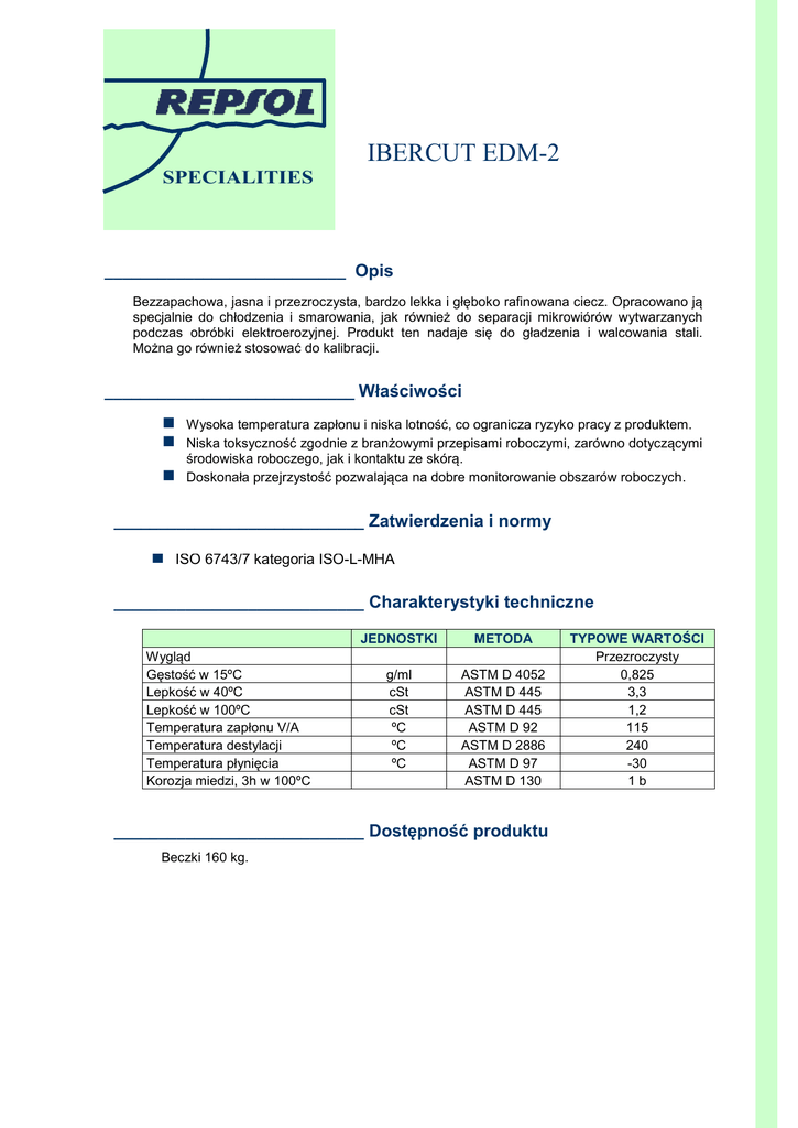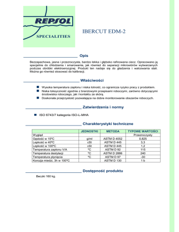 IBERCUT EDM-2 SPECIALITIES ___________________________ Opis Bezzapachowa, jasna i przezroczysta, bardzo lekka i głęboko rafinowana ciecz. Opracowano ją specjalnie do chłodzenia i smarowania, jak również do separacji mikrowiórów wytwarzanych podczas obróbki elektroerozyjnej. Produkt ten nadaje się do gładzenia i walcowania stali. Można go również stosować do kalibracji. ____________________________ Właściwości Wysoka temperatura zapłonu i niska lotność, co ogranicza ryzyko pracy z produktem. Niska toksyczność zgodnie z branżowymi przepisami roboczymi, zarówno dotyczącymi środowiska roboczego, jak i kontaktu ze skórą. Doskonała przejrzystość pozwalająca na dobre monitorowanie obszarów roboczych. ____________________________ Zatwierdzenia i normy ISO 6743/7 kategoria ISO-L-MHA ____________________________ Charakterystyki techniczne Wygląd Gęstość w 15ºC Lepkość w 40ºC Lepkość w 100ºC Temperatura zapłonu V/A Temperatura destylacji Temperatura płynięcia Korozja miedzi, 3h w 100ºC JEDNOSTKI METODA g/ml cSt cSt ºC ºC ºC ASTM D 4052 ASTM D 445 ASTM D 445 ASTM D 92 ASTM D 2886 ASTM D 97 ASTM D 130 ____________________________ Dostępność produktu Beczki 160 kg. TYPOWE WARTOŚCI Przezroczysty 0,825 3,3 1,2 115 240 -30 1b