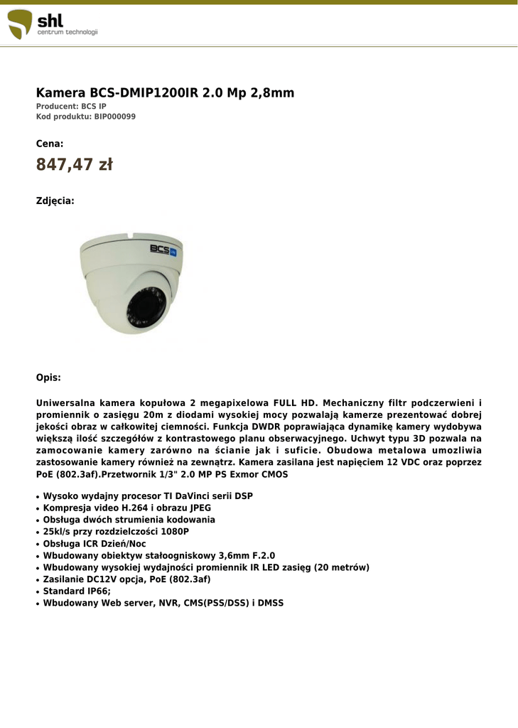 Kamera BCS-DMIP1200IR 2.0 Mp 2,8mm Producent: BCS IP Kod produktu: BIP000099 Cena: 847,47 zł Zdjęcia: Opis: Uniwersalna kamera kopułowa 2 megapixelowa FULL HD. Mechaniczny filtr podczerwieni i promiennik o zasięgu 20m z diodami wysokiej mocy pozwalają kamerze prezentować dobrej jekości obraz w całkowitej ciemności. Funkcja DWDR poprawiająca dynamikę kamery wydobywa większą ilość szczegółów z kontrastowego planu obserwacyjnego. Uchwyt typu 3D pozwala na zamocowanie kamery zarówno na ścianie jak i suficie. Obudowa metalowa umozliwia zastosowanie kamery również na zewnątrz. Kamera zasilana jest napięciem 12 VDC oraz poprzez PoE (802.3af).Przetwornik 1/3" 2.0 MP PS Exmor CMOS ● ● ● ● ● ● ● ● ● ● Wysoko wydajny procesor TI DaVinci serii DSP Kompresja video H.264 i obrazu JPEG Obsługa dwóch strumienia kodowania 25kl/s przy rozdzielczości 1080P Obsługa ICR Dzień/Noc Wbudowany obiektyw stałoogniskowy 3,6mm F.2.0 Wbudowany wysokiej wydajności promiennik IR LED zasięg (20 metrów) Zasilanie DC12V opcja, PoE (802.3af) Standard IP66; Wbudowany Web server, NVR, CMS(PSS/DSS) i DMSS