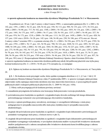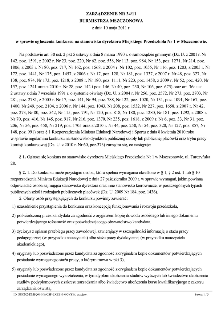 ZARZĄDZENIE NR 34/11 BURMISTRZA MSZCZONOWA z dnia 10 maja 2011 r. w sprawie ogłoszenia konkursu na stanowisko dyrektora Miejskiego Przedszkola Nr 1 w Mszczonowie. Na podstawie art. 30 ust. 2 pkt 5 ustawy z dnia 8 marca 1990 r. o samorządzie gminnym (Dz. U. z 2001 r. Nr 142, poz. 1591, z 2002 r. Nr 23, poz. 220, Nr 62, poz. 558, Nr 113, poz. 984, Nr 153, poz. 1271, Nr 214, poz. 1806, z 2003 r. Nr 80, poz. 717, Nr 162, poz. 1568, z 2004 r. Nr 102, poz. 1055, Nr 116, poz. 1203, z 2005 r. Nr 172, poz. 1441, Nr 175, poz. 1457, z 2006 r. Nr 17, poz. 128, Nr 181, poz. 1337, z 2007 r. Nr 48, poz. 327, Nr 138, poz. 974, Nr 173, poz. 1218, z 2008 r. Nr 180, poz. 1111, Nr 223, poz. 1458, z 2009 r. Nr 52, poz. 420, Nr 157, poz. 1241 oraz z 2010 r. Nr 28, poz. 142 i poz. 146, Nr 40, poz. 230, Nr 106, poz. 675) oraz art. 36a ust. 2 ustawy z dnia 7 września 1991 r. o systemie oświaty (Dz. U. z 2004 r. Nr 256, poz. 2572, Nr 273, poz. 2703, Nr 281, poz. 2781, z 2005 r. Nr 17, poz. 141, Nr 94, poz. 788, Nr 122, poz. 1020, Nr 131, poz. 1091, Nr 167, poz. 1400, Nr 249, poz. 2104, z 2006 r. Nr 144, poz. 1043, Nr 208, poz. 1532, Nr 227, poz. 1658, z 2007 r. Nr 42, poz. 273, Nr 80, poz. 542, Nr 115, poz. 791, Nr 120, poz. 818, Nr 180, poz. 1280, Nr 181, poz. 1292, z 2008 r. Nr 70, poz. 416, Nr 145, poz. 917, Nr 216, poz. 1370, Nr 235, poz. 1618, z 2009 r. Nr 6, poz. 33, Nr 31, poz. 206, Nr 56, poz. 458, Nr 219, poz. 1705 oraz z 2010 r. Nr 44, poz. 250, Nr 54, poz. 320, Nr 127, poz. 857, Nr 148, poz. 991) oraz § 1 Rozporządzenia Ministra Edukacji Narodowej i Sportu z dnia 8 kwietnia 2010 roku w sprawie regulaminu konkursu na stanowisko dyrektora publicznej szkoły lub publicznej placówki oraz trybu pracy komisji konkursowej (Dz. U. z 2010 r. Nr 60, poz.373) zarządza się, co następuje: § 1. Ogłasza się konkurs na stanowisko dyrektora Miejskiego Przedszkola Nr 1 w Mszczonowie, ul. Tarczyńska 28. § 2. 1. Do konkursu może przystąpić osoba, która spełnia wymagania określone w § 1, § 2 ust. 1 lub § 10 rozporządzenia Ministra Edukacji Narodowej z dnia 27 października 2009 r. w sprawie wymagań, jakim powinna odpowiadać osoba zajmująca stanowisko dyrektora oraz inne stanowisko kierownicze, w poszczególnych typach publicznych szkół i rodzajach publicznych placówek (Dz. U. 2009 Nr 184, poz. 1436). 2. Oferty osób przystępujących do konkursu powinny zawierać: 1) uzasadnienie przystąpienia do konkursu oraz koncepcję funkcjonowania i rozwoju przedszkola, 2) poświadczoną przez kandydata za zgodność z oryginałem kopię dowodu osobistego lub innego dokumentu potwierdzającego tożsamość oraz poświadczającego obywatelstwo kandydata, 3) życiorys z opisem przebiegu pracy zawodowej, zawierający w szczególności informację o stażu pracy pedagogicznej (w przypadku nauczyciela) albo stażu pracy dydaktycznej (w przypadku nauczyciela akademickiego), 4) oryginały lub poświadczone przez kandydata za zgodność z oryginałem kopie dokumentów potwierdzających posiadanie wymaganego stażu pracy, o którym mowa w pkt 3), 5) oryginały lub poświadczone przez kandydata za zgodność z oryginałem kopie dokumentów potwierdzających posiadanie wymaganego wykształcenia, w tym dyplom ukończenia studiów wyższych lub świadectwo ukończenia studiów podyplomowych z zakresu zarządzania albo świadectwo ukończenia kursu kwalifikacyjnego z zakresu zarządzania oświatą, ID: SUCNZ-DMSQM-HWCSP-LXEBH-MOVZW. przyjety. 6) zaświadczenie lekarskie o braku przeciwwskazań zdrowotnych do wykonywania pracy na stanowisku kierowniczym, Strona 1 / 3 7) oświadczenie, że przeciwko kandydatowi nie toczy się postępowanie karne, postępowanie dyscyplinarne lub studiów podyplomowych z zakresu zarządzania albo świadectwo ukończenia kursu kwalifikacyjnego z zakresu zarządzania oświatą, 6) zaświadczenie lekarskie o braku przeciwwskazań zdrowotnych do wykonywania pracy na stanowisku kierowniczym, 7) oświadczenie, że przeciwko kandydatowi nie toczy się postępowanie karne, postępowanie dyscyplinarne lub postępowanie o ubezwłasnowolnienie, 8) oświadczenie, że kandydat nie był skazany prawomocnym wyrokiem za umyślne przestępstwo lub umyślne przestępstwo skarbowe, 9) oświadczenie, że kandydat nie był karany zakazem pełnienia funkcji związanych z dysponowaniem środkami publicznymi, o którym mowa w art. 31 ust. 1 pkt 4 ustawy z dnia 17 grudnia 2004 r. o odpowiedzialności za naruszenie dyscypliny finansów publicznych (Dz. U. z 2005 r. Nr 14, poz. 114, z późn. zm.) lub w art. 147 ust. 1 pkt 4 ustawy z dnia 26 listopada 1998 r. o finansach publicznych (Dz. U. z 2003 r. Nr 15, poz. 148, z późn. zm.), 10) oświadczenie o dopełnieniu obowiązku, o którym mowa w art. 7 ust. 1 i ust. 3a ustawy z dnia 18 października 2006 r. o ujawnianiu informacji o dokumentach organów bezpieczeństwa państwa z lat 1944-1990 oraz treści tych dokumentów (Dz. U. z 2007 r. Nr 63, poz. 425, z późn. zm.), 11) oryginał lub poświadczoną przez kandydata za zgodność z oryginałem kopię aktu nadania stopnia nauczyciela mianowanego lub dyplomowanego – w przypadku nauczyciela, 12) oryginał lub poświadczoną przez kandydata za zgodność z oryginałem kopię karty oceny pracy lub oceny dorobku zawodowego – w przypadku nauczyciela i nauczyciela akademickiego, 13) oświadczenie, że kandydat nie był karany karą dyscyplinarną, o której mowa w art. 76 ust. 1 ustawy z dnia 26 stycznia 1982 r. – Karta Nauczyciela (Dz. U. z 2006 r. Nr 97, poz. 674, z późn. zm.6)) lub w art. 140 ust. 1 ustawy z dnia 27 lipca 2005 r. - Prawo o szkolnictwie wyższym (Dz. U. Nr 164, poz. 1365, z późn. zm.) – w przypadku nauczyciela i nauczyciela akademickiego, 14) oświadczenie, że kandydat wyraża zgodę na przetwarzanie danych osobowych zgodnie z ustawą z dnia 29 sierpnia 1997 r. o ochronie danych osobowych (Dz. U. z 2002 r. Nr 101, poz. 926, z późn. zm.) w celach przeprowadzenia konkursu na stanowisko 
