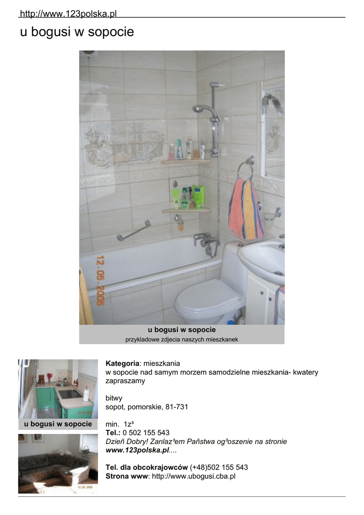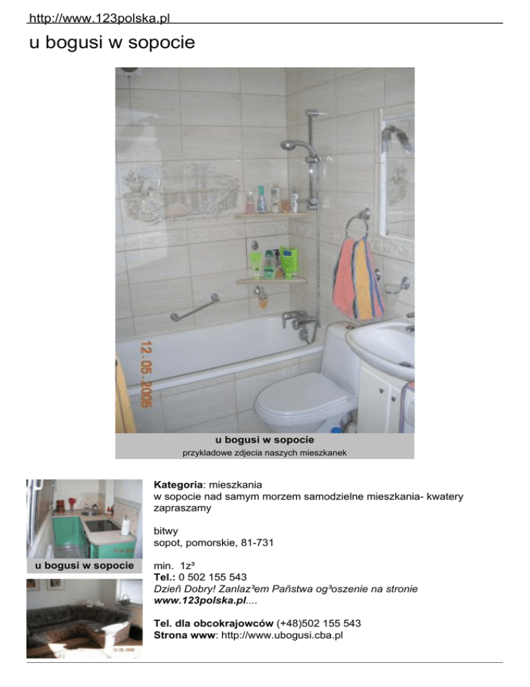 http://www.123polska.pl u bogusi w sopocie u bogusi w sopocie przykladowe zdjecia naszych mieszkanek Kategoria: mieszkania w sopocie nad samym morzem samodzielne mieszkania- kwatery zapraszamy bitwy sopot, pomorskie, 81-731 u bogusi w sopocie min. 1z³ Tel.: 0 502 155 543 Dzieñ Dobry! Zanlaz³em Pañstwa og³oszenie na stronie www.123polska.pl.... Tel. dla obcokrajowców (+48)502 155 543 Strona www: http://www.ubogusi.cba.pl http://www.123polska.pl u bogusi w sopocie • Nad morzem Rabaty/Promocje: np. Uwaga! Przy rezerwacji 2 miesi±ce wcze¶niej: 25 % rabatu ! Obiekt: sezonowy Pe³en opis obiektu Sopot - 100 metrow od plazy !!!Luksusowe apartamenty, mieszkania 1,2,3 pokojowe w dolnym Sopocie nad samym morzem. Nowocze¶nie umeblowane i wyposa¿one kwatery. W pokojach telewizory. Kuchnie wyposa¿one w nowoczesny sprzêt gospodarstwa domowego. £azienki zaopatrzone w sanitariaty.W ofercie równie¿ pokoje go¶cinne nad samym morzem.Informacja i rezerwacja miejsc tylko pod nr tel. 0 502 155 543http://www.ubogusi.cba.pl Oferowane pokoje: Cena za ca³o¶æ: Cena za dobê (za ca³o¶æ): 100 z³ Cennik: inne np. od 25.12 do 2.01 - +20% od 23.06 do 31.08 - -5% dla studentów Mo¿liwo¶æ wykupienia obiadów w cenie 12z³/os...; ceny do negocjacji; cena za ca³y domek 200z³/db; cena za ³ó¿ko dostawiane 30z³; sylwester +20%, ..., Za basen symboliczna op³ata... Opis otoczenia np. O¶rodek le¿y w przepiêknie po³o¿onej dolinie....., tu¿ nad potokiem..... Z tarasu widaæ szczyty gór..., które szczególnie piêknie prezentuj± siê w blasku zachodz±cego s³oñca. Bezpo¶rednie s±siedztwo jeziora sprawia, ¿e powietrze latem jest..... Atrakcje turystyczne: np. 2 km do Jaskini Jana, ruiny zamku XIII w., gor±ce ¬ród³a Czarne, itd. Dojazd: np. szczegó³y na stronie internetowej np. Jad±c tras± z ... do ..., ok. 30 km od ....., skrêæ w lewo w stronê wsi ... . Po przejechaniu 1,5km w±sk± szos± skrêæ ponownie w lewo na brukowana drogê, która nale¿y przejechaæ kolejne 1,5km do skraju lasu, n W pobli¿u: do sklepu: 0.1 km