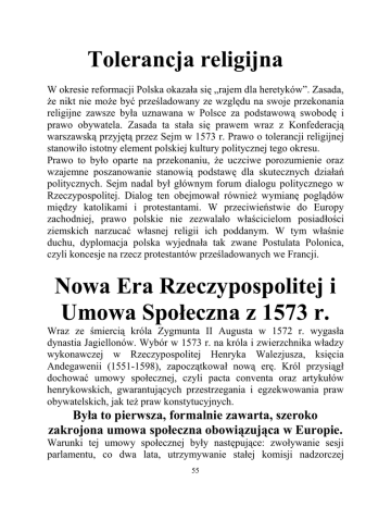 Tolerancja religijna W okresie reformacji Polska okazała się „rajem dla heretyków”. Zasada, że nikt nie może być prześladowany ze względu na swoje przekonania religijne zawsze była uznawana w Polsce za podstawową swobodę i prawo obywatela. Zasada ta stała się prawem wraz z Konfederacją warszawską przyjętą przez Sejm w 1573 r. Prawo o tolerancji religijnej stanowiło istotny element polskiej kultury politycznej tego okresu. Prawo to było oparte na przekonaniu, że uczciwe porozumienie oraz wzajemne poszanowanie stanowią podstawę dla skutecznych działań politycznych. Sejm nadal był głównym forum dialogu politycznego w Rzeczypospolitej. Dialog ten obejmował również wymianę poglądów między katolikami i protestantami. W przeciwieństwie do Europy zachodniej, prawo polskie nie zezwalało właścicielom posiadłości ziemskich narzucać własnej religii ich poddanym. W tym właśnie duchu, dyplomacja polska wyjednała tak zwane Postulata Polonica, czyli koncesje na rzecz protestantów prześladowanych we Francji. Nowa Era Rzeczypospolitej i Umowa Społeczna z 1573 r. Wraz ze śmiercią króla Zygmunta II Augusta w 1572 r. wygasła dynastia Jagiellonów. Wybór w 1573 r. na króla i zwierzchnika władzy wykonawczej w Rzeczypospolitej Henryka Walezjusza, księcia Andegawenii (1551-1598), zapoczątkował nową erę. Król przysiągł dochować umowy społecznej, czyli pacta conventa oraz artykułów henrykowskich, gwarantujących przestrzegania i egzekwowania praw obywatelskich, jak też praw konstytucyjnych. Była to pierwsza, formalnie zawarta, szeroko zakrojona umowa społeczna obowiązująca w Europie. Warunki tej umowy społecznej były następujące: zwoływanie sesji parlamentu, co dwa lata, utrzymywanie stałej komisji nadzorczej 55