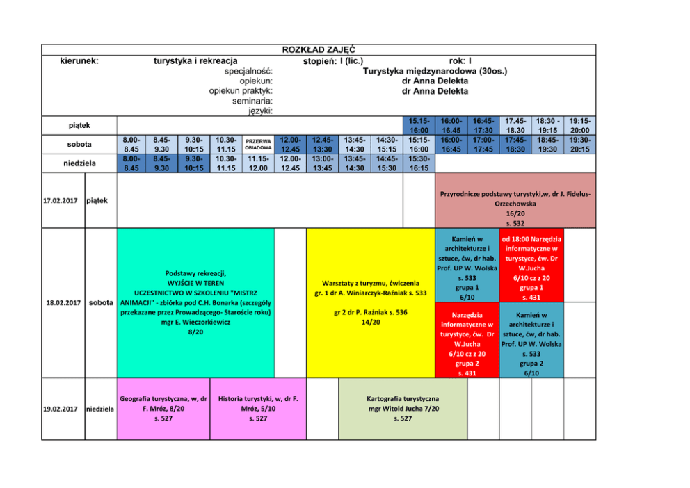 kierunek: turystyka i rekreacja specjalność: opiekun: opiekun praktyk: seminaria: języki: ROZKŁAD ZAJĘĆ rok: I stopień: I (lic.) Turystyka międzynarodowa (30os.) dr Anna Delekta dr Anna Delekta piątek sobota niedziela 17.02.2017 18.02.2017 19.02.2017 8.008.45 8.008.45 8.459.30 8.459.30 9.3010:15 9.3010:15 10.3011.15 10.3011.15 PRZERWA OBIADOWA 11.1512.00 12.0012.45 12.0012.45 12.4513:30 13:0013:45 13:4514:30 13:4514:30 14:3015:15 14:4515:30 15.1516:00 15:1516:00 15:3016:15 16:0016.45 16:0016:45 17.4518.30 17:4518:30 18:30 19:15 18:4519:30 19:1520:00 19:3020:15 Przyrodnicze podstawy turystyki,w, dr J. FidelusOrzechowska 16/20 s. 532 piątek Podstawy rekreacji, WYJŚCIE W TEREN UCZESTNICTWO W SZKOLENIU "MISTRZ sobota ANIMACJI" - zbiórka pod C.H. Bonarka (szczegóły przekazane przez Prowadzącego- Staroście roku) mgr E. Wieczorkiewicz 8/20 niedziela 16:4517:30 17:0017:45 Geografia turystyczna, w, dr F. Mróz, 8/20 s. 527 Historia turystyki, w, dr F. Mróz, 5/10 s. 527 Warsztaty z turyzmu, ćwiczenia gr. 1 dr A. Winiarczyk-Raźniak s. 533 Kamień w od 18:00 Narzędzia architekturze i informatyczne w sztuce, ćw, dr hab. turystyce, ćw. Dr Prof. UP W. Wolska W.Jucha s. 533 6/10 cz z 20 grupa 1 grupa 1 6/10 s. 431 gr 2 dr P. Raźniak s. 536 14/20 Kartografia turystyczna mgr Witold Jucha 7/20 s. 527 Narzędzia Kamień w informatyczne w architekturze i turystyce, ćw. Dr sztuce, ćw, dr hab. W.Jucha Prof. UP W. Wolska 6/10 cz z 20 s. 533 grupa 2 grupa 2 s. 431 6/10