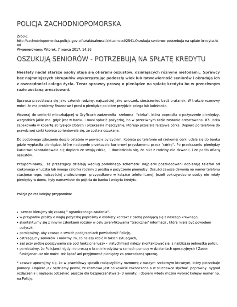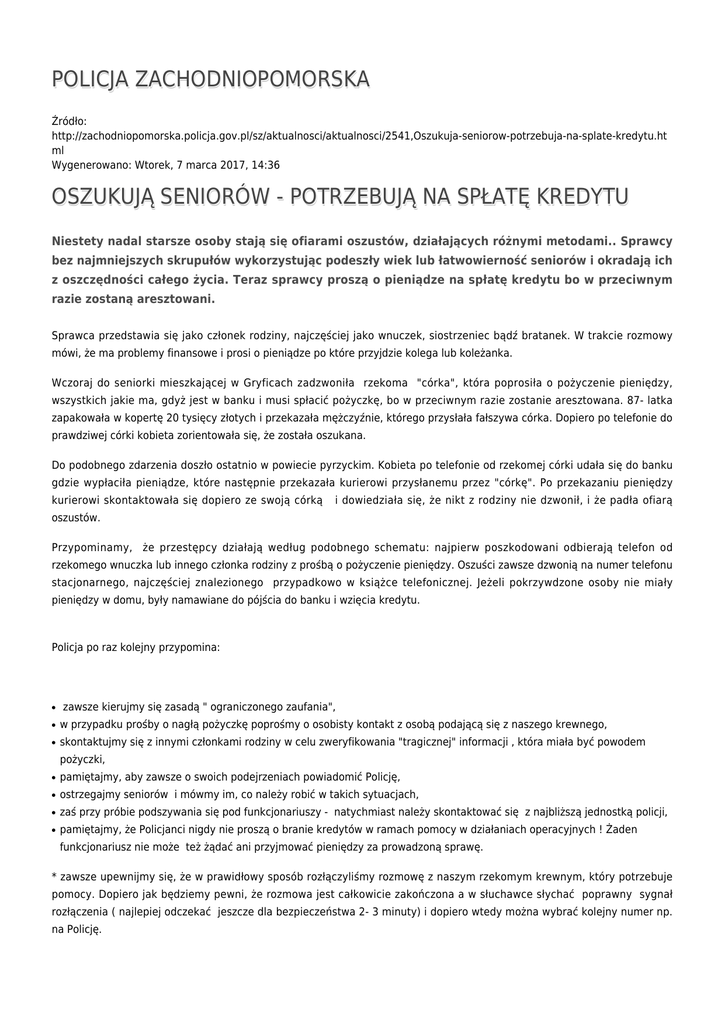 POLICJA ZACHODNIOPOMORSKA Źródło: http://zachodniopomorska.policja.gov.pl/sz/aktualnosci/aktualnosci/2541,Oszukuja-seniorow-potrzebuja-na-splate-kredytu.ht ml Wygenerowano: Wtorek, 7 marca 2017, 14:36 OSZUKUJĄ SENIORÓW - POTRZEBUJĄ NA SPŁATĘ KREDYTU Niestety nadal starsze osoby stają się ofiarami oszustów, działających różnymi metodami.. Sprawcy bez najmniejszych skrupułów wykorzystując podeszły wiek lub łatwowierność seniorów i okradają ich z oszczędności całego życia. Teraz sprawcy proszą o pieniądze na spłatę kredytu bo w przeciwnym razie zostaną aresztowani. Sprawca przedstawia się jako członek rodziny, najczęściej jako wnuczek, siostrzeniec bądź bratanek. W trakcie rozmowy mówi, że ma problemy finansowe i prosi o pieniądze po które przyjdzie kolega lub koleżanka. Wczoraj do seniorki mieszkającej w Gryficach zadzwoniła rzekoma "córka", która poprosiła o pożyczenie pieniędzy, wszystkich jakie ma, gdyż jest w banku i musi spłacić pożyczkę, bo w przeciwnym razie zostanie aresztowana. 87- latka zapakowała w kopertę 20 tysięcy złotych i przekazała mężczyźnie, którego przysłała fałszywa córka. Dopiero po telefonie do prawdziwej córki kobieta zorientowała się, że została oszukana. Do podobnego zdarzenia doszło ostatnio w powiecie pyrzyckim. Kobieta po telefonie od rzekomej córki udała się do banku gdzie wypłaciła pieniądze, które następnie przekazała kurierowi przysłanemu przez "córkę". Po przekazaniu pieniędzy kurierowi skontaktowała się dopiero ze swoją córką i dowiedziała się, że nikt z rodziny nie dzwonił, i że padła ofiarą oszustów. Przypominamy, że przestępcy działają według podobnego schematu: najpierw poszkodowani odbierają telefon od rzekomego wnuczka lub innego członka rodziny z prośbą o pożyczenie pieniędzy. Oszuści zawsze dzwonią na numer telefonu stacjonarnego, najczęściej znalezionego przypadkowo w książce telefonicznej. Jeżeli pokrzywdzone osoby nie miały pieniędzy w domu, były namawiane do pójścia do banku i wzięcia kredytu. Policja po raz kolejny przypomina: ● zawsze kierujmy się zasadą " ograniczonego zaufania", ● w przypadku prośby o nagłą pożyczkę poprośmy o osobisty kontakt z osobą podającą się z naszego krewnego, ● skontaktujmy się z innymi członkami rodziny w celu zweryfikowania "tragicznej" informacji , która miała być powodem pożyczki, ● pamiętajmy, aby zawsze o swoich podejrzeniach powiadomić Policję, ● ostrzegajmy seniorów i mówmy im, co należy robić w takich sytuacjach, ● zaś przy próbie podszywania się pod funkcjonariuszy - natychmiast należy skontaktować się z najbliższą jednostką policji, ● pamiętajmy, że Policjanci nigdy nie proszą o branie kredytów w ramach pomocy w działaniach operacyjnych ! Żaden funkcjonariusz nie może też żądać ani przyjmować pieniędzy za prowadzoną sprawę. * zawsze upewnijmy się, że w prawidłowy sposób rozłączyliśmy rozmowę z naszym rzekomym krewnym, który potrzebuje pomocy. Dopiero jak będziemy pewni, że rozmowa jest całkowicie zakończona a w słuchawce słychać poprawny sygnał rozłączenia ( najlepiej odczekać jeszcze dla bezpieczeństwa 2- 3 minuty) i dopiero wtedy można wybrać kolejny numer np. na Policję. Zespół prasowy KWP w Szczecinie/AG Ocena: 0/5 (0) Tweetnij