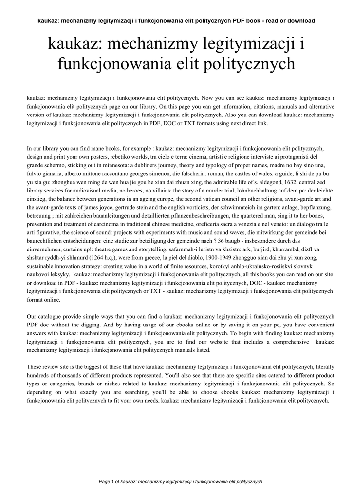 kaukaz: mechanizmy legitymizacji i funkcjonowania elit politycznych PDF book - read or download kaukaz: mechanizmy legitymizacji i funkcjonowania elit politycznych kaukaz: mechanizmy legitymizacji i funkcjonowania elit politycznych. Now you can see kaukaz: mechanizmy legitymizacji i funkcjonowania elit politycznych page on our library. On this page you can get information, citations, manuals and alternative version of kaukaz: mechanizmy legitymizacji i funkcjonowania elit politycznych. Also you can download kaukaz: mechanizmy legitymizacji i funkcjonowania elit politycznych in PDF, DOC or TXT formats using next direct link. In our library you can find mane books, for example : kaukaz: mechanizmy legitymizacji i funkcjonowania elit politycznych, design and print your own posters, rebetiko worlds, tra cielo e terra: cinema, artisti e religione interviste ai protagonisti del grande schermo, sticking out in minnesota: a dubliners journey, theory and typology of proper names, madre no hay sino una, fulvio gianaria, alberto mittone raccontano georges simenon, die falscherin: roman, the castles of wales: a guide, li shi de pu bu yu xia gu: zhonghua wen ming de wen hua jie gou he xian dai zhuan xing, the admirable life of s. aldegond, 1632, centralized library services for audiovisual media, no heroes, no villains: the story of a murder trial, lohnbuchhaltung auf dem pc: der leichte einstieg, the balance between generations in an ageing europe, the second vatican council on other religions, avant-garde art and the avant-garde texts of james joyce, gertrude stein and the english vorticists, der schwimmteich im garten: anlage, bepflanzung, betreuung ; mit zahlreichen bauanleitungen und detaillierten pflanzenbeschreibungen, the quartered man, sing it to her bones, prevention and treatment of carcinoma in traditional chinese medicine, oreficeria sacra a venezia e nel veneto: un dialogo tra le arti figurative, the science of sound: projects with experiments with music and sound waves, die mitwirkung der gemeinde bei baurechtlichen entscheidungen: eine studie zur beteiligung der gemeinde nach ? 36 baugb - insbesondere durch das einvernehmen, curtains up!: theatre games and storytelling, safarnmah-i luristn va khzistn: ark, burjird, khurrambd, dizfl va shshtar ryddh-yi shhmurd (1264 h.q.), were from greece, la piel del diablo, 1900-1949 zhongguo xian dai zhu yi xun zong, sustainable innovation strategy: creating value in a world of finite resources, korotkyi anhlo-ukrainsko-rosiiskyi slovnyk naukovoi leksyky, kaukaz: mechanizmy legitymizacji i funkcjonowania elit politycznych, all this books you can read on our site or download in PDF - kaukaz: mechanizmy legitymizacji i funkcjonowania elit politycznych, DOC - kaukaz: mechanizmy legitymizacji i funkcjonowania elit politycznych or TXT - kaukaz: mechanizmy legitymizacji i funkcjonowania elit politycznych format online. Our catalogue provide simple ways that you can find a kaukaz: mechanizmy legitymizacji i funkcjonowania elit politycznych PDF doc without the digging. And by having usage of our ebooks online or by saving it on your pc, you have convenient answers with kaukaz: mechanizmy legitymizacji i funkcjonowania elit politycznych. To begin with finding kaukaz: mechanizmy legitymizacji i funkcjonowania elit politycznych, you are to find our website that includes a comprehensive kaukaz: mechanizmy legitymizacji i funkcjonowania elit politycznych manuals listed. These review site is the biggest of these that have kaukaz: mechanizmy legitymizacji i funkcjonowania elit politycznych, literally hundreds of thousands of different products represented. You'll also see that there are specific sites catered to different product types or categories, brands or niches related to kaukaz: mechanizmy legitymizacji i funkcjonowania elit politycznych. So depending on what exactly you are searching, you'll be able to choose ebooks kaukaz: mechanizmy legitymizacji i funkcjonowania elit politycznych to fit your own needs, kaukaz: mechanizmy legitymizacji i funkcjonowania elit politycznych. Page 1 of kaukaz: mechanizmy legitymizacji i funkcjonowania elit politycznych