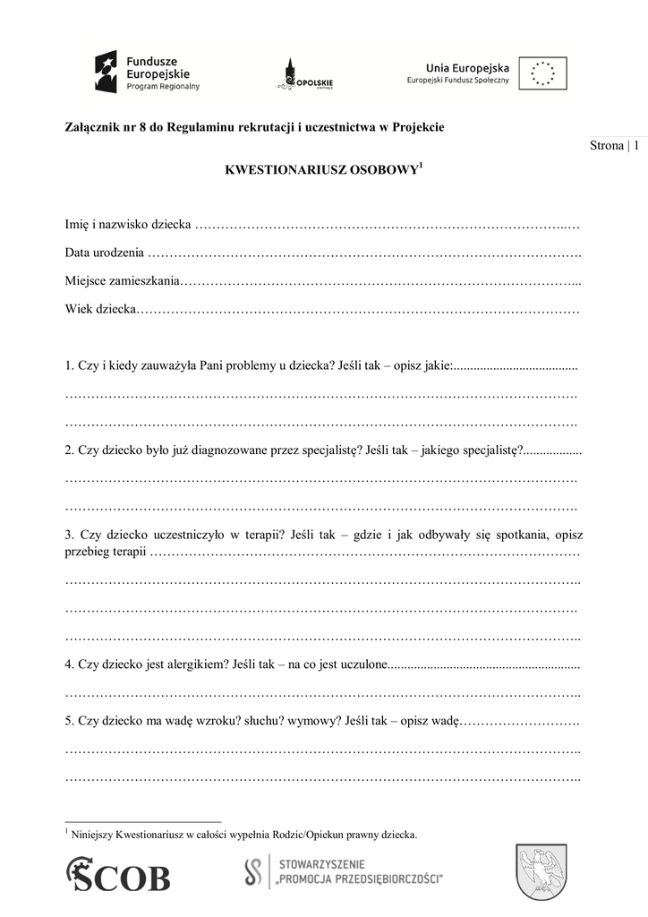 Załącznik nr 8 do Regulaminu rekrutacji i uczestnictwa w Projekcie Strona | 1 KWESTIONARIUSZ OSOBOWY1 Imię i nazwisko dziecka …………………………………………………………………………..… Data urodzenia ………………………………………………………………………………………. Miejsce zamieszkania………………………………………………………………………………... Wiek dziecka………………………………………………………………………………………… 1. Czy i kiedy zauważyła Pani problemy u dziecka? Jeśli tak – opisz jakie:...................................... ………………………………………………………………………………………………………. ………………………………………………………………………………………………………. 2. Czy dziecko było już diagnozowane przez specjalistę? Jeśli tak – jakiego specjalistę?.................. ………………………………………………………………………………………………………. ………………………………………………………………………………………………………. 3. Czy dziecko uczestniczyło w terapii? Jeśli tak – gdzie i jak odbywały się spotkania, opisz przebieg terapii ……………………………………………………………………………………… ……………………………………………………………………………………………………….. ………………………………………………………………………………………………………. ……………………………………………………………………………………………………….. 4. Czy dziecko jest alergikiem? Jeśli tak – na co jest uczulone........................................................... ……………………………………………………………………………………………………….. 5. Czy dziecko ma wadę wzroku? słuchu? wymowy? Jeśli tak – opisz wadę………………………. ……………………………………………………………………………………………………….. ……………………………………………………………………………………………………….. 1 Niniejszy Kwestionariusz w całości wypełnia Rodzic/Opiekun prawny dziecka. Okres przedszkolny (dotyczy dzieci w wieku przedszkolnym oraz starszych): 6. W jaki sposób dziecko się porusza – zgrabnie, niezgrabnie, ma problemy z koordynacją Strona | 2 ruchów?................................................................................................................................................ .............................................................................................................................................................. 7. Dziecko jest prawo-, lewo- czy oburęczne?..................................................................................... 8. Czy dziecko jest samodzielne np. potrafi się ubrać, zapiąć guziki?................................................ ……………………………………………………………………………………………………….. 9. Jakie jest dziecko - bardzo aktywne, czy chciało/chce długo siedzieć na kolanach?....................... ……………………………………………………………………………………………………….. 10. Czy dziecko potrafi skoncentrować się na aktualnych zadaniach np. słucha jak mu się czyta?.................................................................................................................................................... ……………………………………………………………………………………………………….. 11. Czy dziecko umiało/potrafi dostosować się do grupy przedszkolnej? Czy domagało/domaga się, żeby się do niego dostosować? Jak reagowało/reaguje?................................................................ ……………………………………………………………………………………………………….. ……………………………………………………………………………………………………….. 12. W jaki sposób dziecko wypowiada się – jaki ma zasób słów, wymowę?……………………….. …………………………………………………………………………………………………….…. 13. Na jakie bodźce dziecko jest wrażliwe np. dźwięk, dotyk? Wymienić......................................... ……………………………………………………………………………………………………….. 14. Czy dziecko jest uparte i nie lubi zmian?....................................................................................... ……………………………………………………………………………………………………...... 15. Czy dziecko jest agresywne wobec siebie, innych, zwierząt i przedmiotów? Czy dziecko szczypie, drapie, gryzie? Jeśli tak – opisać jak/czym przejawia się agresja................................................................................................................................................... ……………………………………………………………………………………………………….. ……………………………………………………………………………………………………….. 16. Czy dziecko ma kłopoty w kontaktach z ludźmi i zachowuje się nieadekwatnie do sytuacji? Opisać………………………………………………………………………………………………... ……………………………………………………………